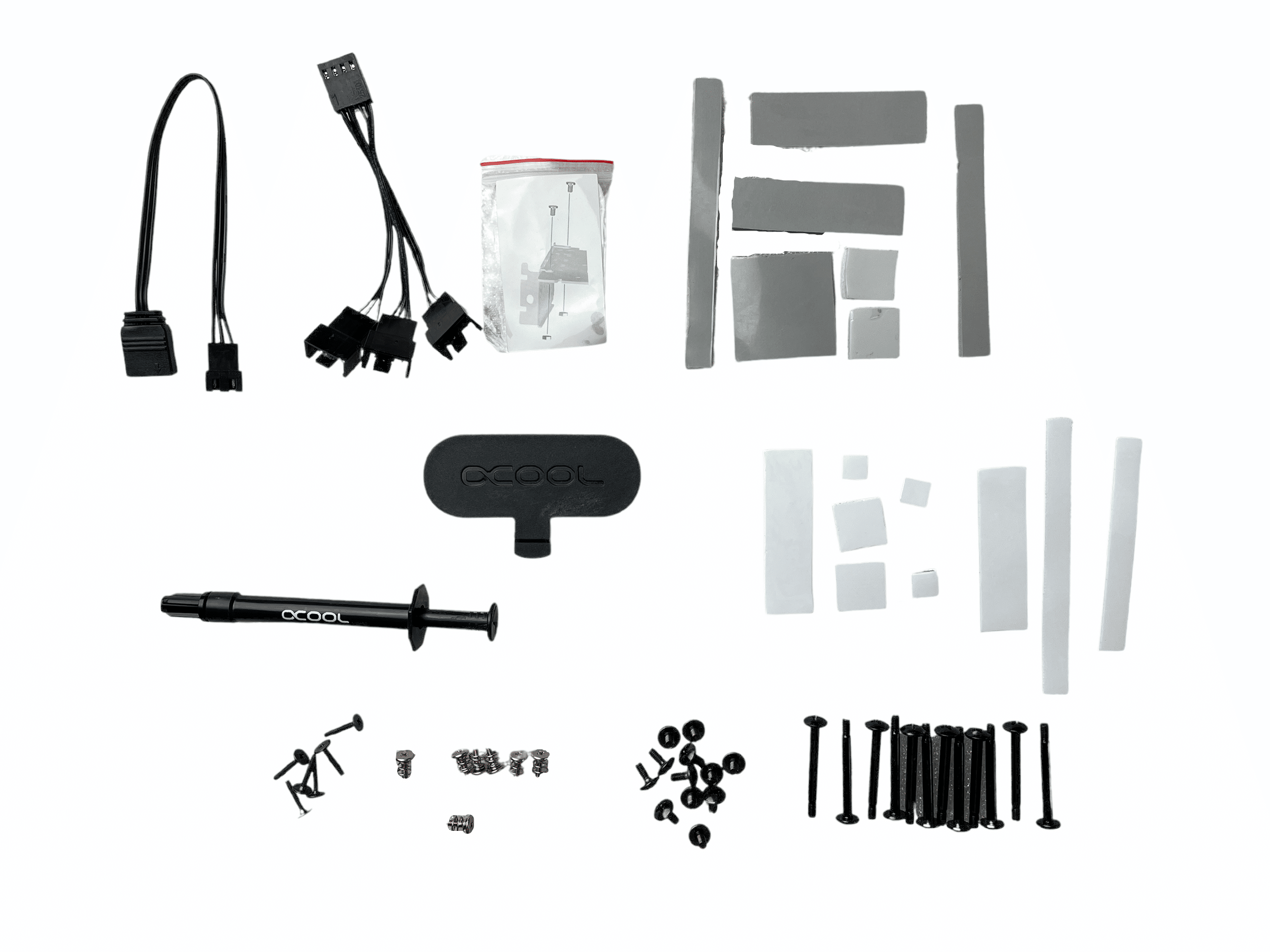 Geliefert wird die Eiswolf 2, wie man es von AiO-Wasserkühlungen kennt. Kühlkörper und Radiator sind mit zwei Schläuchen miteinander verbunden. Lediglich die Lüfter müssen noch auf dem Radiator montiert werden. Neben der Wasserkühlung selbst liegen diverse Schrauben für die Montage auf der entsprechenden GPU dabei. Auch an Kühlpads, die für den Umbau benötigt werden, wurde gedacht. Diese sind bereits zurechtgeschnitten und müssen nur noch auf die dafür vorgesehenen Plätze geklebt werden. Unterscheiden lassen sich die Pads in der Dicke, die für die Backplate sind 3 mm dick und die Pads für den Kühler messen lediglich 1 mm in der Dicke. Neben den Kühlpads liegt zusätzlich eine Wärmleitpaste dabei, welche für den Grafikprozessor benötigt wird.