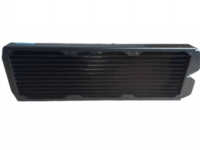Bei dem Radiator setzt Alphacool auf eine Ausführung aus der NexXxos-Reihe, welche fast gänzlich aus Kupfer gefertigt wurde. Dabei ist lediglich das Außengehäuse aus rostfreiem Stahl gefertigt und Kühlfinnen, Vorkammern sowie Kühlkanäle sind aus Kupfer. Das verspricht eine hervorragende Wärmeleitfähigkeit und trägt maßgeblich zur Kühlleistung bei. Auf dem Gehäuse des Radiators befinden sich Verschraubungspunkte für bis zu sechs Lüfter. Insgesamt bietet der 360-mm-Radiator Platz für drei 120-mm-Lüfter pro Seite.