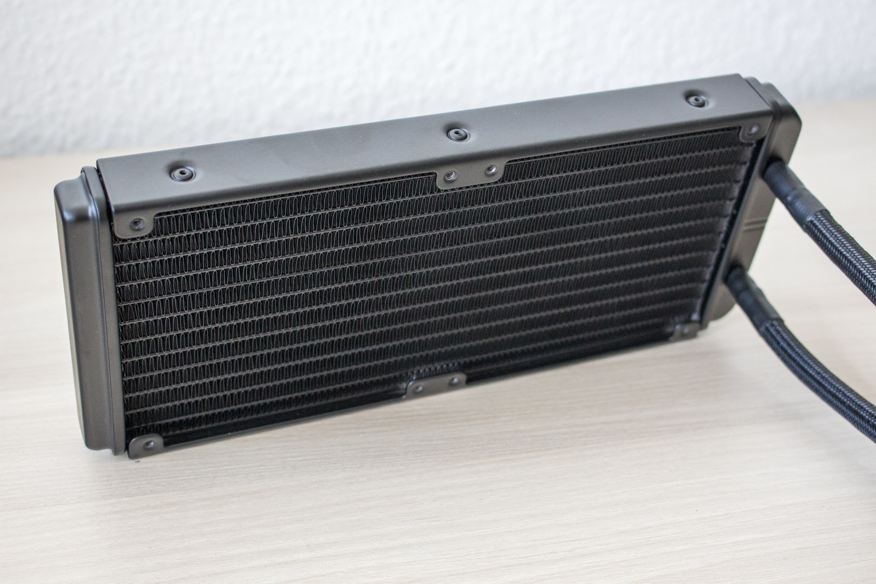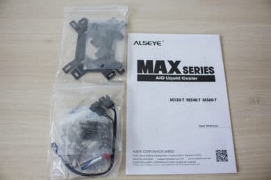 Optisch ist die MAX 240 schlicht gehalten und der Hersteller verzichtet zugunsten eines günstigeren Preises auf sämtliche RGB-Effekte oder digitale Displays. Der aus Aluminium gefertigte Radiator ist komplett schwarz lackiert und 27 Millimeter dick. Dieser Wert entspricht der Dicke vieler handelsüblicher Kompaktwasserkühlungen. ALSEYE macht zwar keine genaueren Angaben, die Vermutung liegt aber nahe, dass die M240-T auf dem Standard-Design von Asetek aufgebaut wurde.