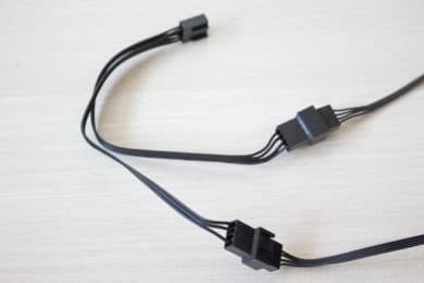 Die mitgelieferten Lüfter sind aus schwarzem Kunststoff gefertigt und haben einen Drehzahlbereich zwischen 600 und 1800 Umdrehungen pro Minute. Der Anschluss der unüblich geformten Lüfter erfolgt mittels 4-Pin-Header am Mainboard. Im Zubehör liegt zudem ein PWM-Splitter mit dem beide Lüfter an einem Mainboard-Header angeschlossen werden können.