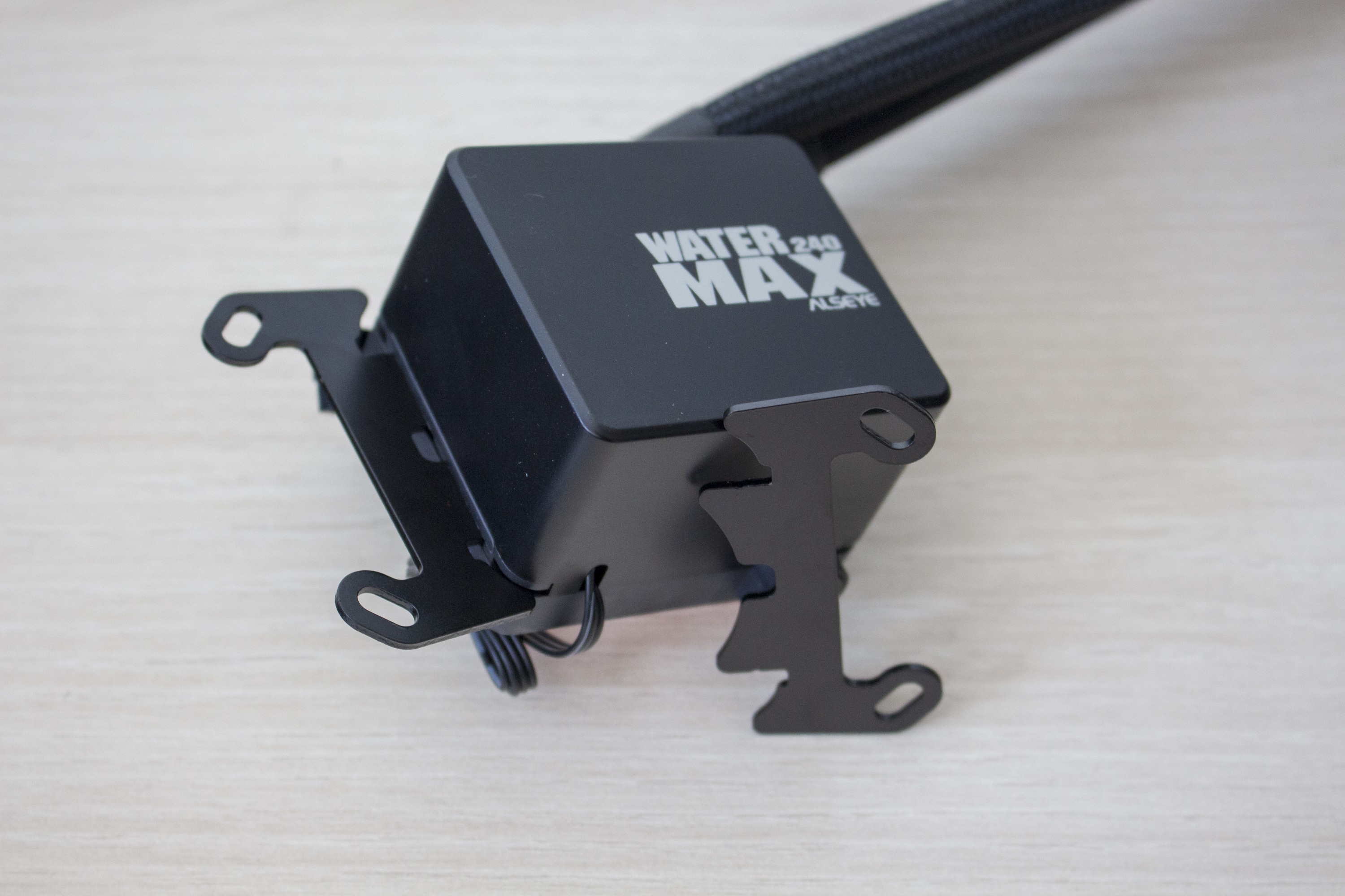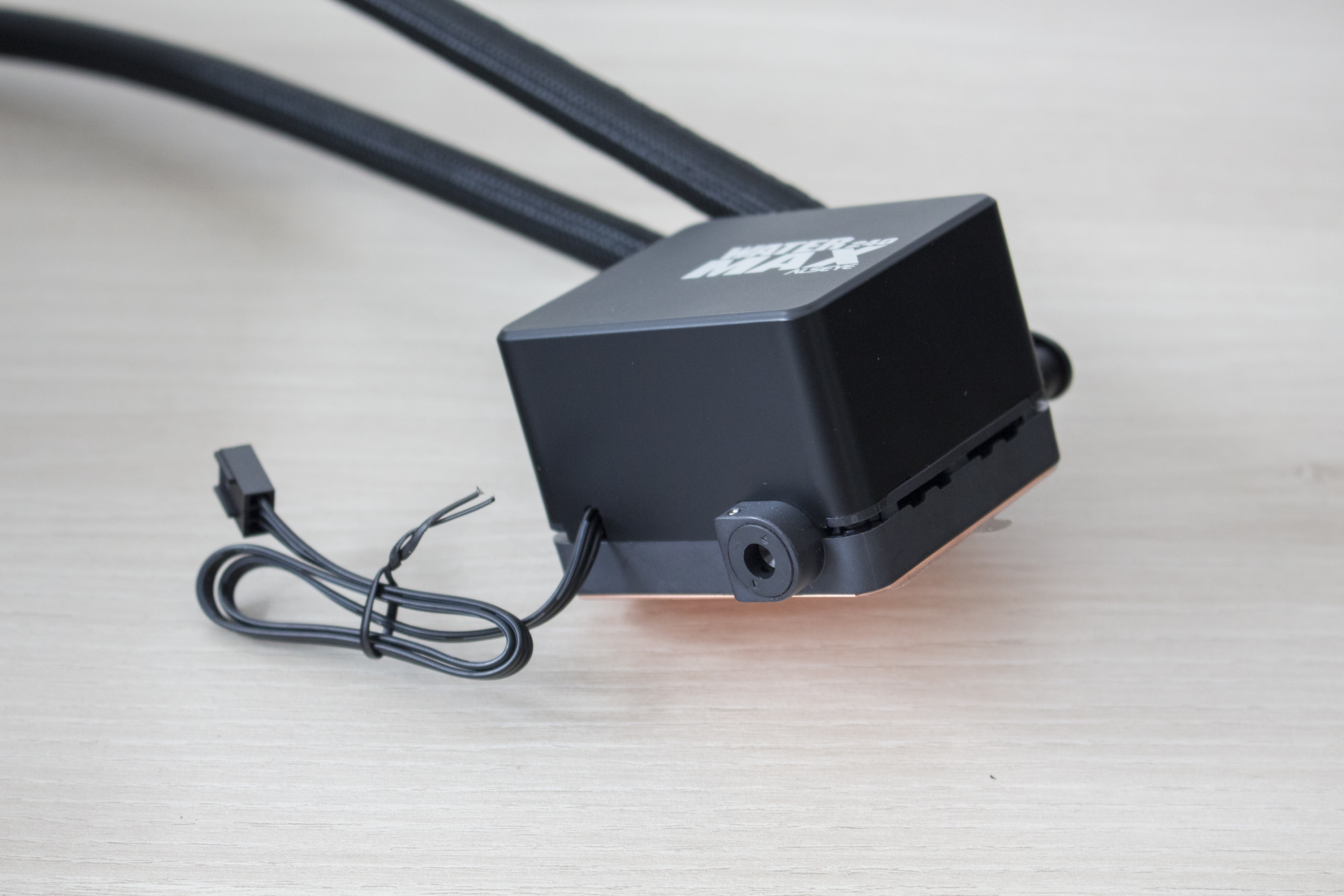 Die Wasserschläuche sind circa 330 Millimeter lang, von einem feinen schwarzen Sleeve umhüllt und enden am Pumpenblock an zwei beweglichen Gelenken. Durch deren Beweglichkeit können sowohl der Pumpenblock als auch der Radiator an verschiedensten Positionen positioniert werden. Die Verbindung zwischen Schlauch und Radiator bzw. Pumpe wird über einfache Schrumpfschläuche gesichert. Der Pumpenblock selber ist von einem schwarzen Kunststoff umhüllt und schlicht gestaltet. Lediglich eine Typenbezeichnung ist auf der Oberseite aufgedruckt. Die dort eingebaute Pumpe mit Keramik-Lager dreht mit maximal 2600 Umdrehungen pro Minute und wird mit einem 3-Pin-Stecker angeschlossen.