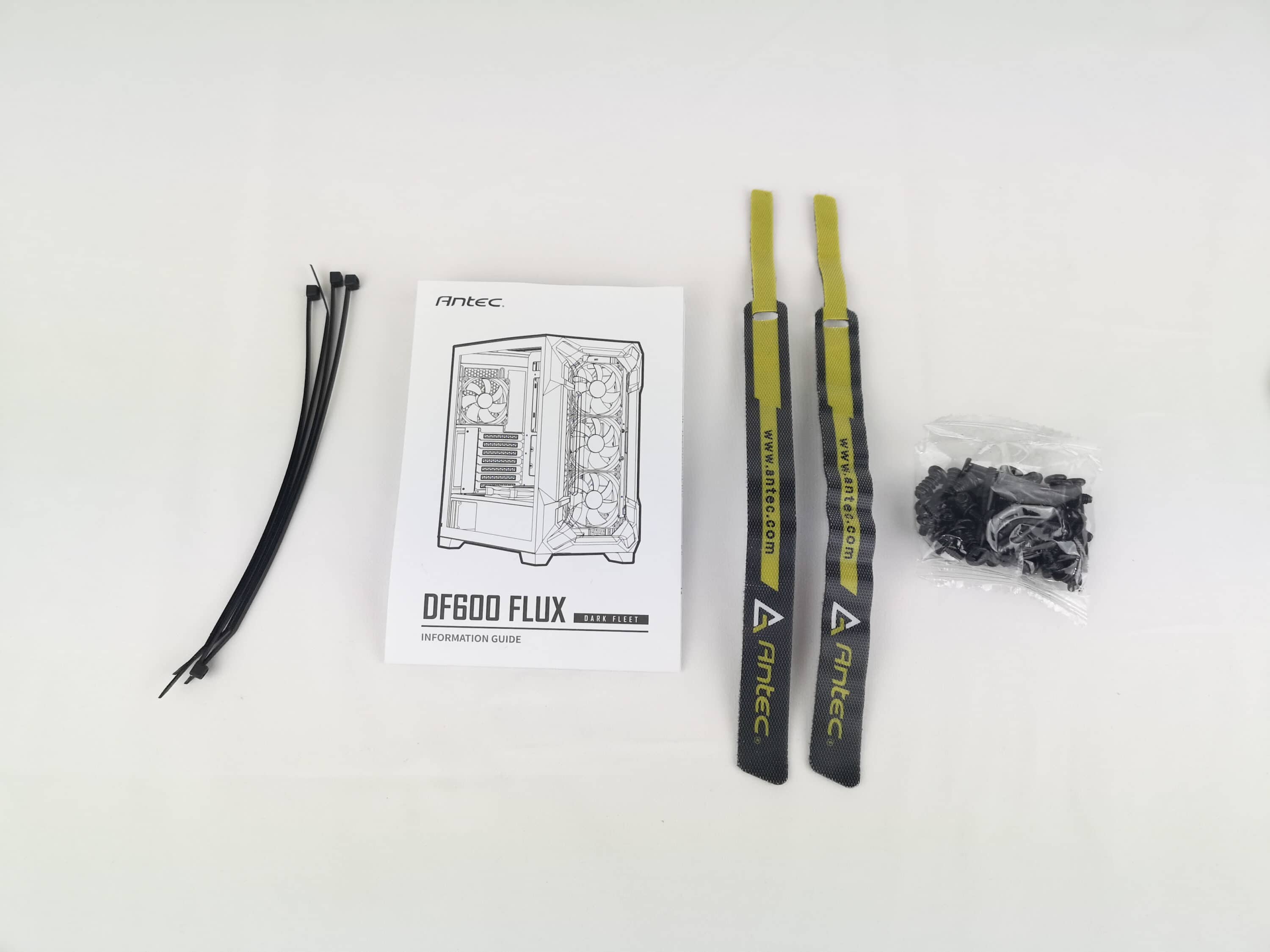 Neben den vier bereits im Gehäuse vorinstallierten Lüfter (davon drei beleuchtet), liegt noch ein weiterer Lüfter für die Montage auf dem PSU-Cover bei. Bei dem extra Lüfter wurden die Blätter verkehrt herum angebracht, so dass dieser mit der Vorderseite nach oben eingebaut werden kann und trotzdem Luft in das Gehäuse bläst. Außerdem wird noch ein weiteres kleines Päckchen mitgegeben, welches sich im HDD-Käfig versteckt. Darin enthalten ist die Einbauanleitung, mehrere Kabelbinder, zwei Klettkabelbinder mit einem Antec Aufdruck und diverse Schrauben, welche alle in einer Tüte verpackt sind.