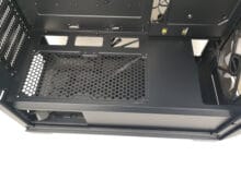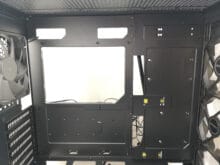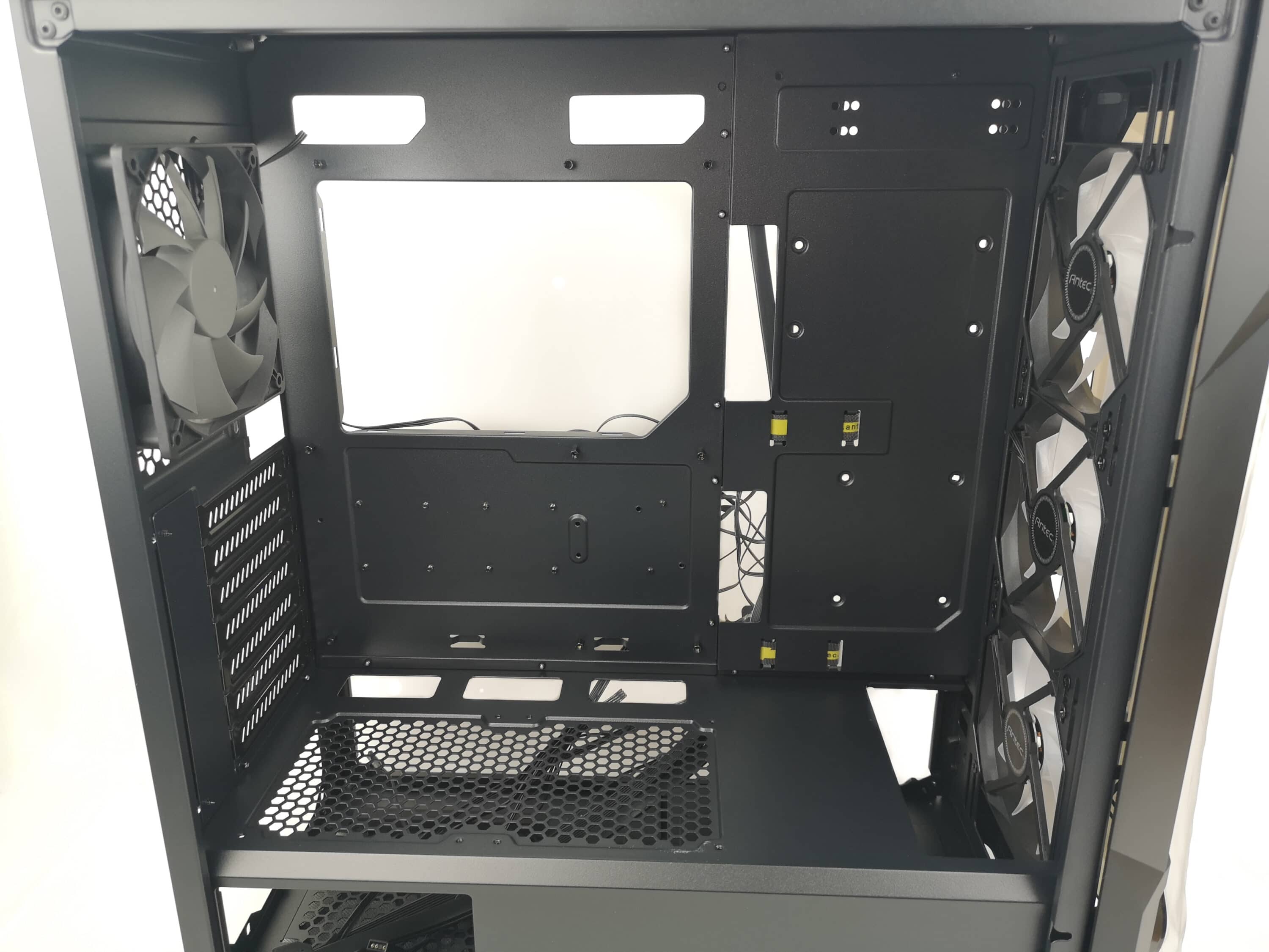 Der Innenraum ist sehr übersichtlich gestaltet und in schlichtem Schwarz gehalten. Im Heck befindet sich der vierte bereits vorinstallierte Lüfter, welcher leider nicht beleuchtet ist. Die Netzteilabdeckung bietet genügend Aussparungen für jegliche Anschlüsse am unteren Rand des Mainboards. Die Kabeldurchführung gestaltet sich dadurch sehr einfach, was uns gut gefallen hat. Außerdem hat die Netzteilabdeckung zwei Aussparungen. Einmal am unteren linken Rand, um einen Einblick auf das Netzteil zu haben und die zweite Aussparung befindet sich vor den vorderen Lüftern. Dadurch bietet sich die Möglichkeit, einen Radiator mit einer Länge bis 360 mm zu verbauen. Entscheidet man sich dazu, einen Radiator in der Front zu verbauen, muss man leider auf das Staubgitter verzichten. Dieses ist nämlich von innen mit Magneten angebracht und die Montagelöcher werden verdeckt.
