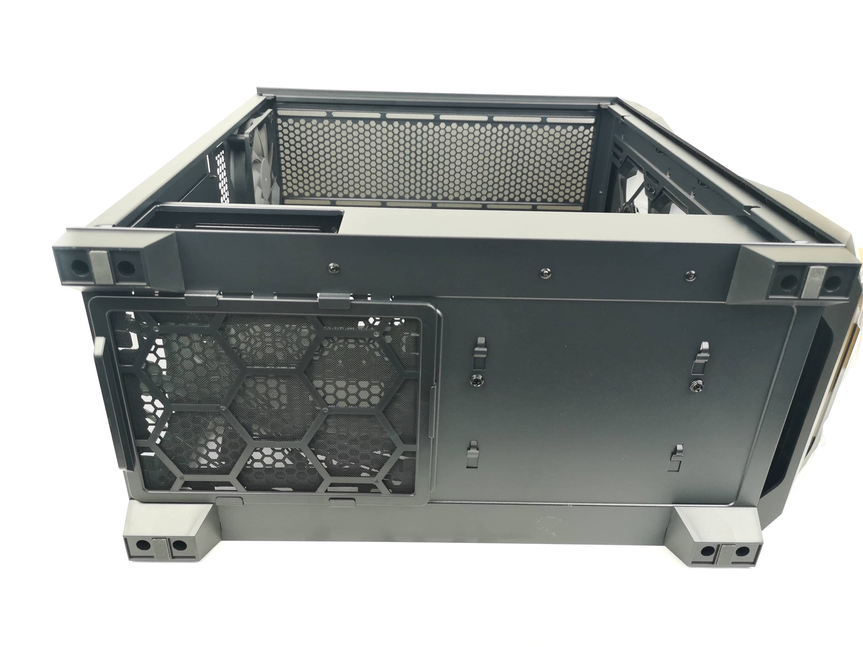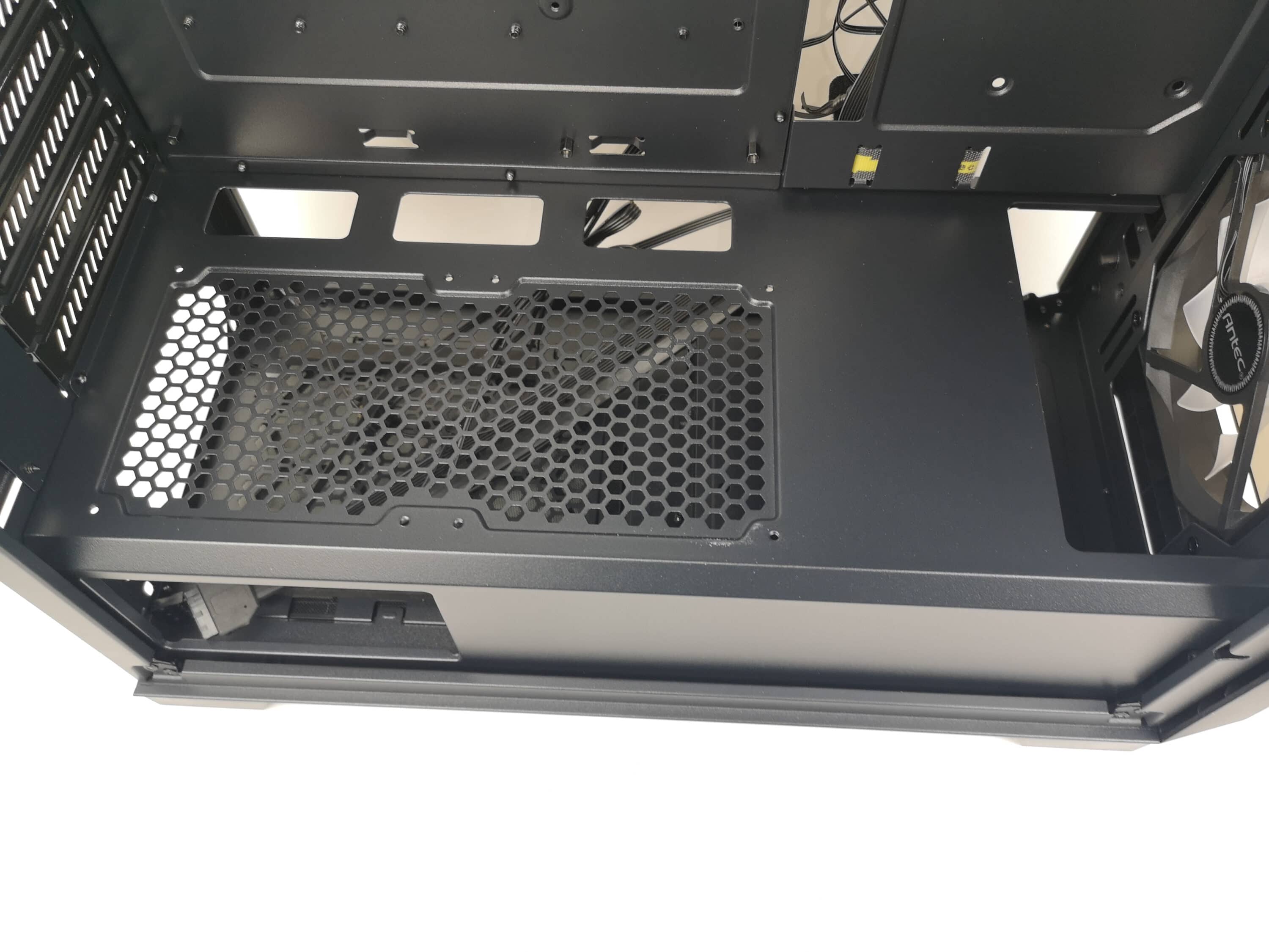 An der Unterseite befindet sich die Befestigung für den HDD-Käfig, sowie ein weiterer Staubfilter für den Lüfter des Netzteils.