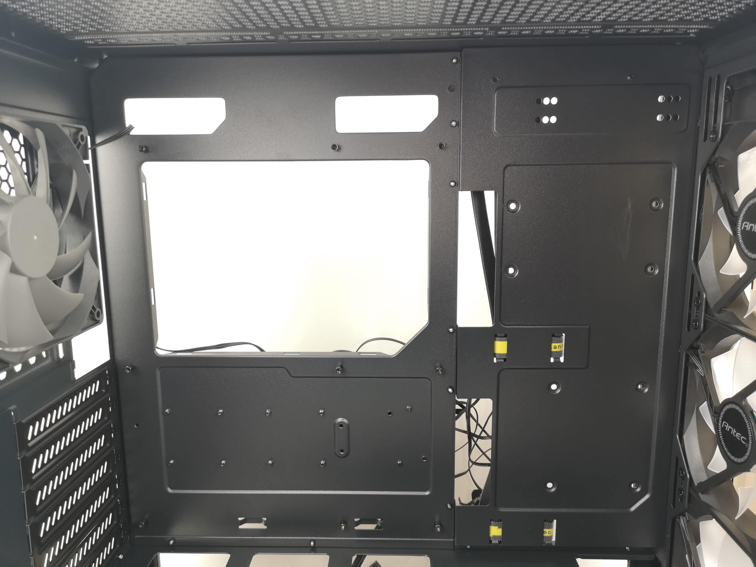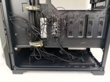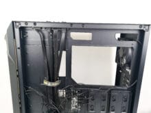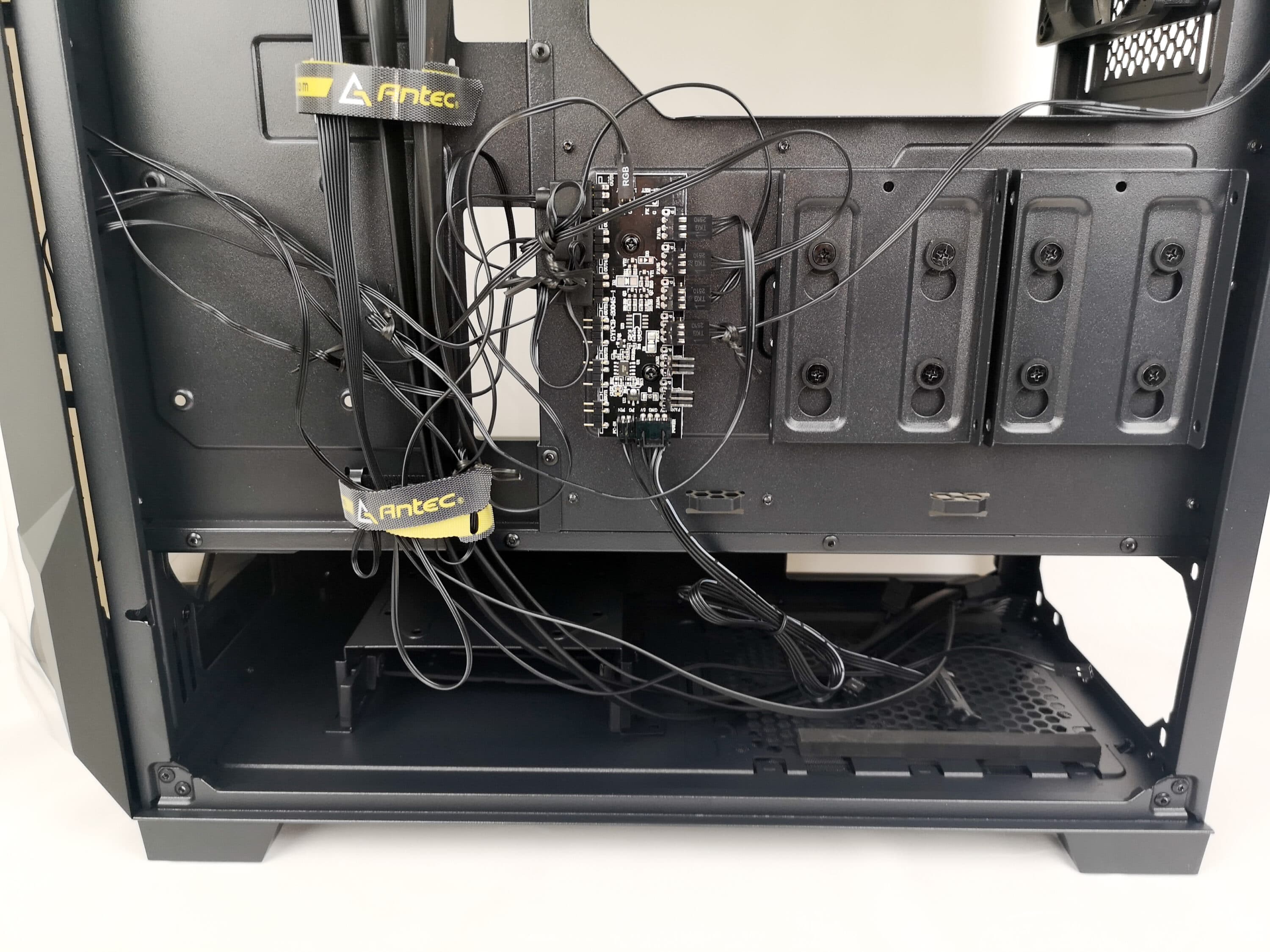 Für das Kabelmanagement werden auf der Rückseite genügend Durchführungen und Befestigungsmöglichkeiten geboten. Bei der Verwendung von sieben Lüftern und dem zusätzlich benötigten Lüfterhub, wird das Kabelmanagement allerdings zu einer echten Herausforderung. In Verbindung mit einem nicht modularem Netzteil sogar zu einer mittleren Katastrophe.