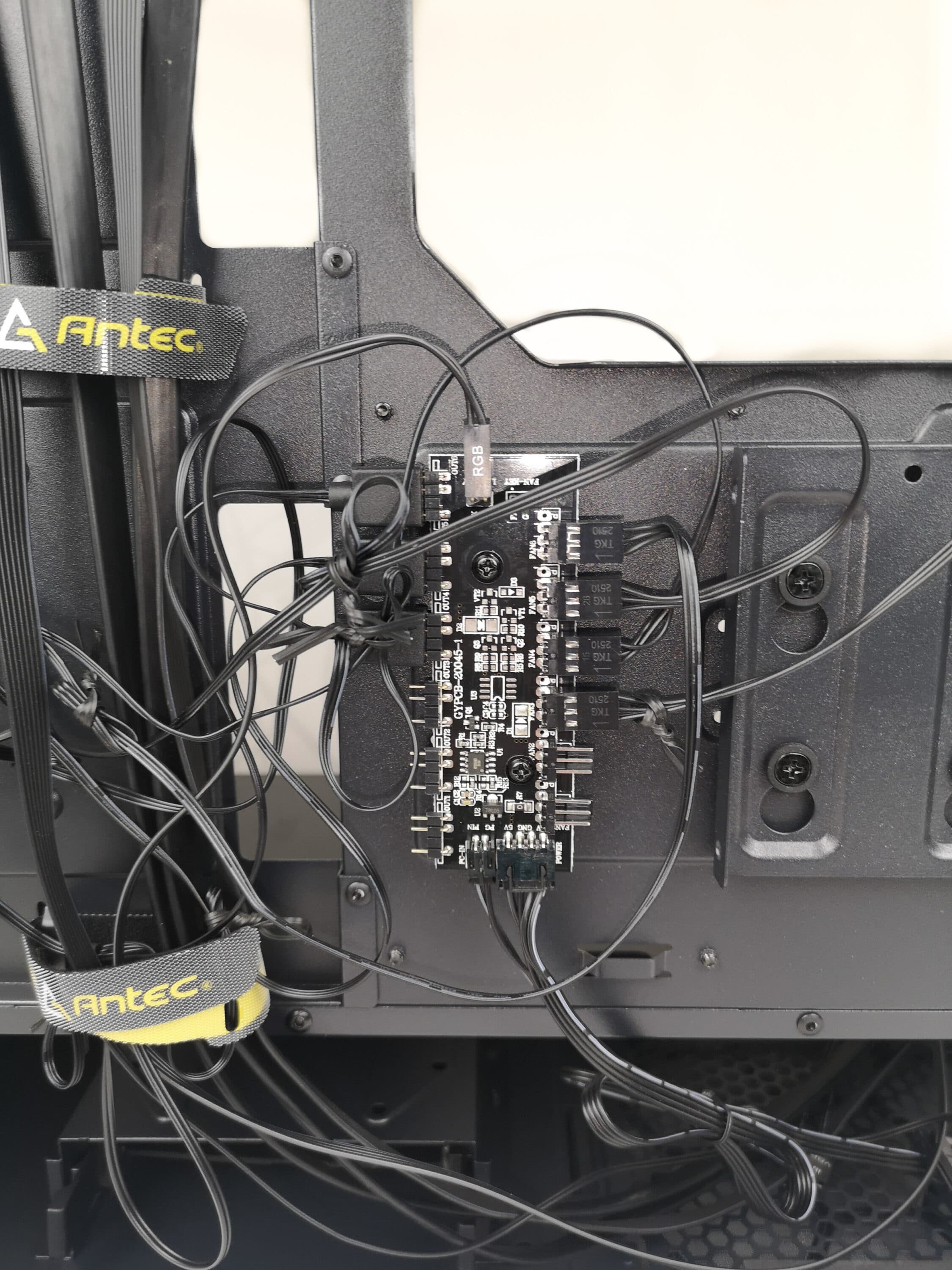 Die Beleuchtungssteuerung über den Controller funktioniert wiederum sehr gut. Eine Erklärung, wie man eine Verbindung mit dem Mainboard herstellt, ist im Lieferumfang nicht enthalten. Dazu bietet Antec aber auf der Produktseite ein Informationsblatt zum Download an. Sollte man keinen 3-Pin-ARGB-Anschluss am Mainboard haben, kann man die Beleuchtung immer noch über den Knopf in der Frontpanel steuern.