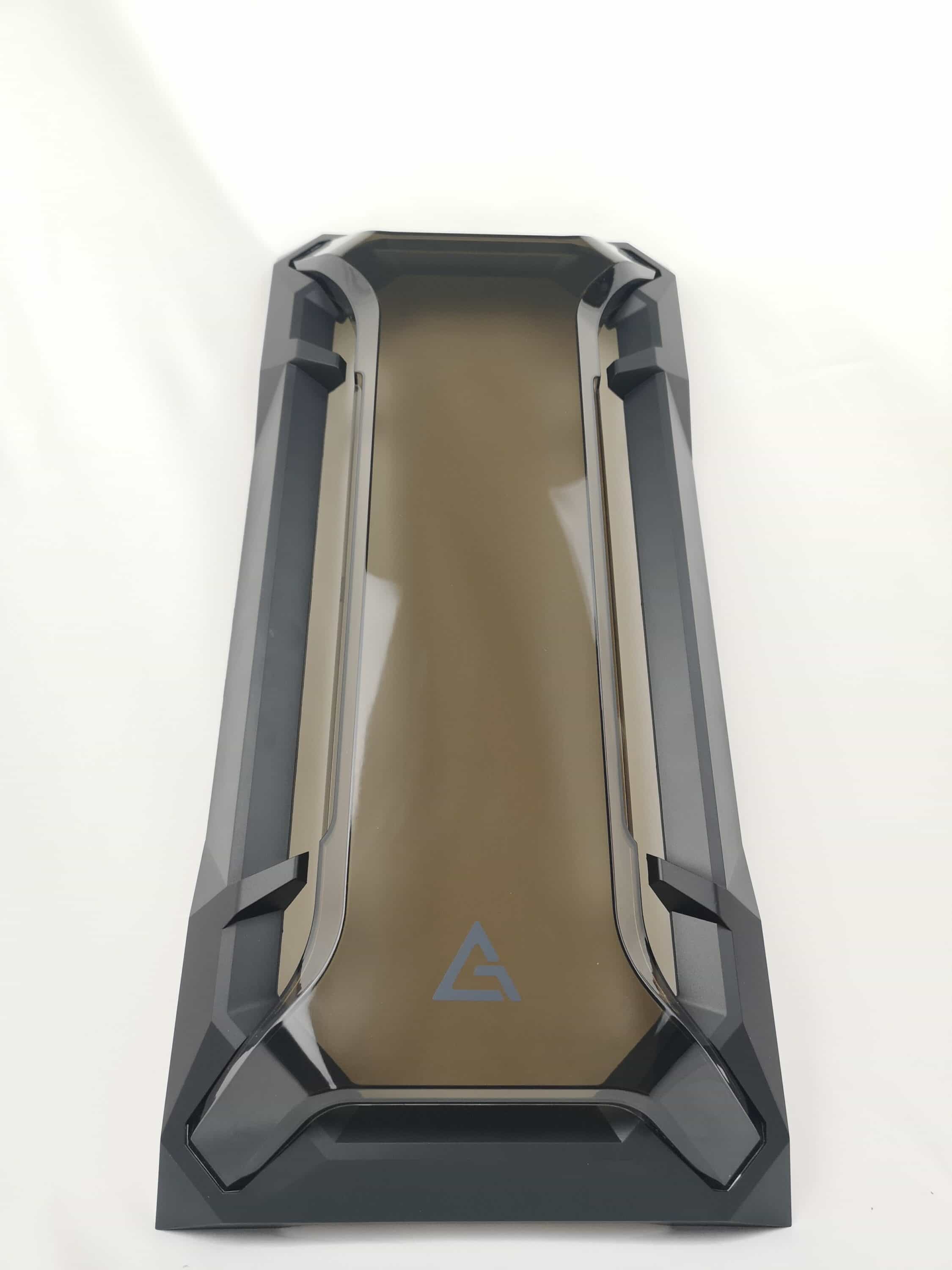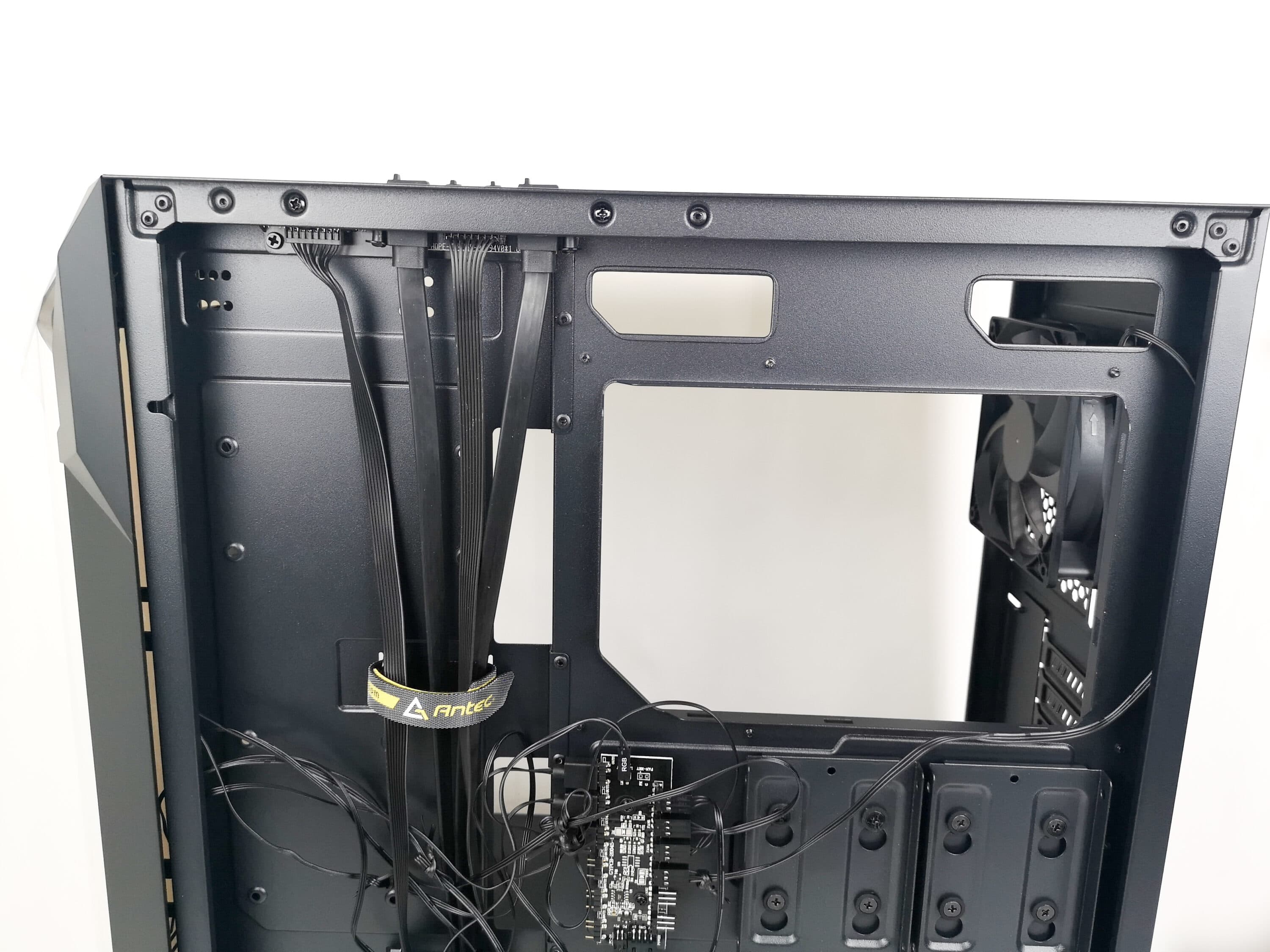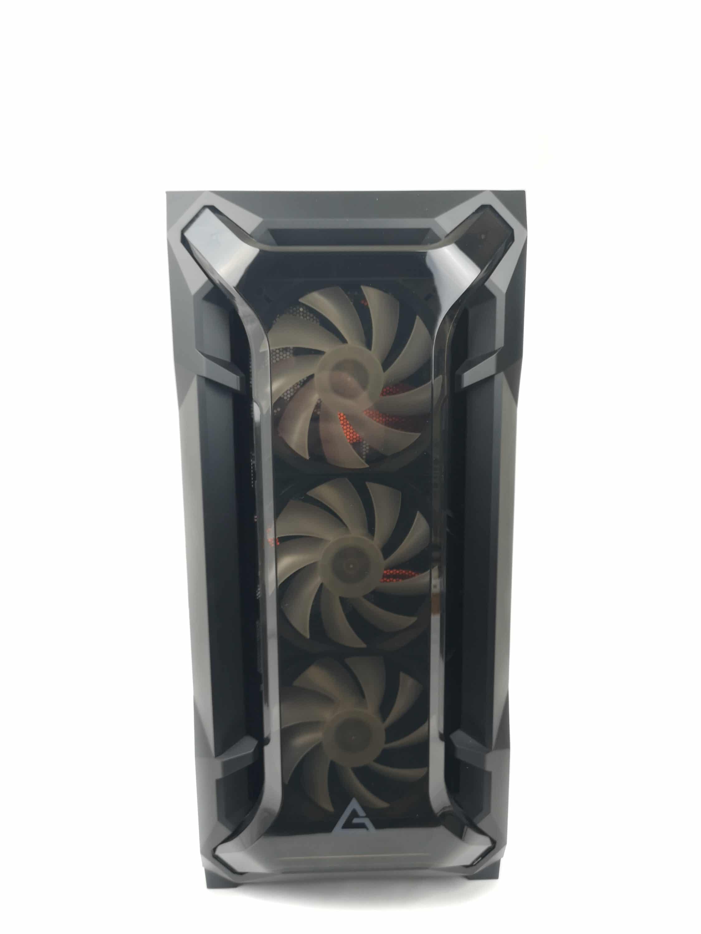 Betrachtet man die Front, stechen einem sofort die drei vorinstallierten RGB-Lüfter ins Auge. Diese werden verdeckt von einer transparenten, nennen wir es mal „Plastikbrücke“. Im unteren Bereich des transparenten Kunststoffs wurde das Antec-Logo platziert. Die frische Luft wird durch die Schlitze, zwischen schwarzem und transparentem Kunststoff, hindurch gesogen und gelangt anschließend ins Innere. Auf einen Staubfilter vor den Lüftern wurde verzichtet, was der Optik der Front zugute kommt. Das gesamte Frontpanel lässt sich durch einfaches abziehen nach vorne entfernen und man bekommt vollen Zugriff auf die Lüfter. Platz bietet die Front übrigens für bis zu drei 140-mm-Lüfter.