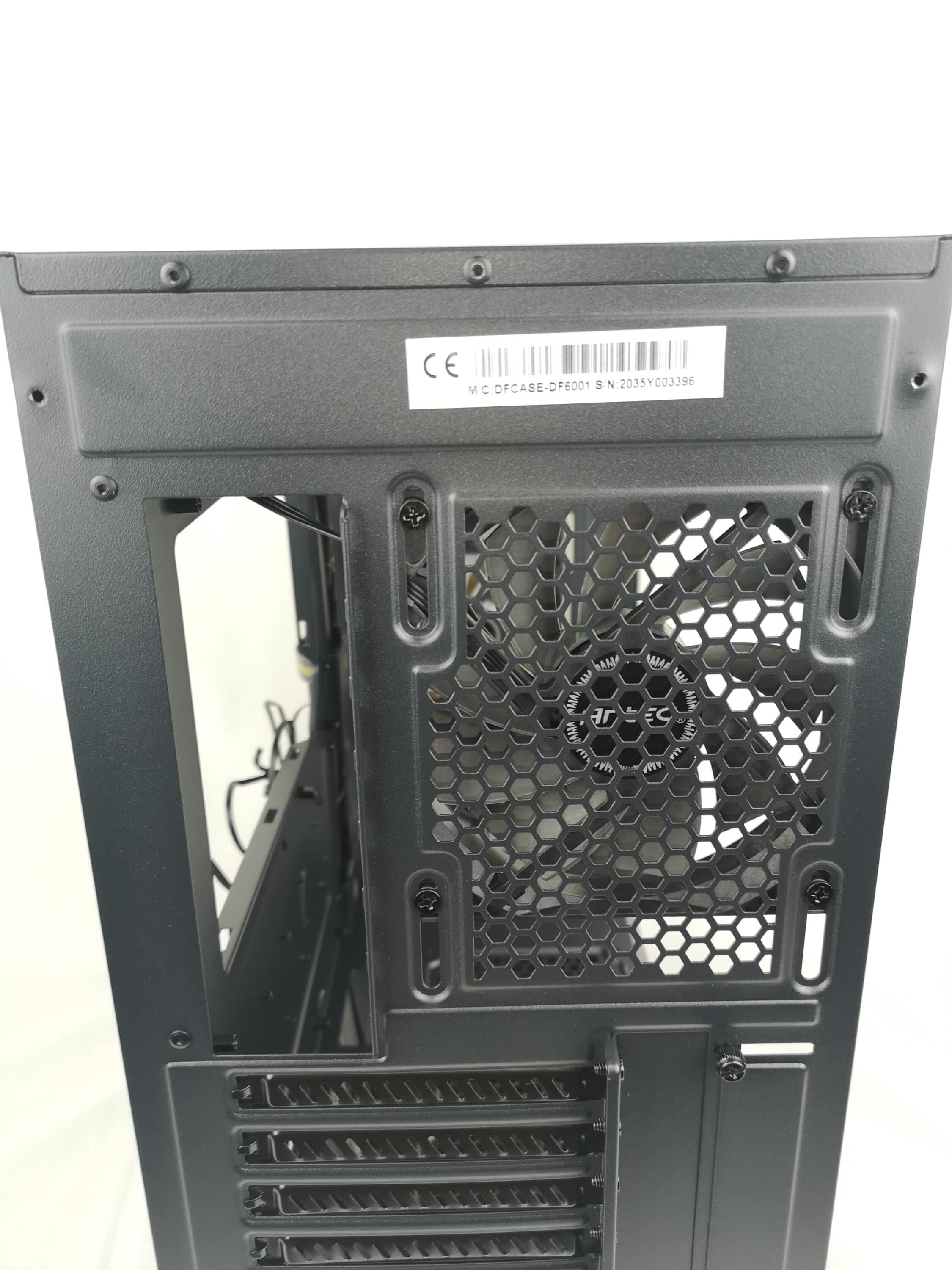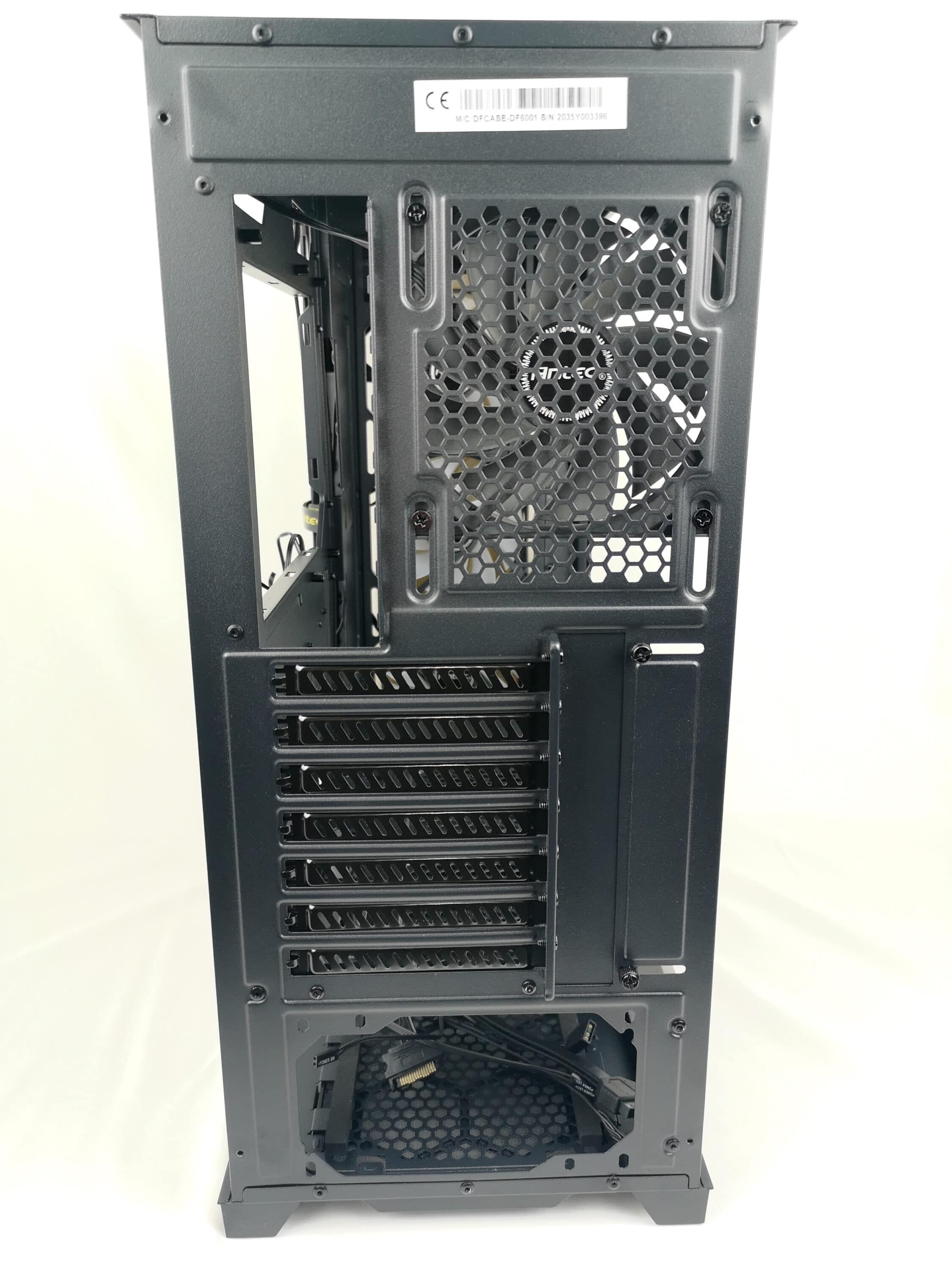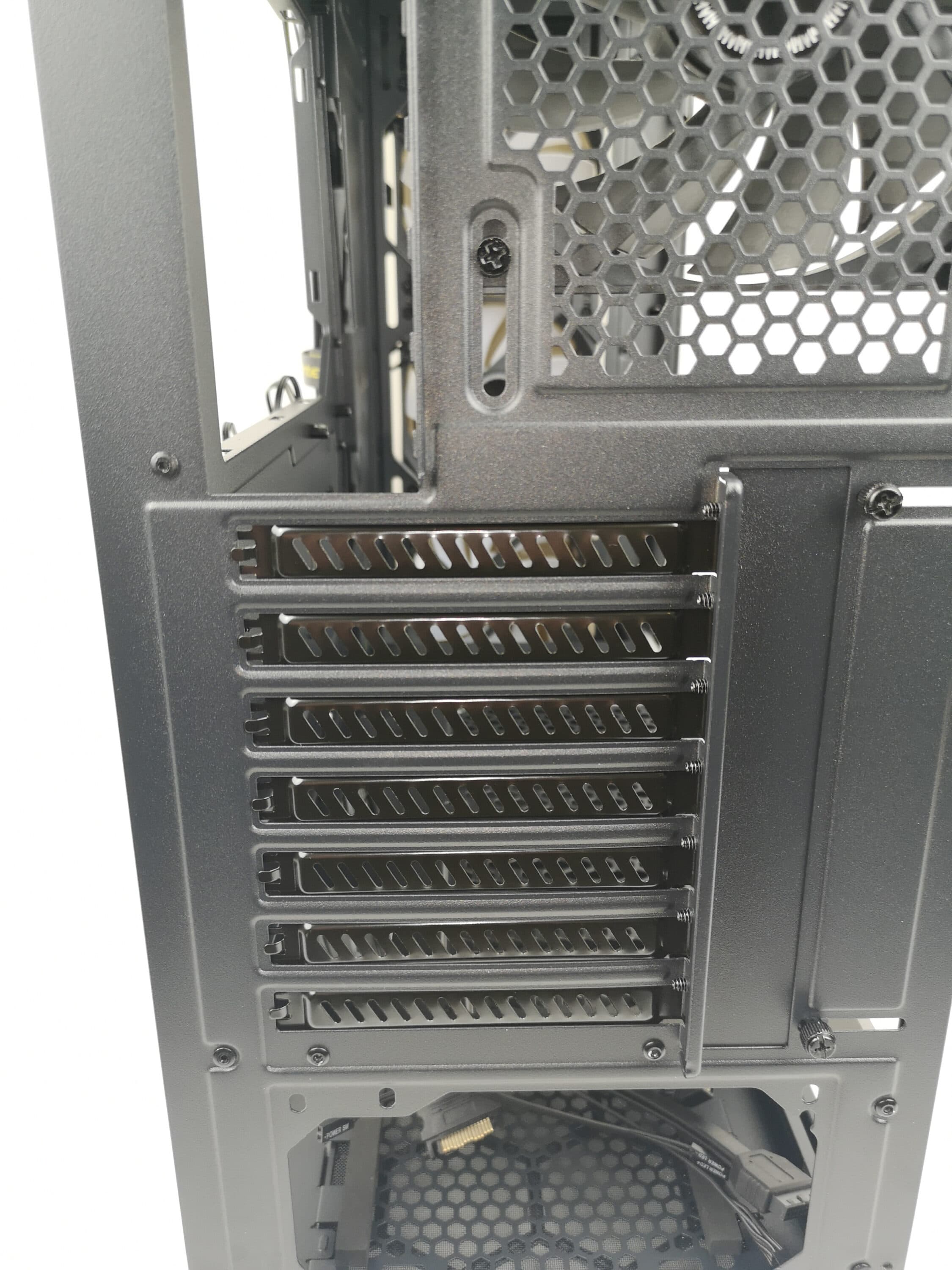 Im Heckbereich erwarten uns eigentlich keine großen Überraschungen. Das Gehäuse hat sieben PCI-Blenden im Angebot, über fehlende PCI-Express-Steckplätze müssen wir uns also keine Gedanken machen. Das Netzteil wird am Boden verbaut, dafür finden wir hier auch den entsprechenden Schacht.