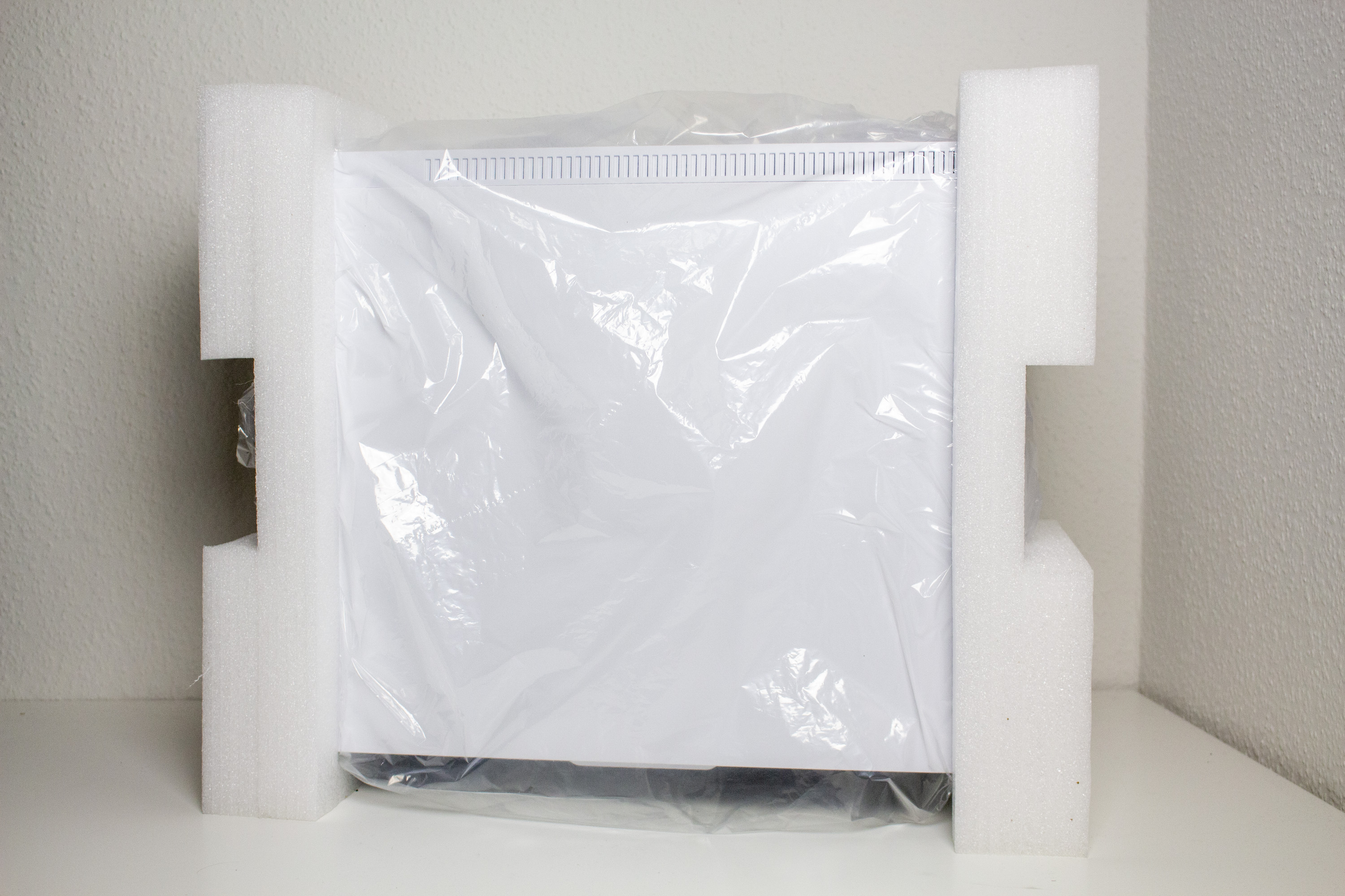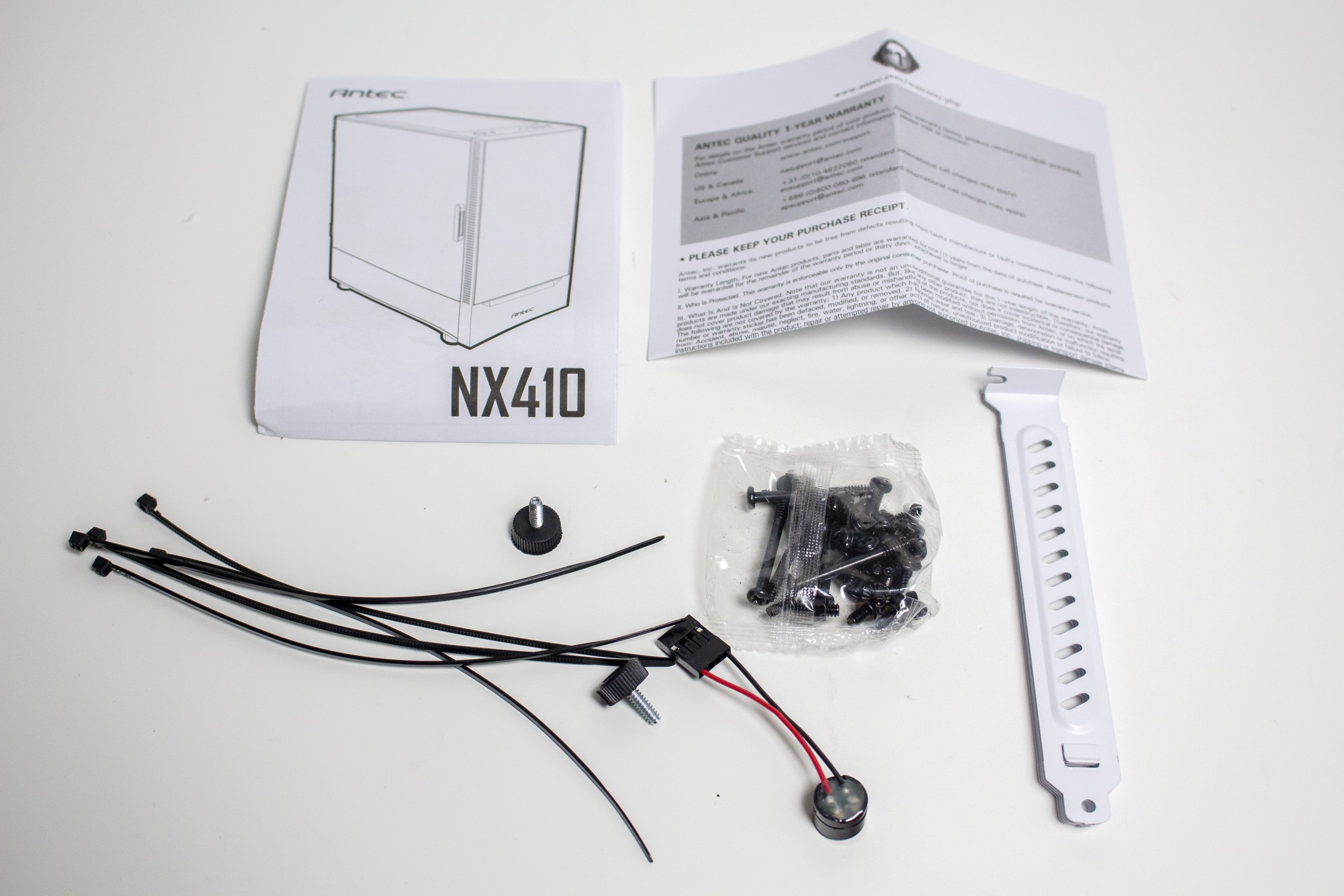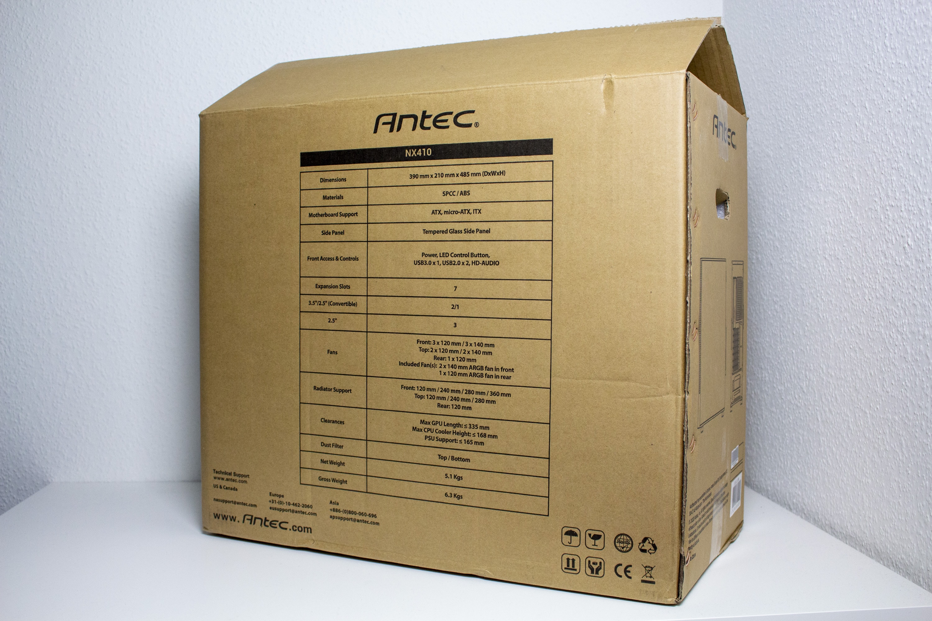 Antec verpackt das NX410 in einem schlichten Karton aus brauner Pappe. Auf die Seiten wurden in schwarzer Farbe ein Produktbild des Gehäuses, allgemeine technische Daten und die wichtigsten Features gedruckt. Im Inneren ist das Gehäuse von zwei Blöcken aus weichem Schaumstoff und einer Kunststoff-Folie umhüllt. Da der Tower lediglich 5,1 Kilogramm wiegt, sollte das als Schutz mehr als ausreichend sein. Das Zubehör befindet sich in einer kleinen Schachtel und wurde im HDD-Käfig untergebracht. Vorhanden sind alle wichtigen Schrauben, fünf schwarze Kabelbinder, einen MB-Speaker, vier weiße PCI-Slotblenden und eine Montageanleitung. Außerdem gehören zum Lieferumfang die drei vorinstallierten Gehäuselüfter mit RGB-Beleuchtung (1x 120 mm, 2x 140 mm) und zwei vorinstallierte Staubfilter.