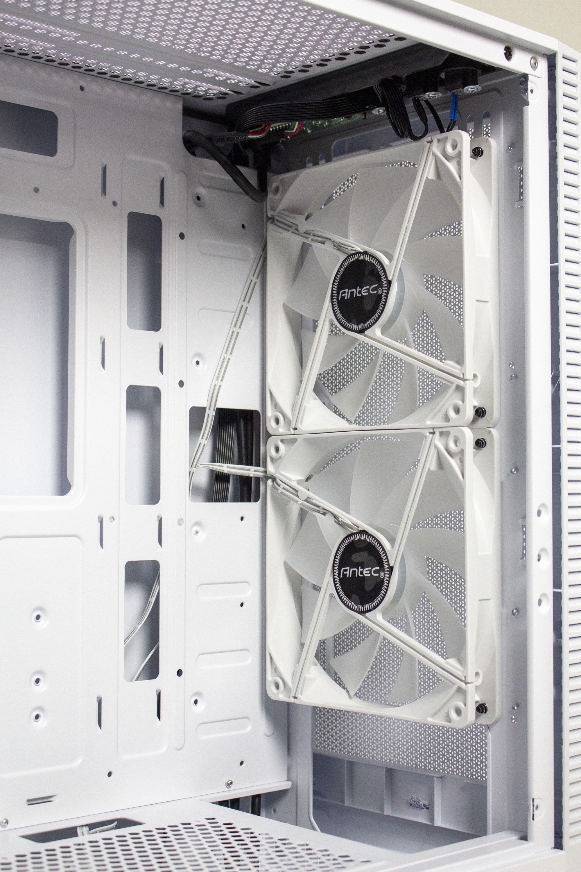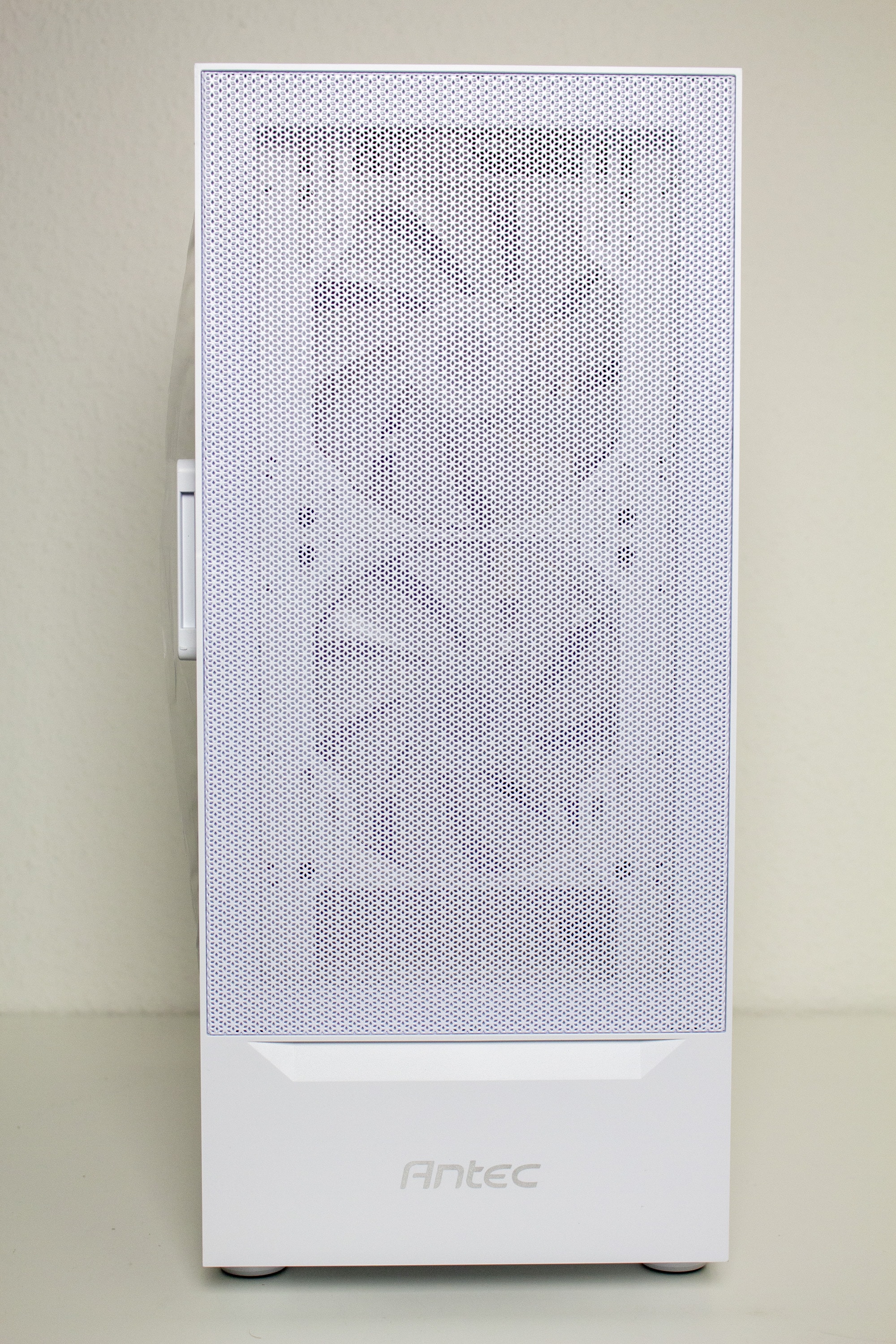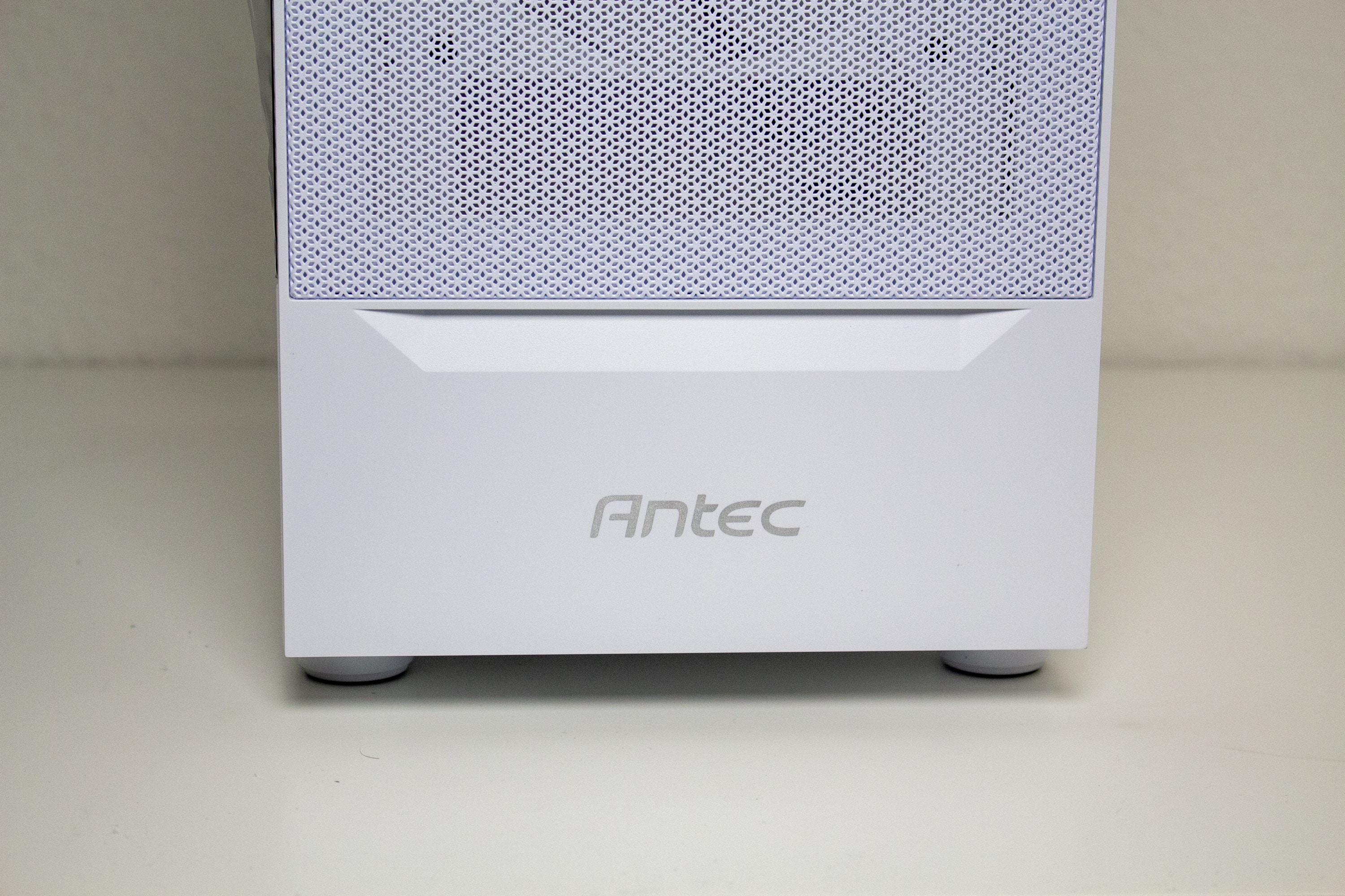 Äußerlich gibt sich das NX410 schlicht und unaufgeregt. Das Frontpanel ist plan gestaltet und wurde aus Kunststoff gefertigt. Ein feines Meshgitter überspannt dabei den größten Teil der Front und soll einen hohen Airflow ermöglichen. Auf einen Staubfilter hat Antec hier aber leider komplett verzichtet. Der untere Bereich des Frontpanels besteht aus Kunststoff, ist aber vollständig geschlossen und wurde mit dem Hersteller-Logo bedruckt. Zieht man die Front ab, kommen dahinter Montageschienen für drei 120- oder drei 140-Millimeter-Lüfter zum Vorschein. Ab Werk verbaut Antec hier zwei 140er-Lüfter mit RGB-Beleuchtung.