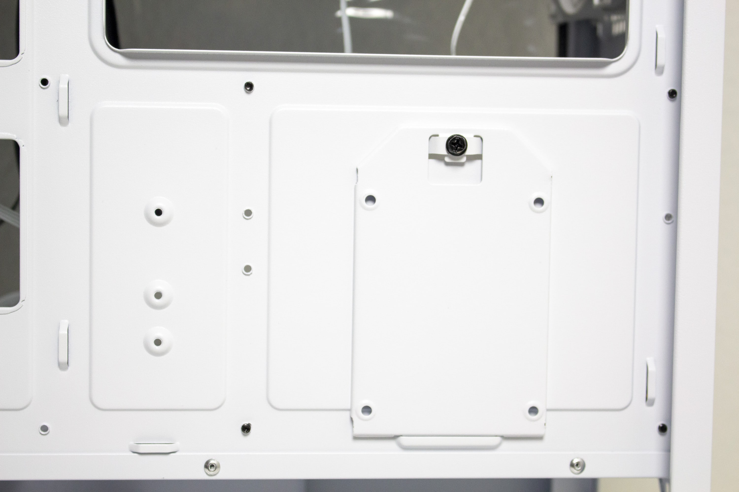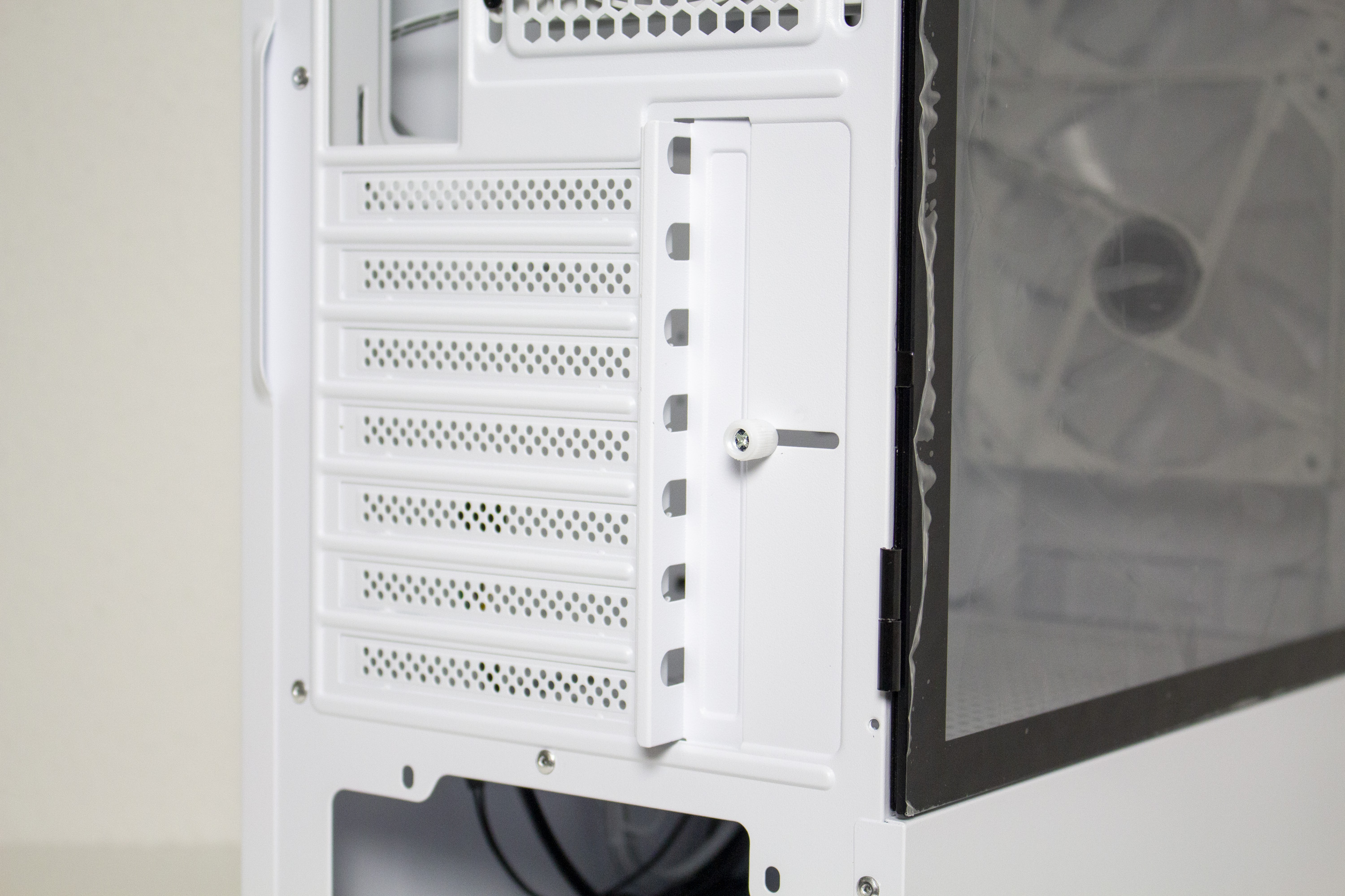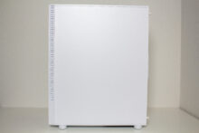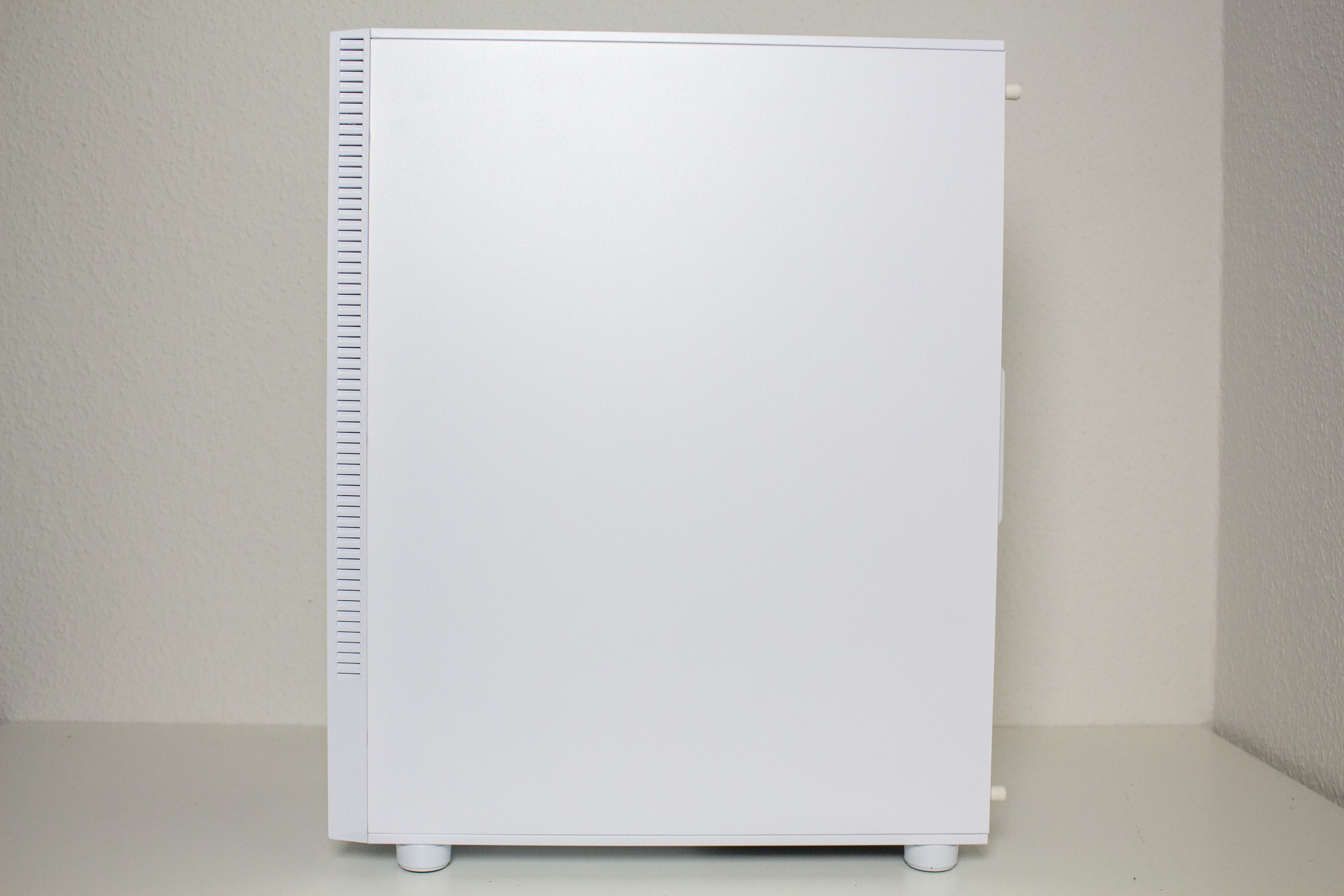 Das linke Seitenteil besteht beim NX410 aus einem 2,9 Millimeter starkem Tempered Glass und ist am hinteren Ende auf zwei Scharnieren gelagert bzw. hält im vorderen Bereich über Magnete. Durch einen kleinen Griff aus Kunststoff lässt sich das Panel einfach öffnen und das Glas bleibt frei von Fingerabdrücken. Zuletzt kann man noch erwähnen, dass das Fenster nicht die komplett linke Seite überspannt. Stattdessen schließt es mit dem Meshpanel an der Front bündig ab. Das rechte Seitenteil besteht aus Stahl, ist 0,65 Millimeter stark und verfügt über eine Griffmulde. Die Befestigung am Korpus erfolgt über zwei weiße Rändelschrauben.