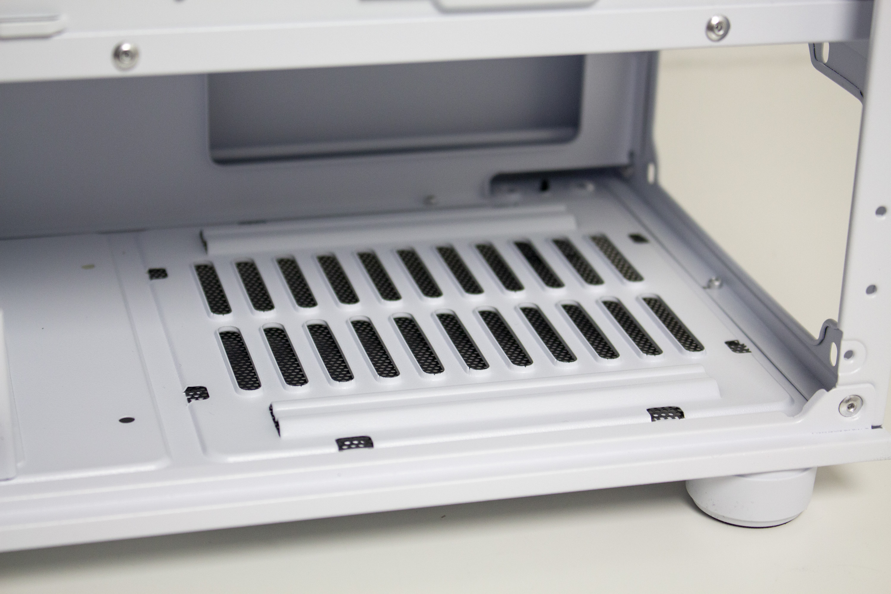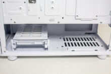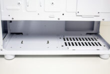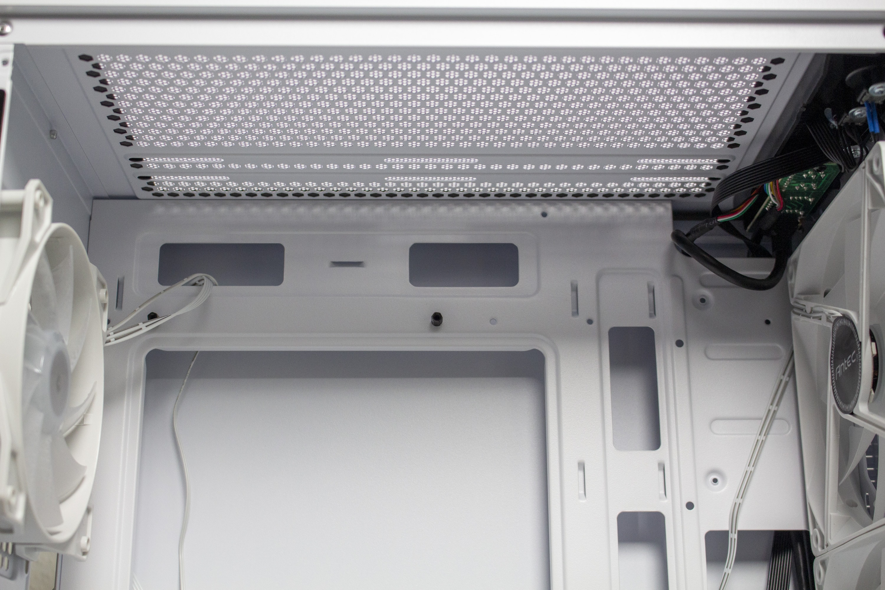 Senkt man den Blick, lässt sich der Netzteiltunnel erkennen. Dieser verdeckt das Netzteil, sämtliche Kabel sowie den HDD-Käfig und lässt somit den Innenraum deutlich aufgeräumter erscheinen. Durch die perforierte Oberseite ist es zudem problemlos möglich, das Netzteil mit Lüfter nach oben zu verbauen. Zuletzt hat der Hersteller die Abdeckung auch noch mit zwei Kabelmanagement-Öffnungen ausgestattet und auch der obligatorische Ausschnitt für einen Frontradiator ist vorhanden.