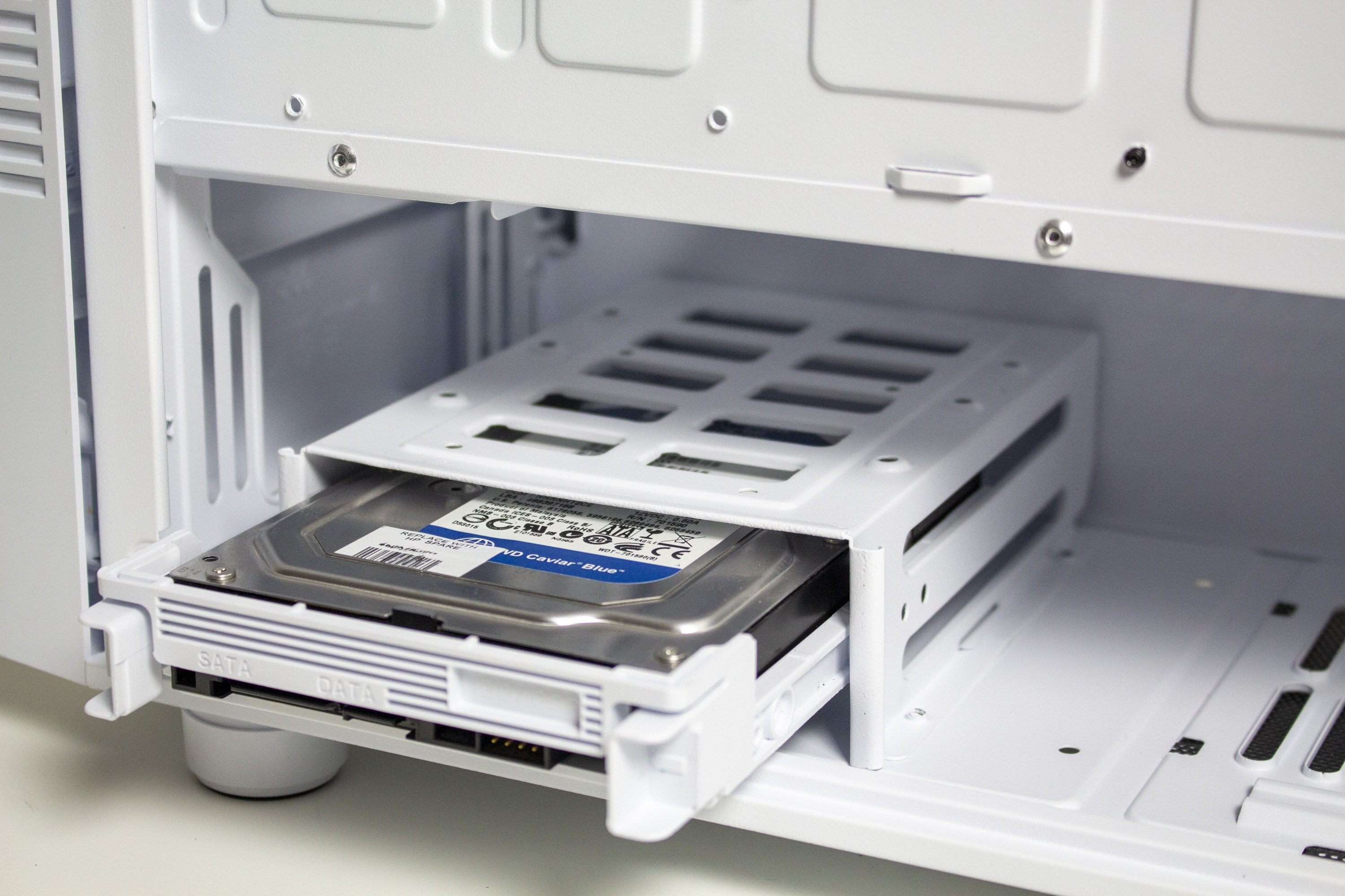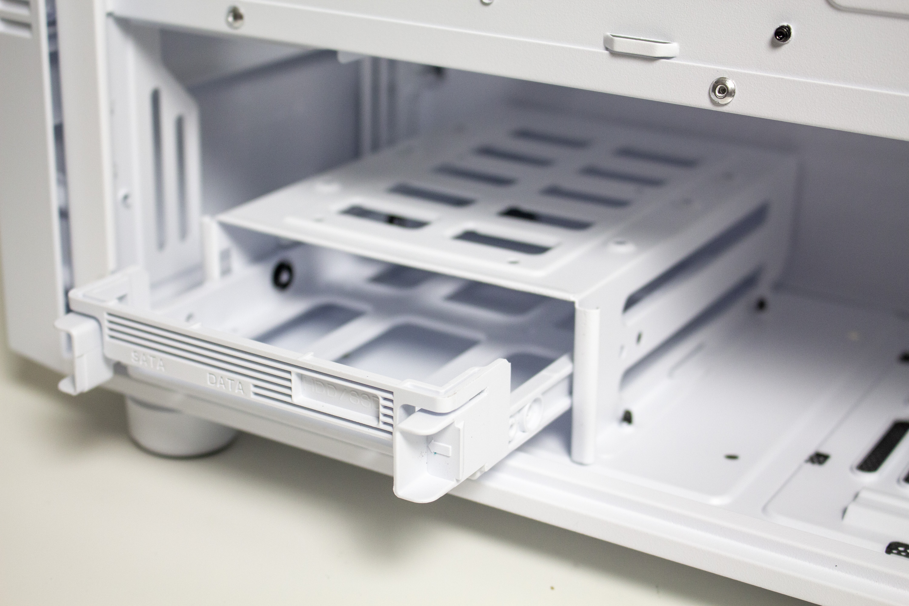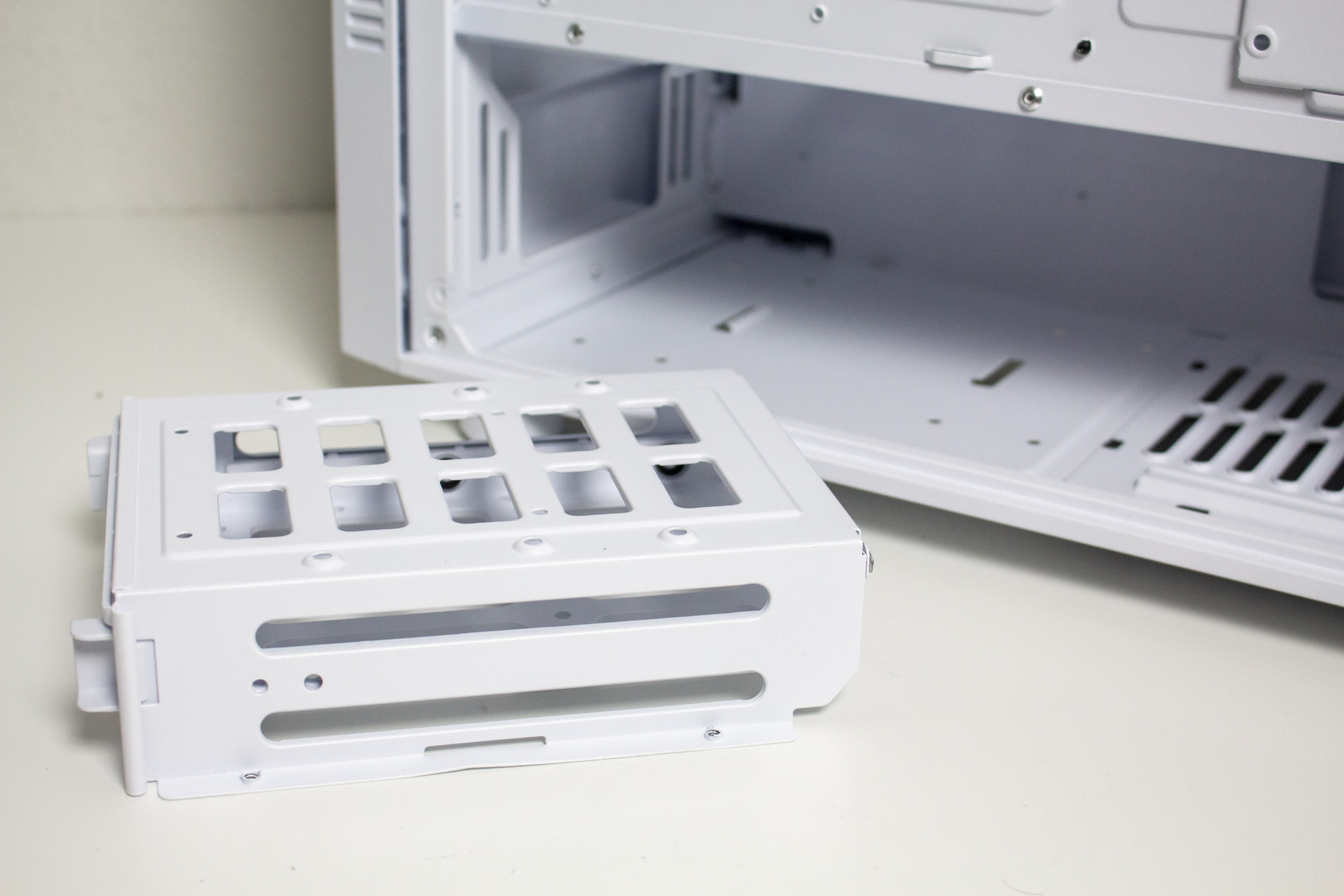 Das Antec NX410 bietet insgesamt Platz für fünf Datenträger. So können direkt hinter dem Mainboard-Tray drei 2,5″-SSDs befestigt werden. Das erfolgt ein Mal mit einem Stahlrahmen und zwei Mal per Direktverschraubung am Tray. Letzteres verdeckt aber leider zwei der drei seitlichen Kabelmanagement-Öffnungen. Vor dem Netzteil bietet dann noch der übliche HDD-Käfig Raum zur Montage von zwei 3,5″-Festplatten oder einem 3,5″- und einem 2,5″-Datenträger. Auch hier gibt es wieder Unterschiede bei der Montage. Für die untere HDD steht ein Rahmen aus Kunststoff zur Verfügung. Die Montage im zweiten Slot erfolgt mittels Verschraubung.