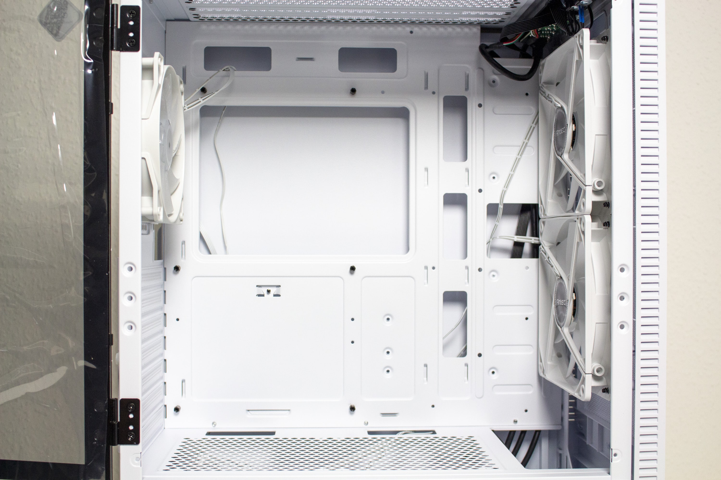 Im Innenraum trifft man auf ein beliebtes und mittlerweile bewährtes Layout mit zwei Kammern. Die Unterteilung erfolgt somit in eine große Hauptkammer und eine kleinere Netzteilkammer im unteren Bereich. Die Hauptkammer ist sehr offen gestaltet und ermöglicht den Einbau von ATX-Mainboards bzw. langen Grafikkarten. Das Mainboard-Tray ist komplett plan gestaltet und verfügt insgesamt über sieben Öffnungen für das Kabelmanagement. Der Stahl des Trays hat eine Materialstärke von 0,5 Millimetern. Erwähnenswert ist außerdem noch, dass oberhalb des Mainboards 50 Millimeter Platz zum Deckel zur Verfügung steht.