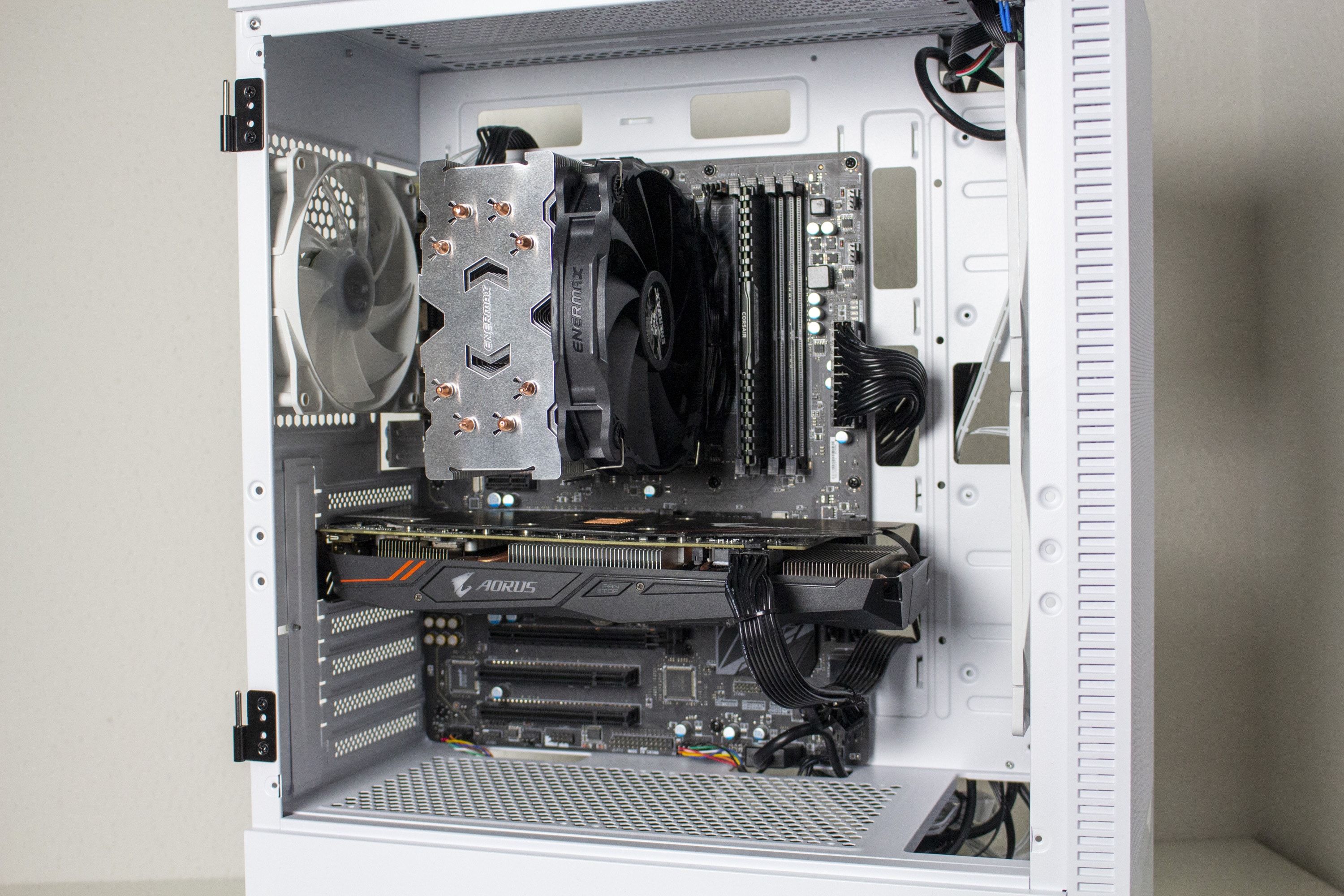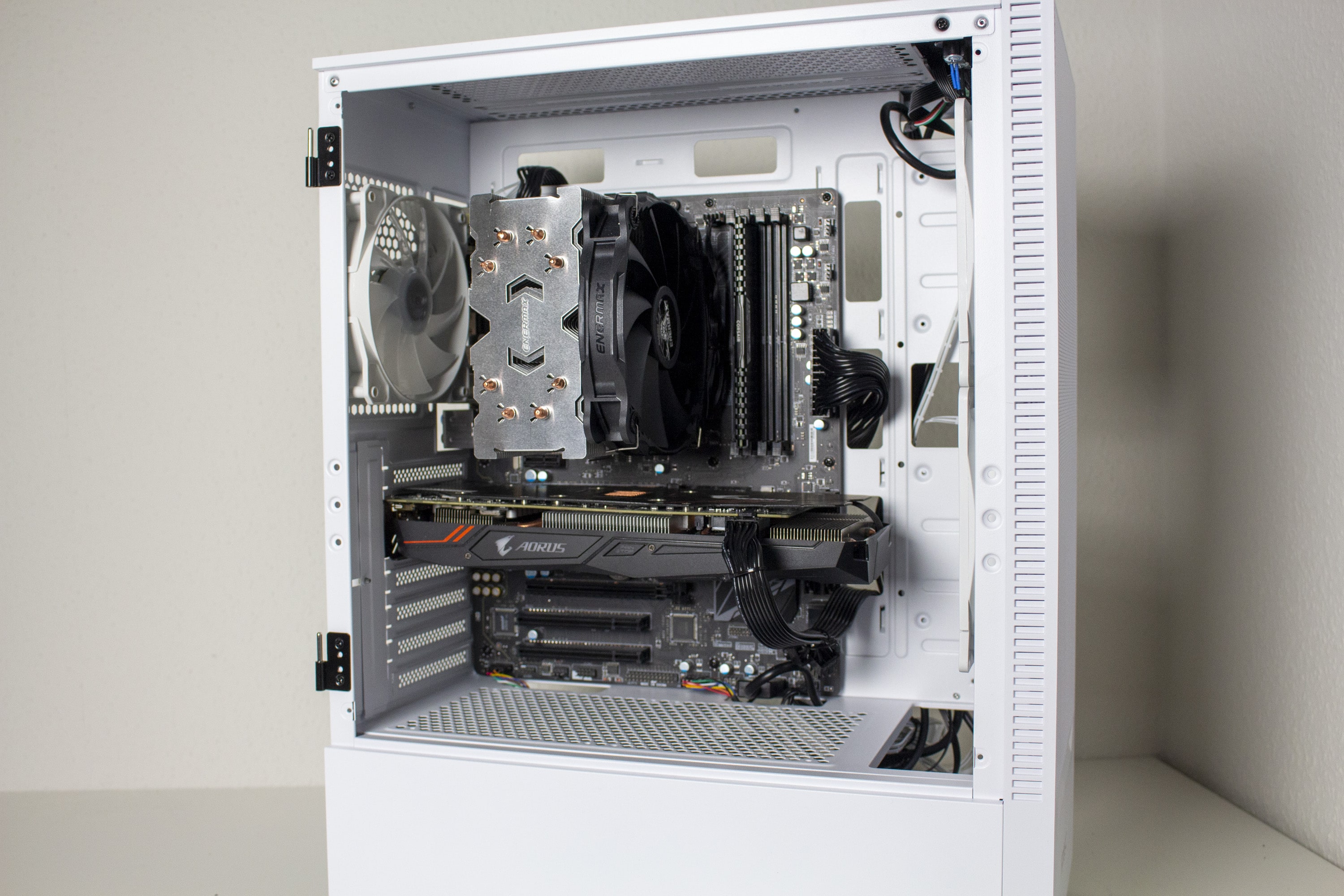 Nun kommen wir zum Systemeinbau. Als Hardware verwenden wir einen AMD Ryzen 5 1400 auf einem MSI B350 PC Mate mit 16GB Crucial Ballistix Sport LT grau DDR4-2666. Der Ryzen wird von einem Enermax ETS-F40 Silent Edition gekühlt und ist auf 3,8 GHz (1,25V) übertaktet. Für die Bildausgabe ist eine GTX 1060 6GB von Gigabyte AORUS zuständig. Die Stromversorgung erledigt das vollmodulare LC-Power LC550 V2.31 Platinum mit einem Effizienzgrad von 80 Plus Platinum.