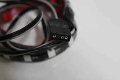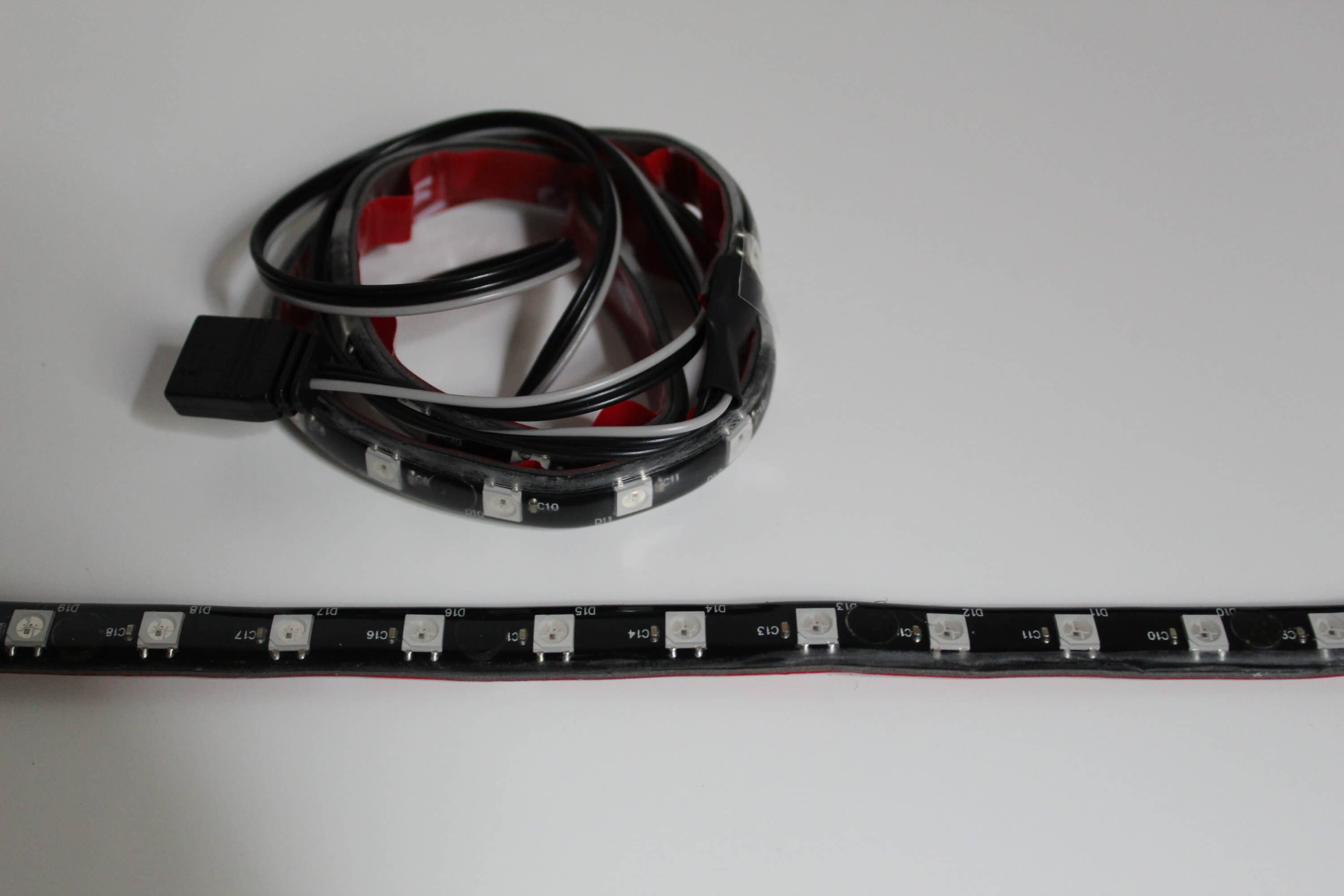 Darüber hinaus liegen dem Set zwei RGB-Streifen bei. Diese sind etwa 30 cm lang und werden ebenfalls mit einem etwa 40 cm langem 3-Pin-ARGB-Kabel angeschlossen. Hier erwartet uns nichts neues, die RGB-Streifen diverser Marken unterscheiden sich nur kaum bis gar nicht – positiv anzumerken ist es aber, dass diese magnetisch befestigt werden können und zusätzlich ein doppelseitiges Klebeband vormontiert ist.