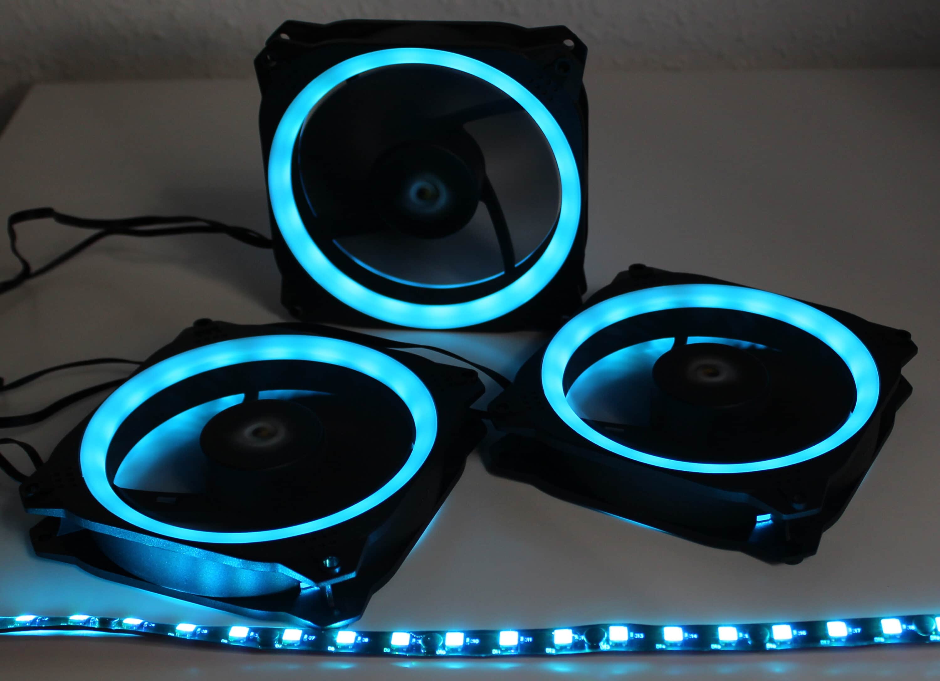 Die LEDs der Lüfter sind einzeln recht unauffällig und stechen nicht durch helle, belleuchtete Punkte auf – ganz im Gegensatz zu günstigen LED-Lüftern. Die Farben werden satt dargestellt und erzeugen ein schönes Gesamtbild im Gehäuseinneren.