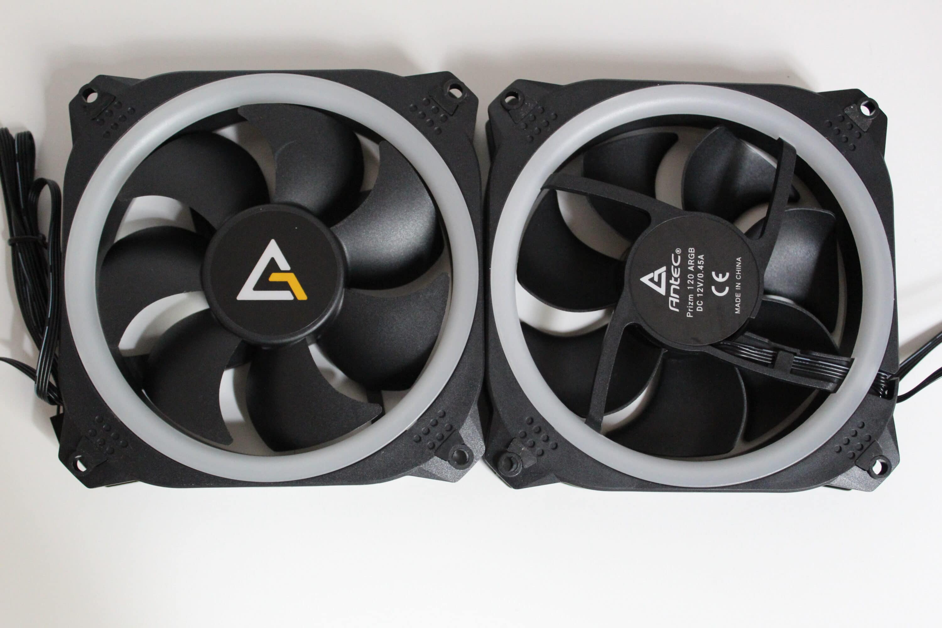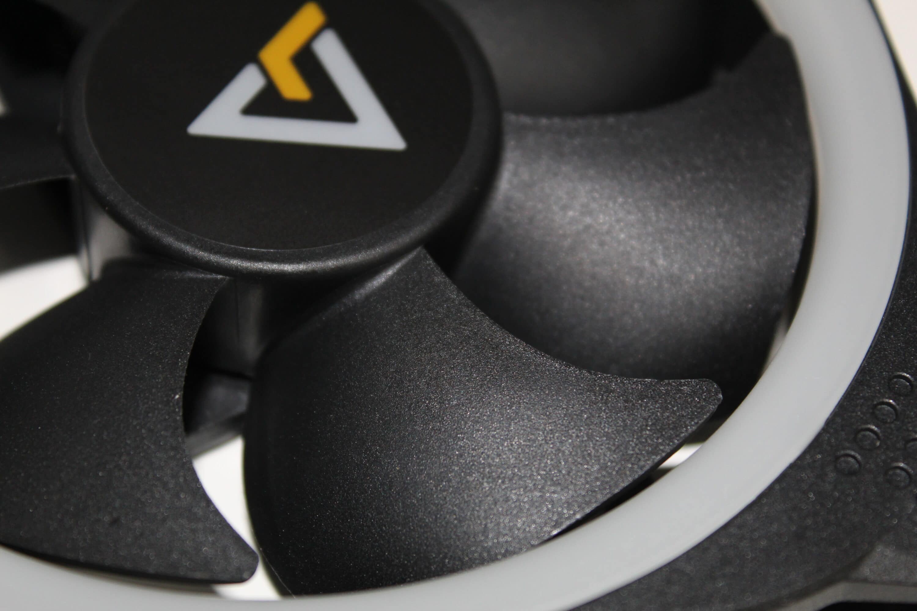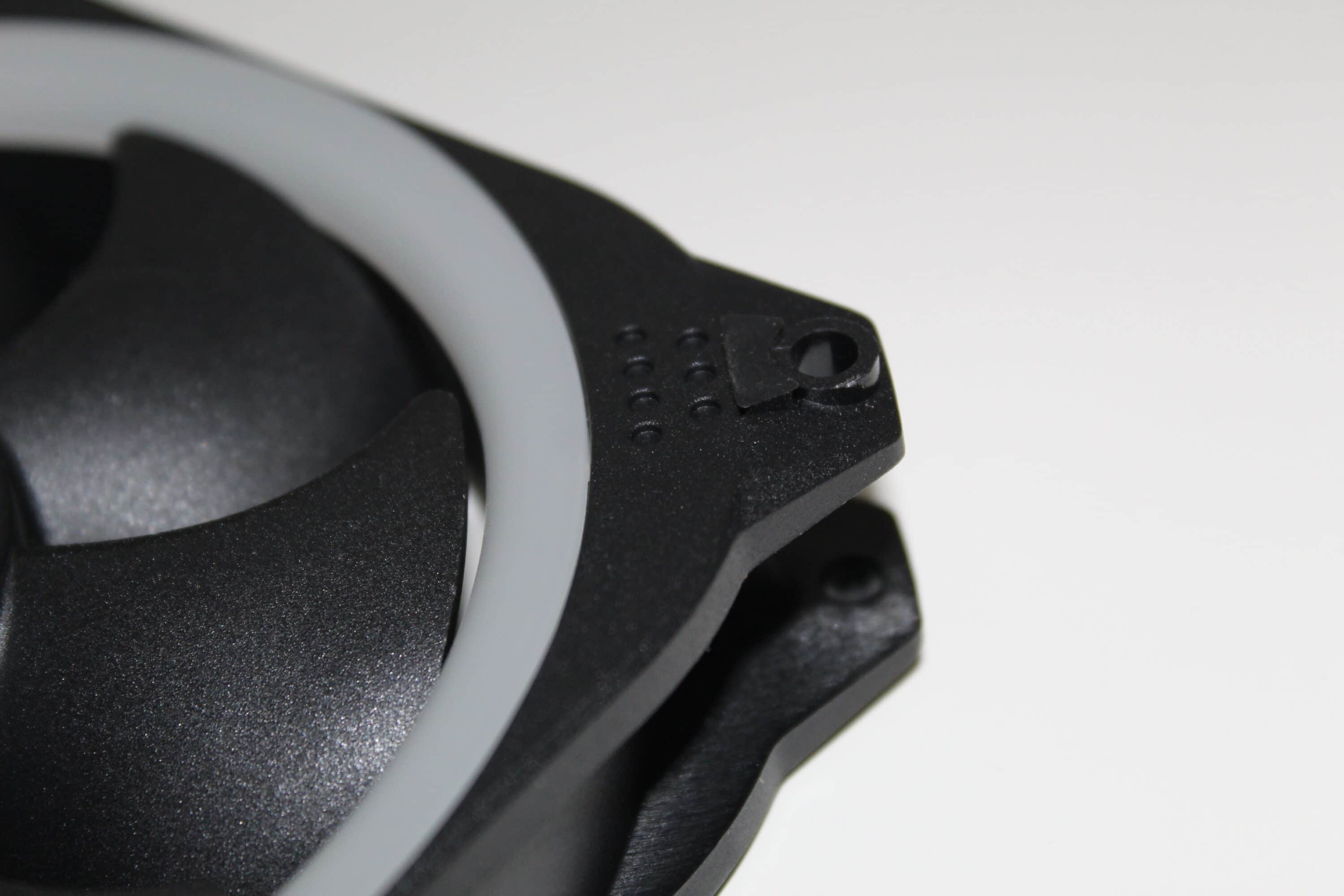 Der Korpus der Lüfter ist aus schwarzem, recht massiven Kunststoff gefertigt. Dieser ist, im Gegensatz zu Budget-Lüftern, sehr verwindungssteif und stabil – dies ist auch ein Punkt, den wir uns bei dem recht hohen Preis erhofft haben. In der Mitte des Lüfters befindet sich ein Aufkleber mit dem Antec-Logo. Bei unseren Exemplaren ist dieser ziemlich mittig aufgebraucht und „eiert“ somit bei Benutzung kaum. Außerhalb der Rotorenblätter, im Korpus des gesamten Lüfters, ist ein weißer Ring eingelassen. Dieser ist beidseitig vorhanden, sodass die RGB-Beleuchtungen von beiden Seiten sichtbar ist. Möchte man die Lüfter also einsaugend montieren, ist die Beleuchtung trotzdem komplett zu sehen.