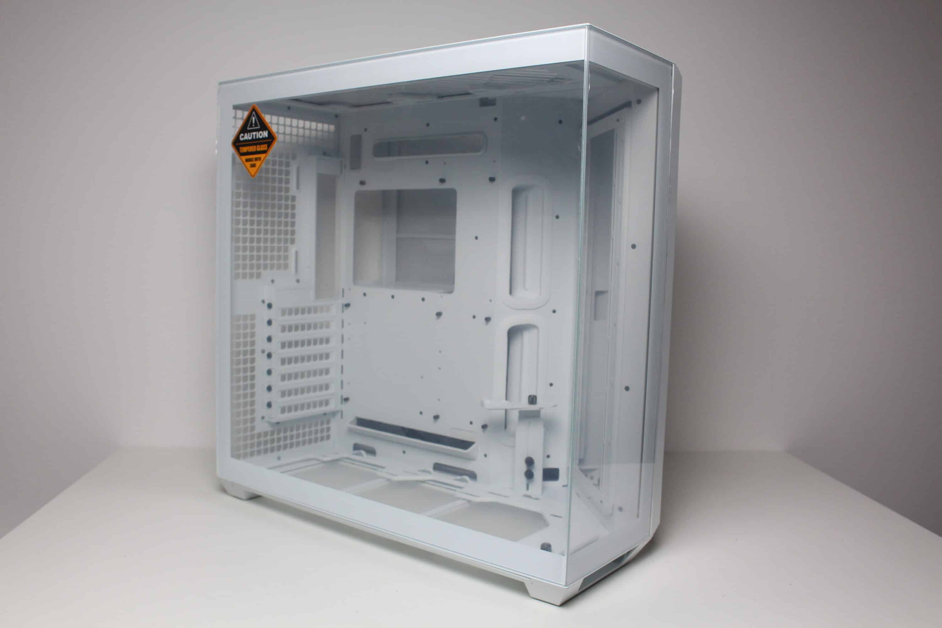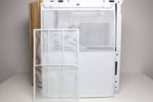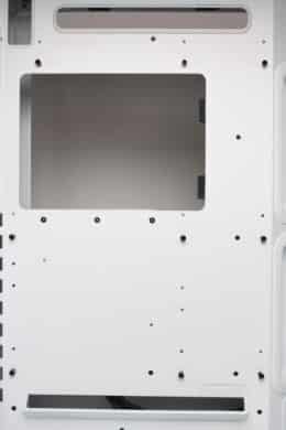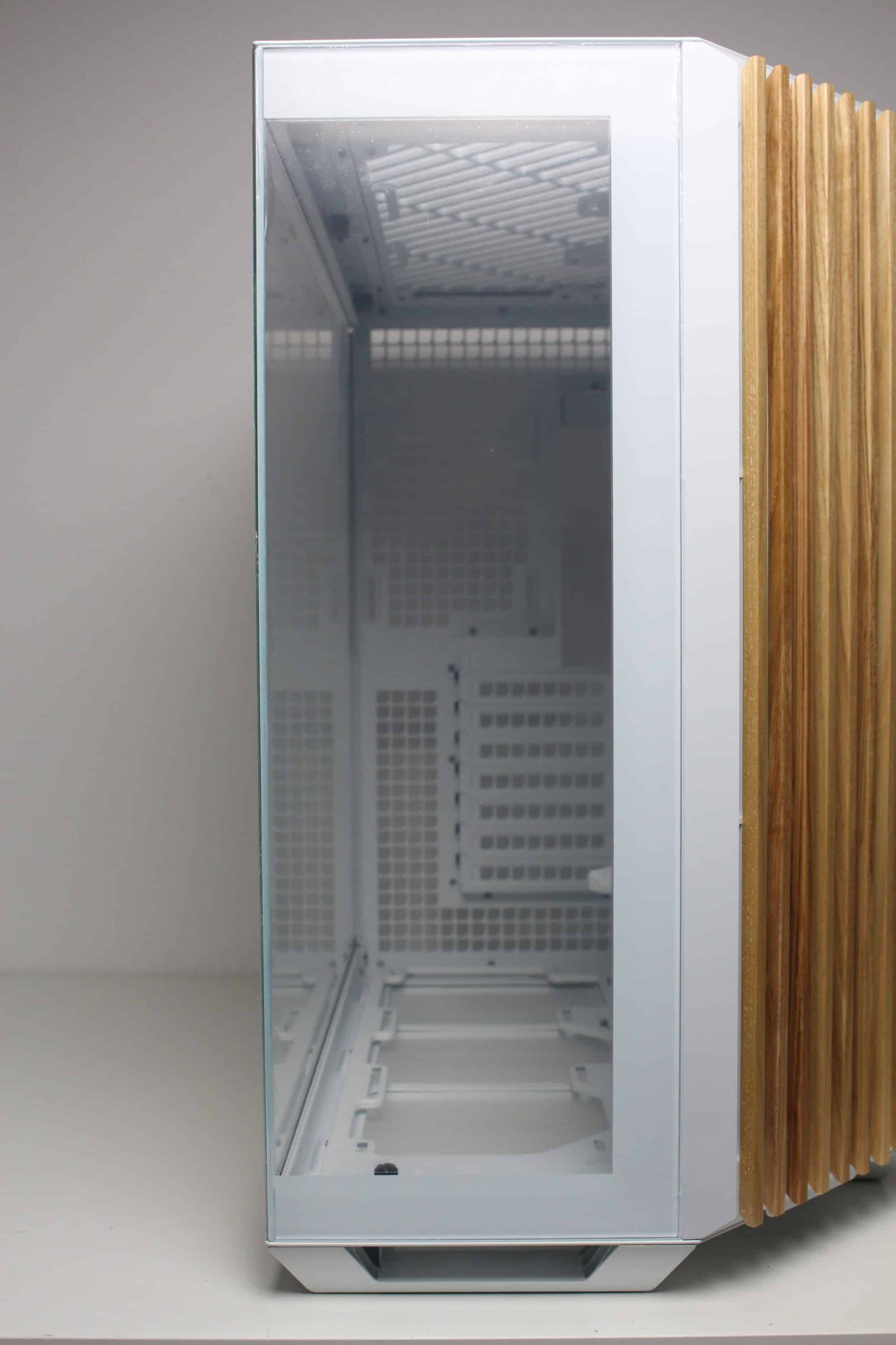 Der zweite Teil des Frontpanels besteht aus einem vier Millimeter starkem Tempered Glass, welches an drei Seiten in Gehäusefarbe lackiert. Eine Tönung gibt es bei der weißen Variante des APNX V1 nicht. Im unwahrscheinlichen Fall dass man die Glasscheibe ausbauen möchte, muss man dazu zwei Schrauben entfernen und kann anschließend die Scheibe aus der Verankerung heben.