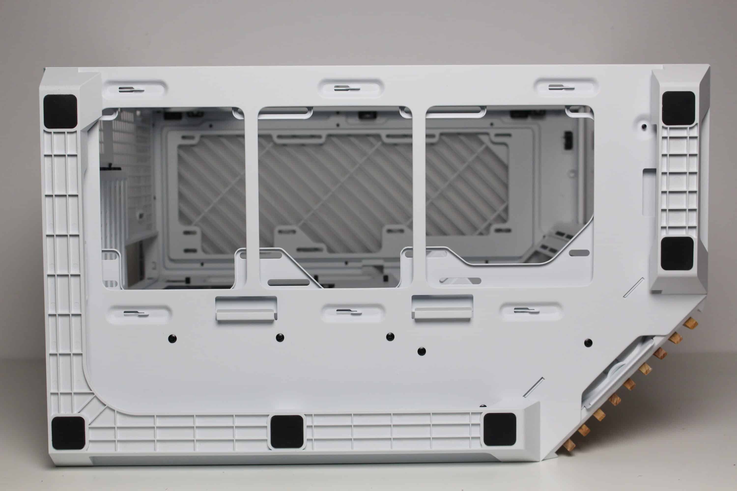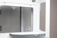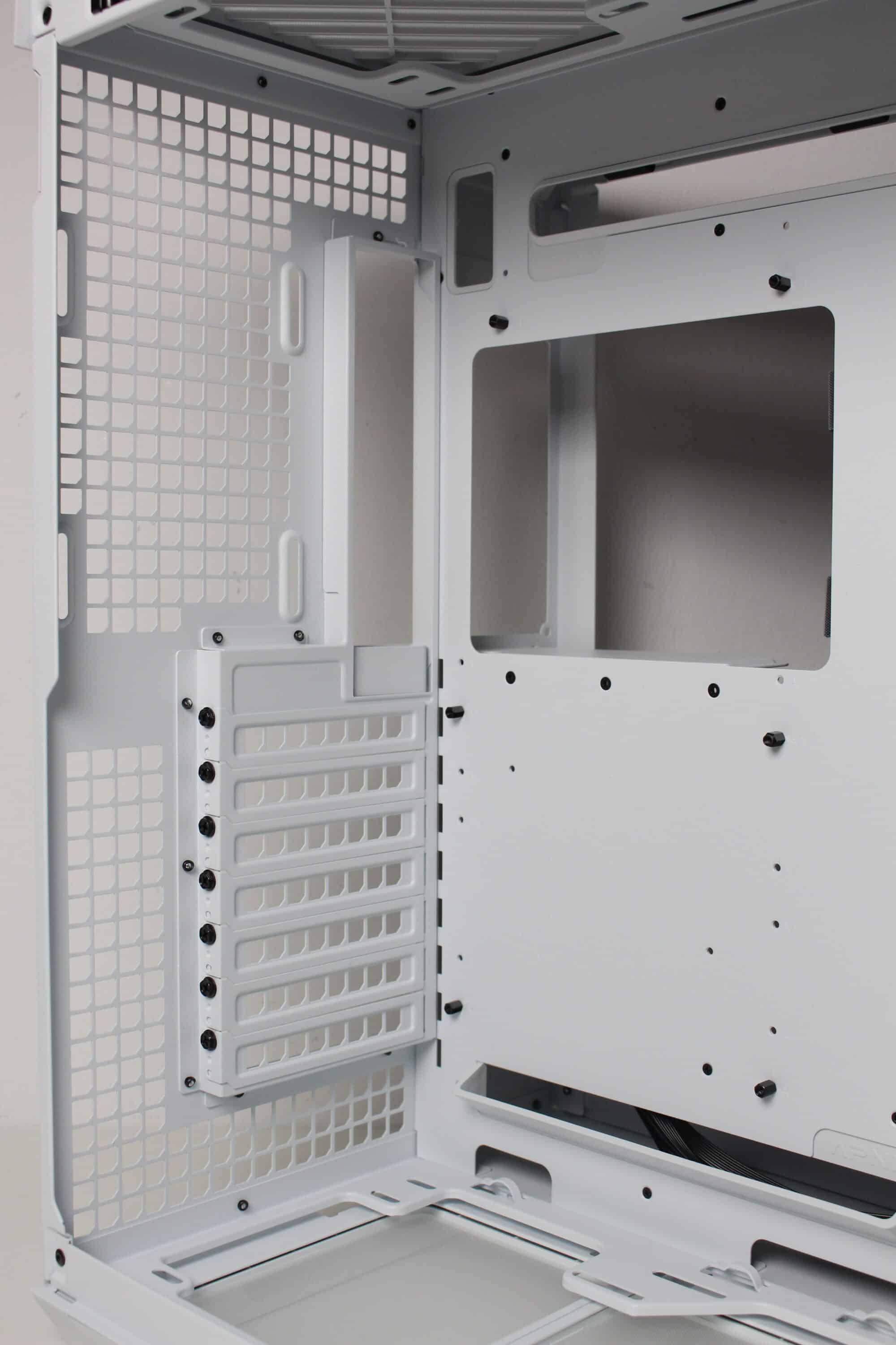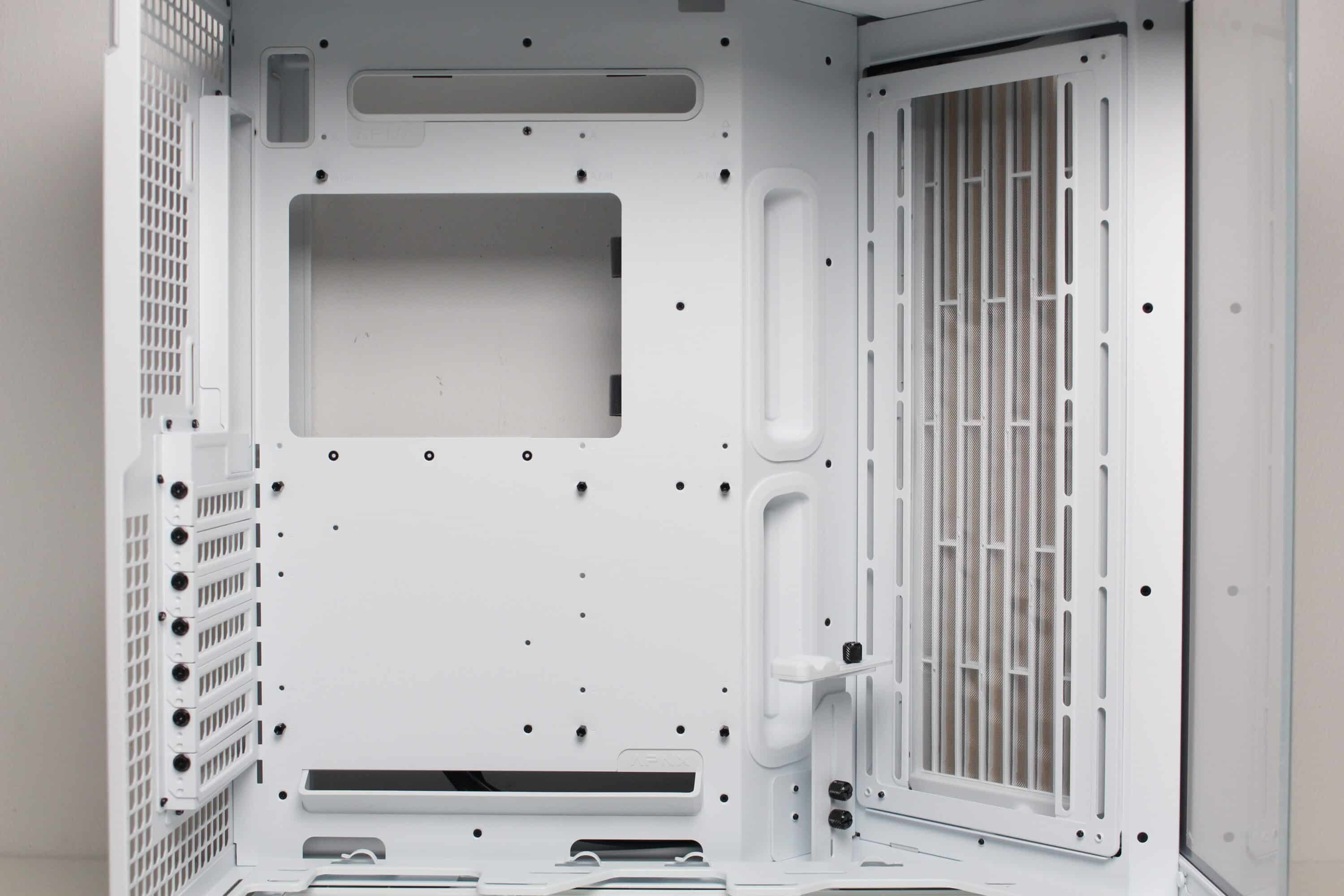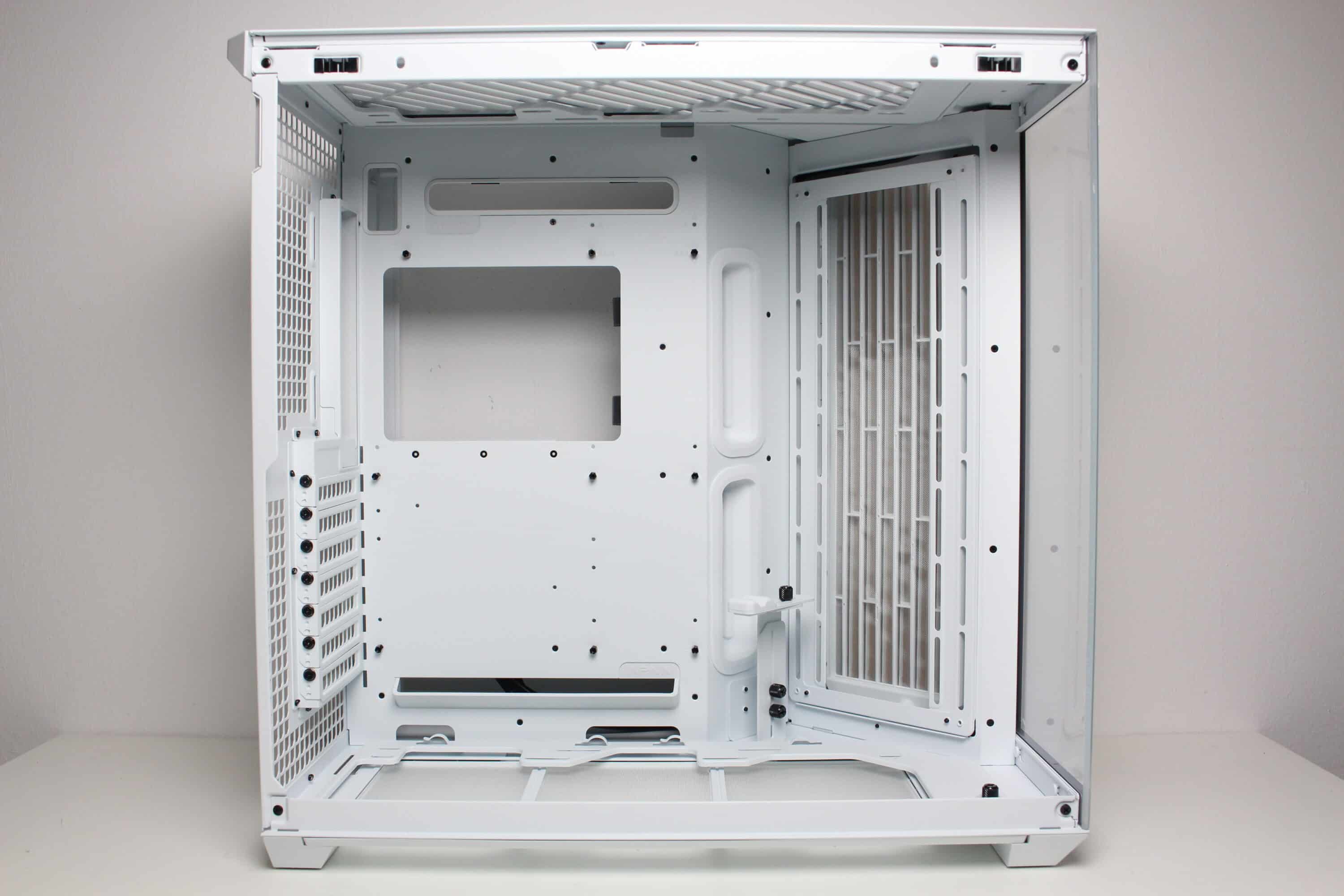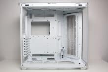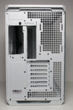 Das Mainboard-Tray ist dabei plan gestaltet, besitzt einen Ausschnitt an der Rückseite und verfügt über neun vorinstallierte Abstandshalter für die Hauptplatine. An der rechten Seite ist das Mainboard-Tray um 45 Grad nach hinten abgewinkelt und wurde mit zwei sehr großen und gummierten Kabeldurchführungen versehen. Zwei ähnliche Öffnungen wurden auch im oberen Bereich und eine weitere unterhalb des Trays platziert. Des Weiteren gibt es unten und oben im Gehäuse sehr viel Platz und Befestigungsmöglichkeiten für Lüfter.