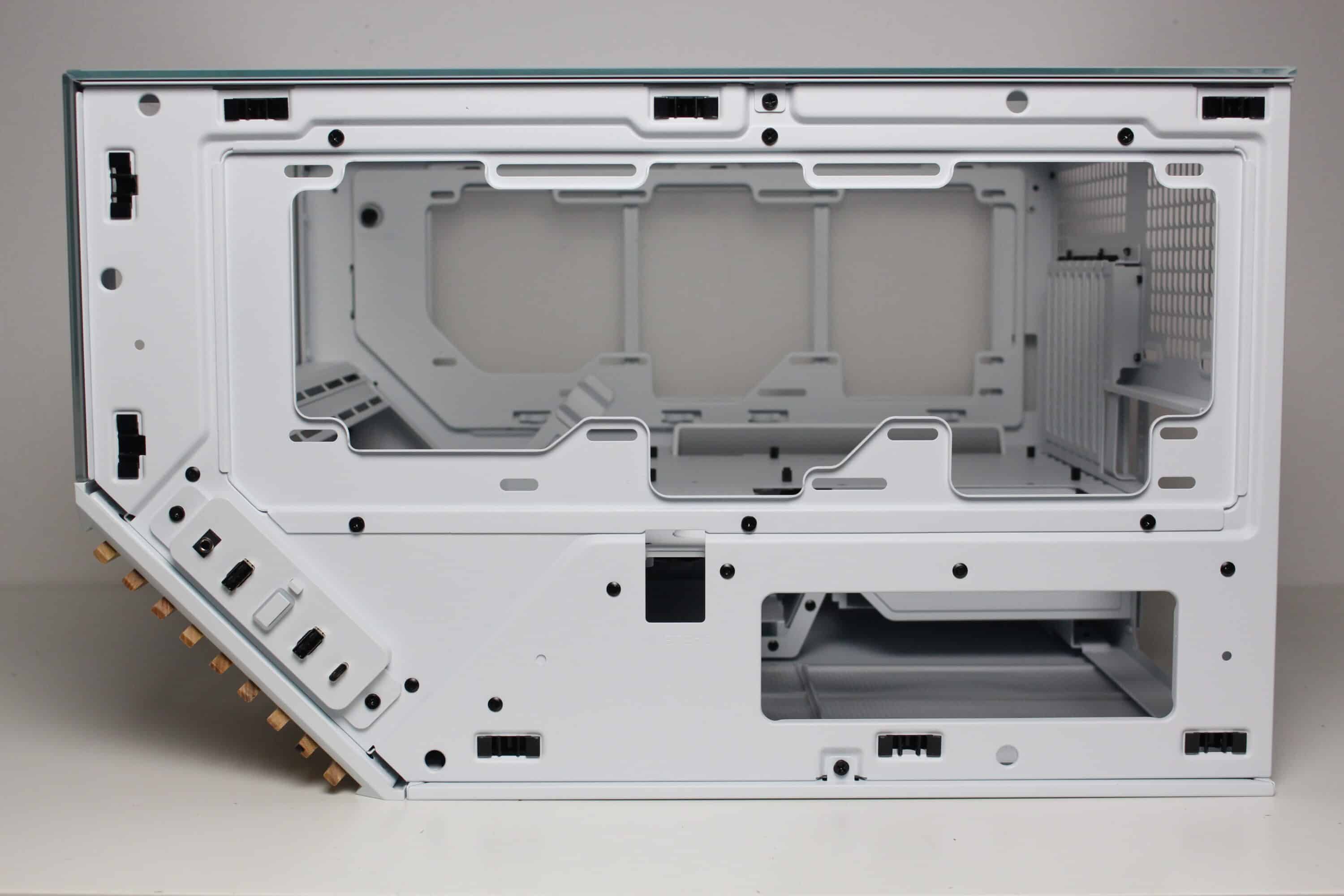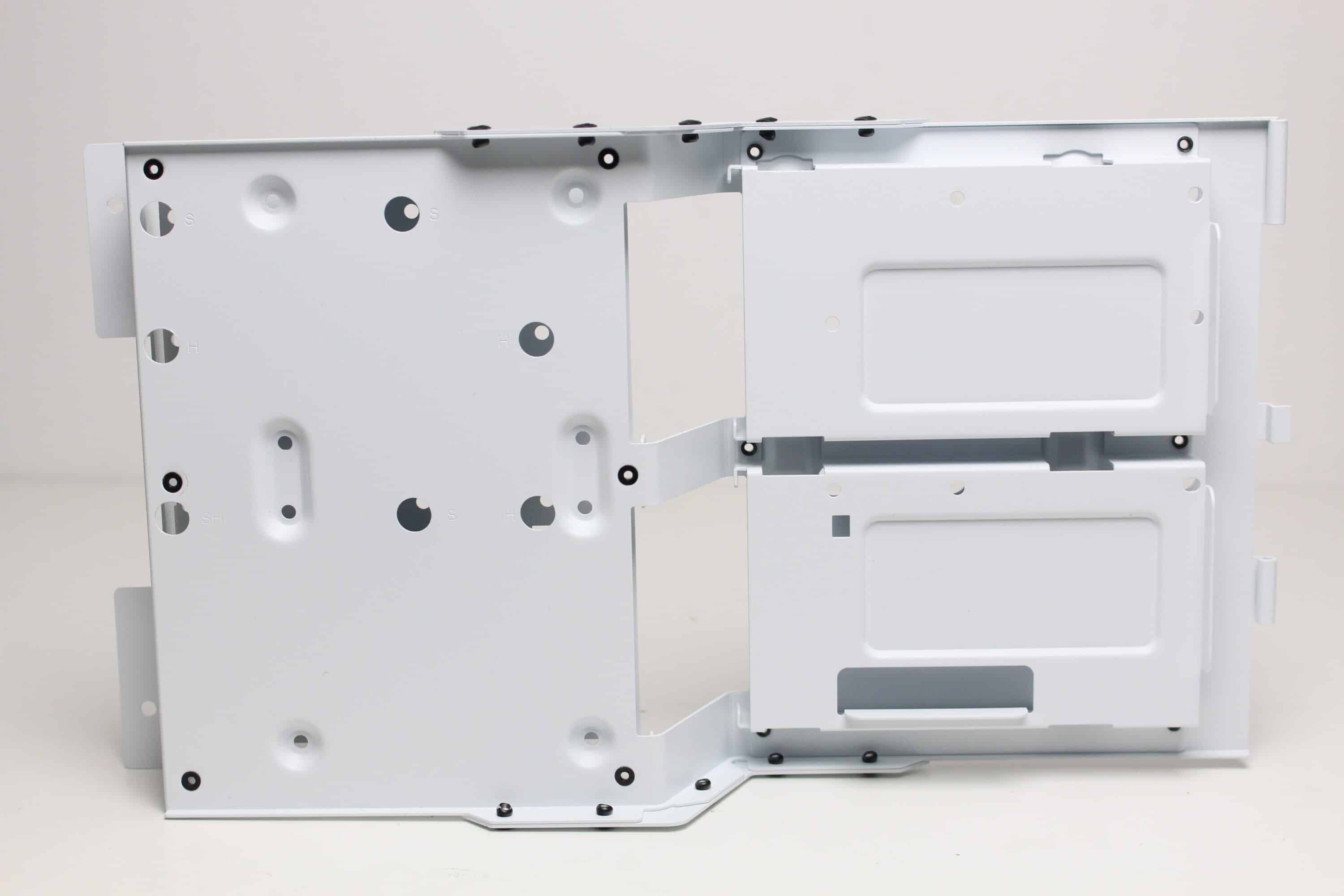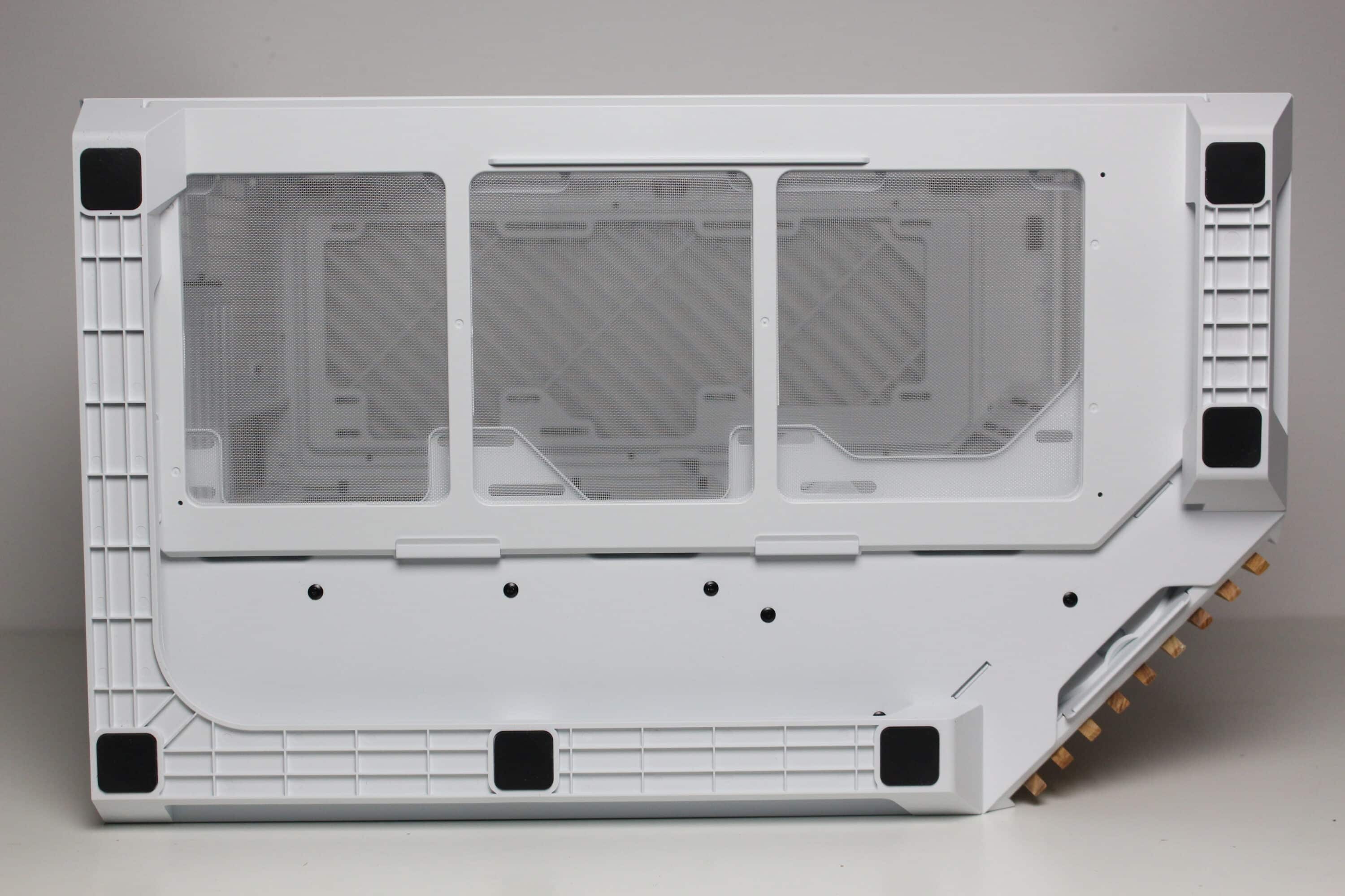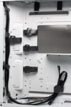 Das Mainboard-Tray ist dabei plan gestaltet, besitzt einen Ausschnitt an der Rückseite und verfügt über neun vorinstallierte Abstandshalter für die Hauptplatine. An der rechten Seite ist das Mainboard-Tray um 45 Grad nach hinten abgewinkelt und wurde mit zwei sehr großen und gummierten Kabeldurchführungen versehen. Zwei ähnliche Öffnungen wurden auch im oberen Bereich und eine weitere unterhalb des Trays platziert. Des Weiteren gibt es unten und oben im Gehäuse sehr viel Platz und Befestigungsmöglichkeiten für Lüfter.