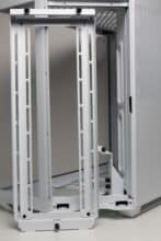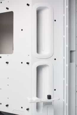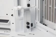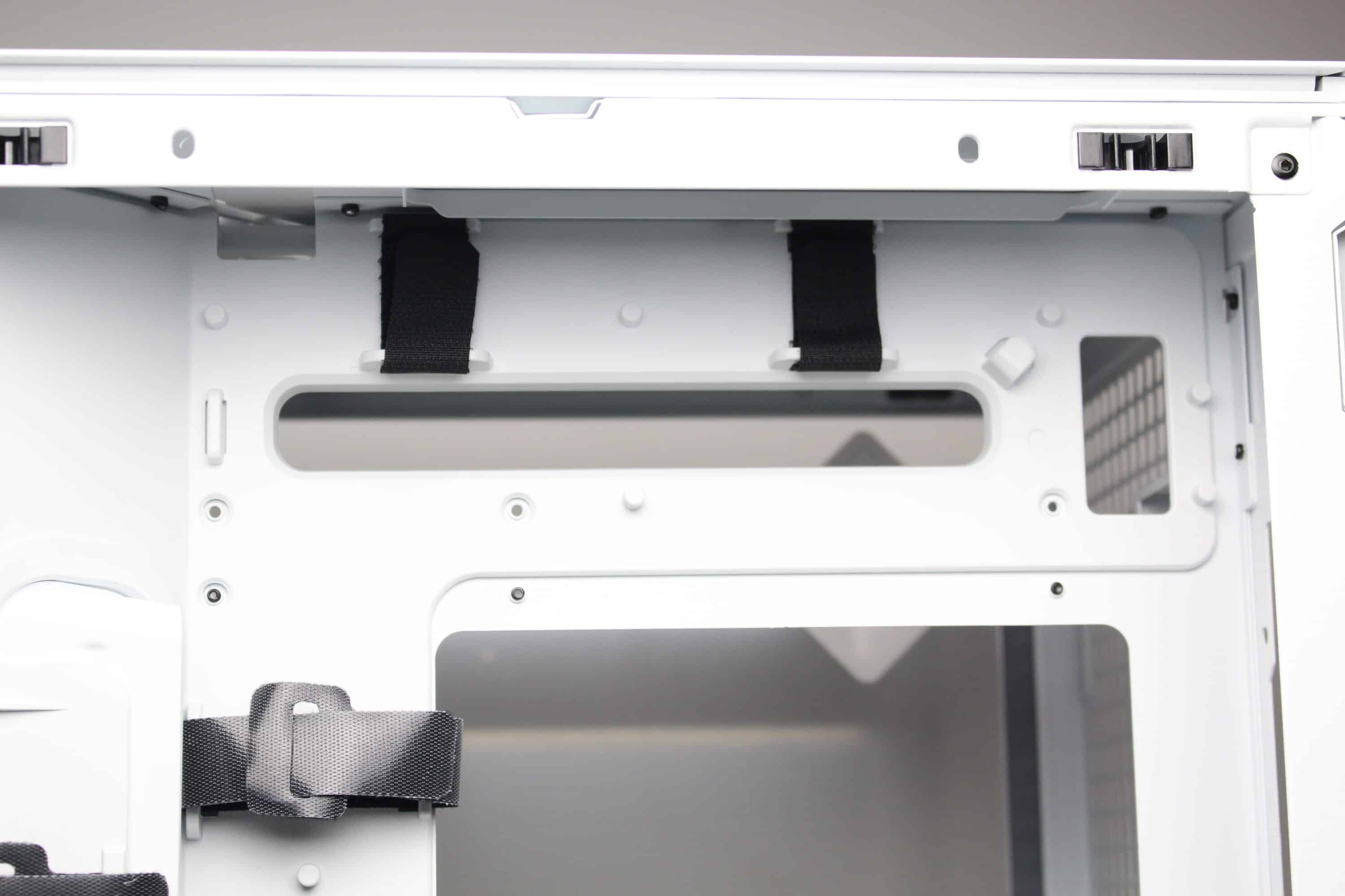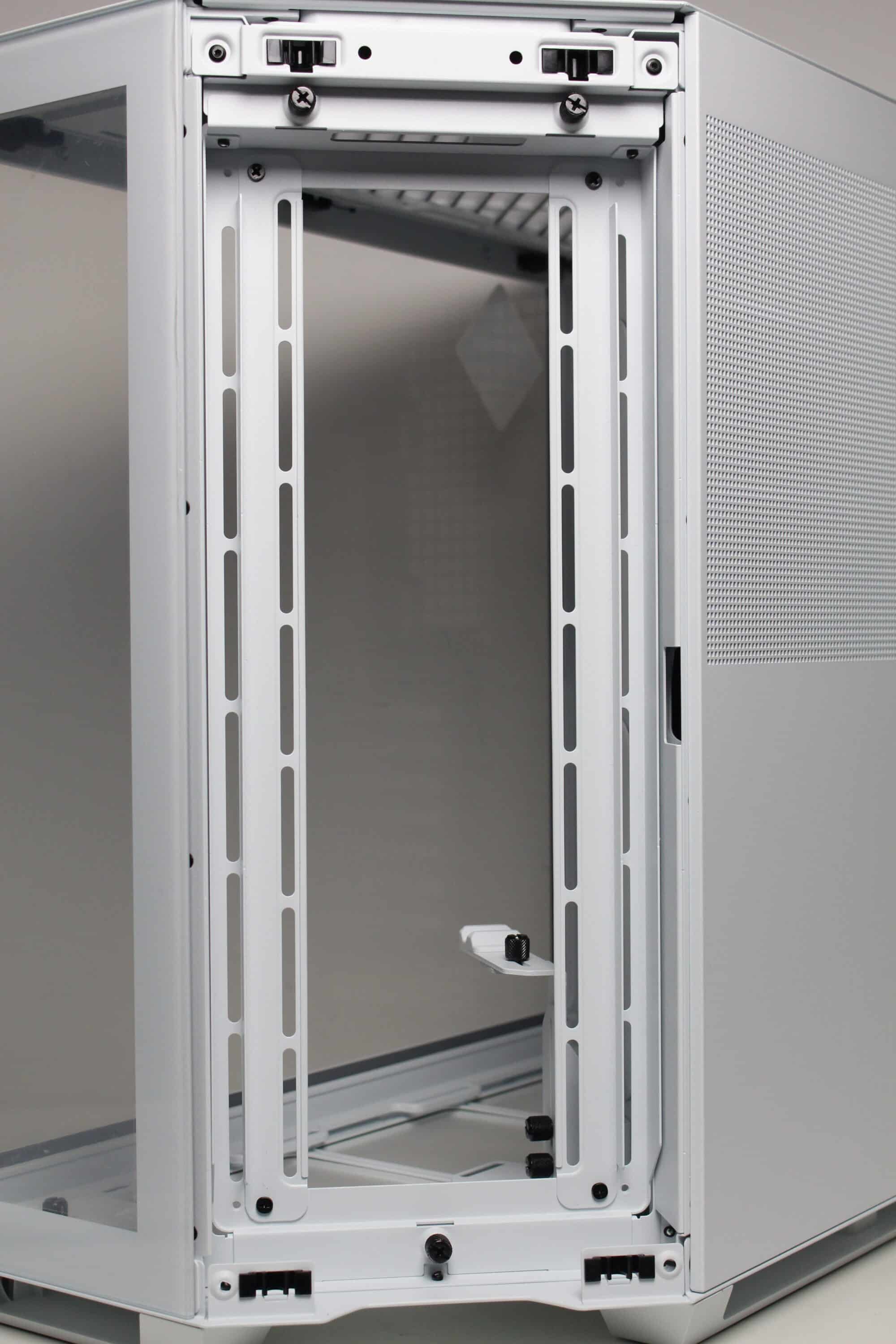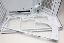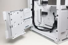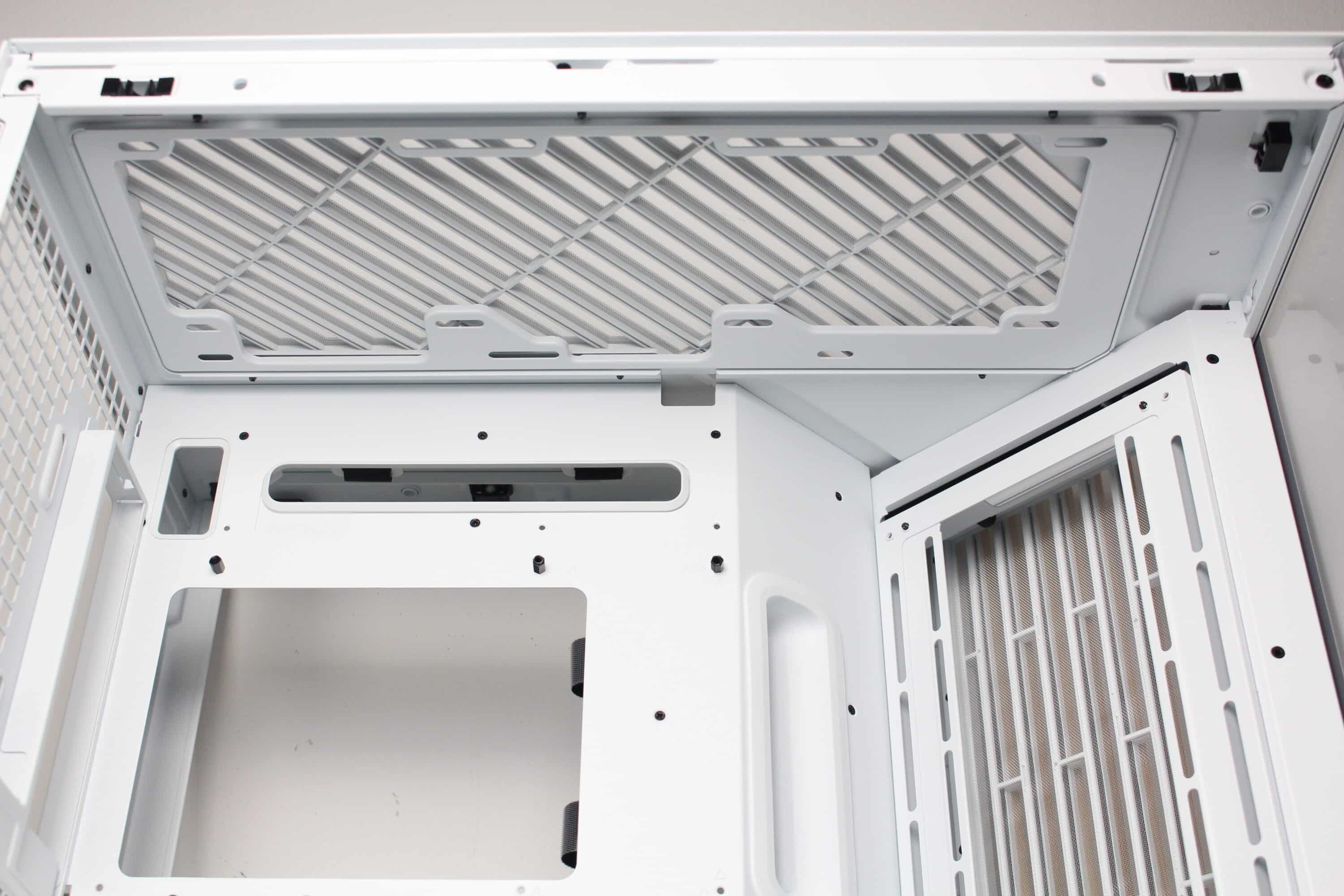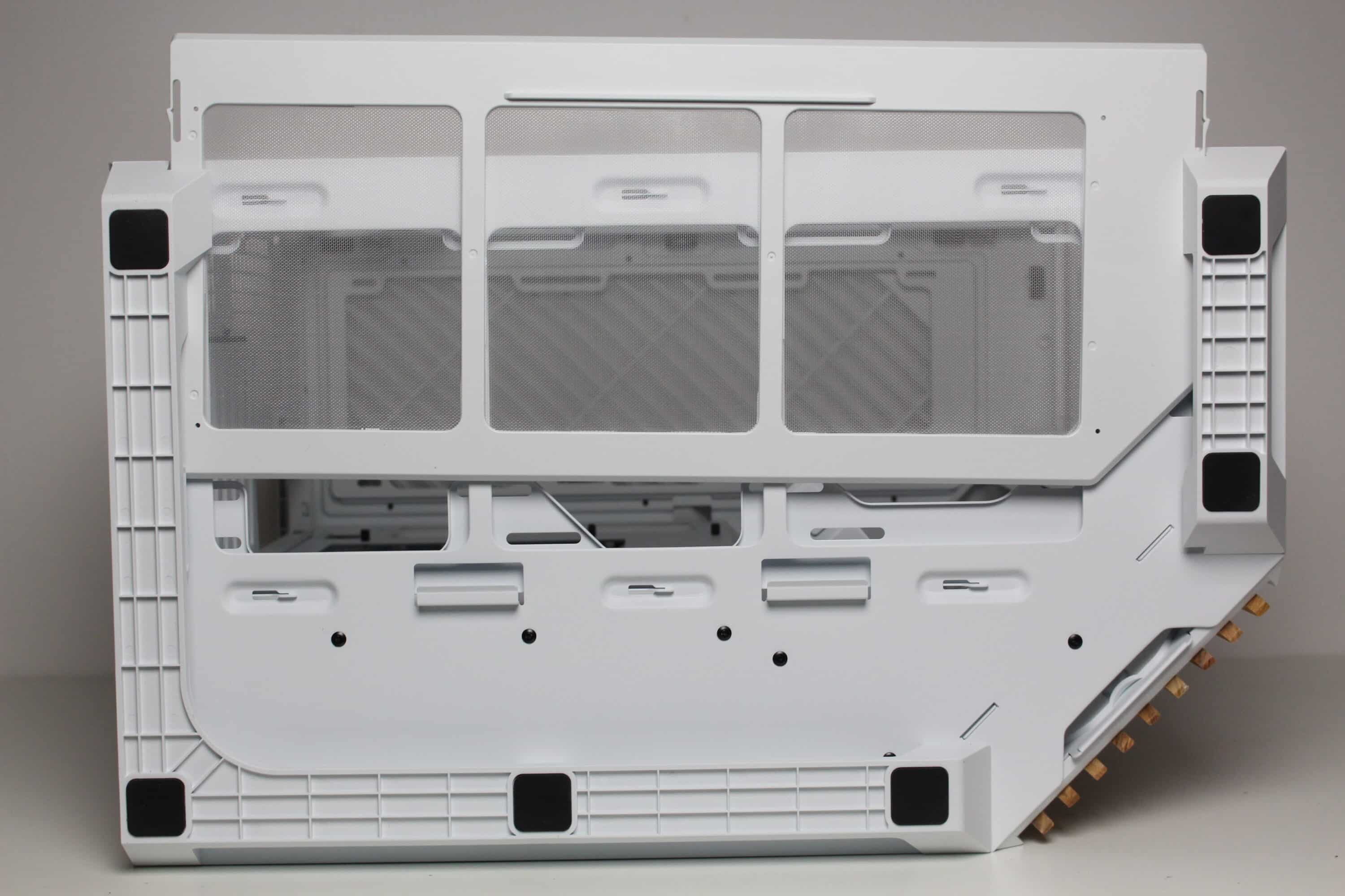 Das Mainboard-Tray ist dabei plan gestaltet, besitzt einen Ausschnitt an der Rückseite und verfügt über neun vorinstallierte Abstandshalter für die Hauptplatine. An der rechten Seite ist das Mainboard-Tray um 45 Grad nach hinten abgewinkelt und wurde mit zwei sehr großen und gummierten Kabeldurchführungen versehen. Zwei ähnliche Öffnungen wurden auch im oberen Bereich und eine weitere unterhalb des Trays platziert. Des Weiteren gibt es unten und oben im Gehäuse sehr viel Platz und Befestigungsmöglichkeiten für Lüfter.
