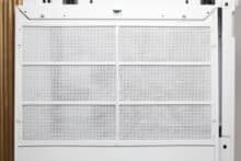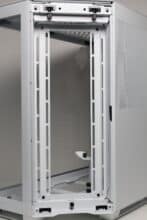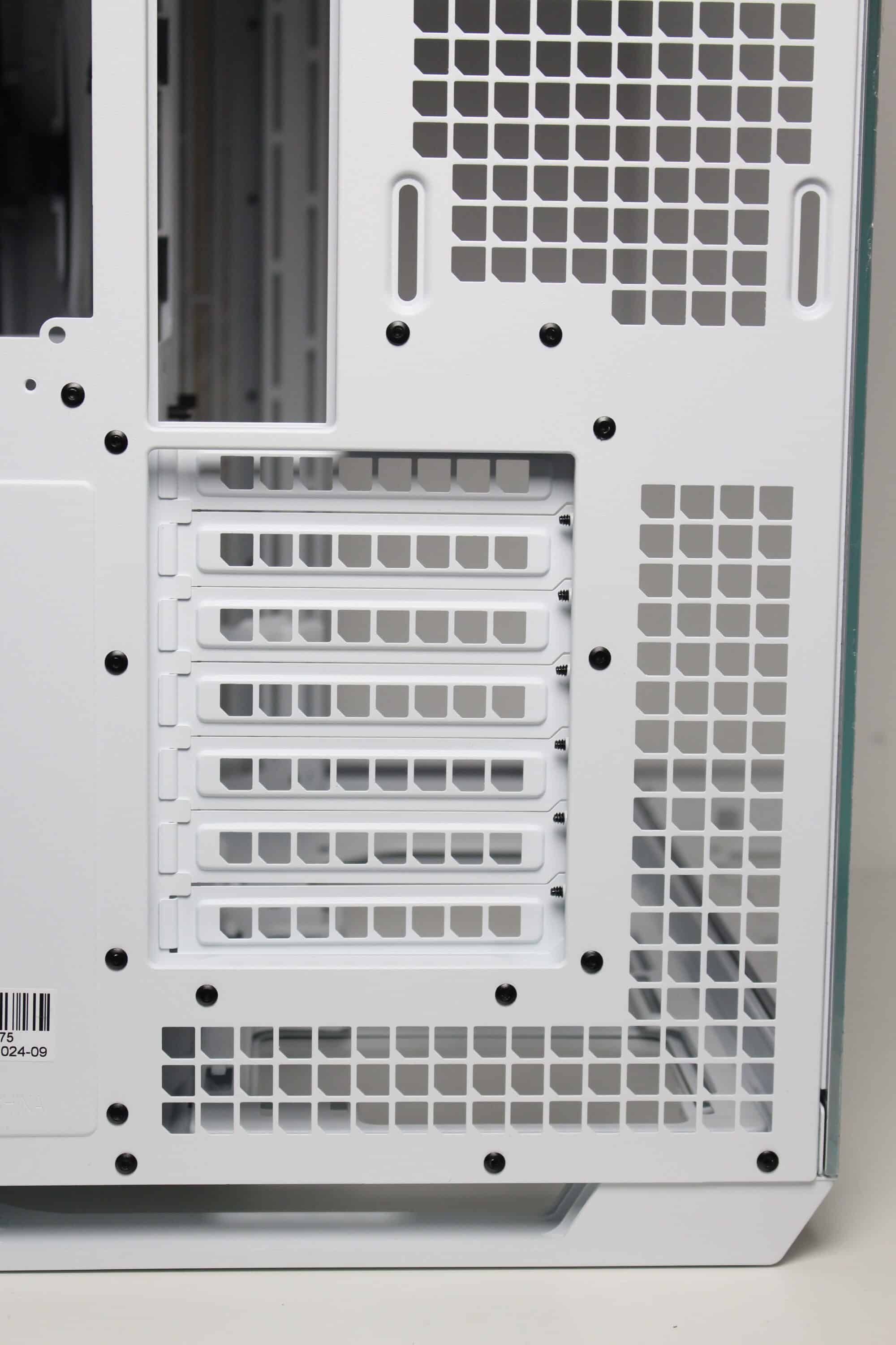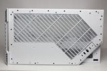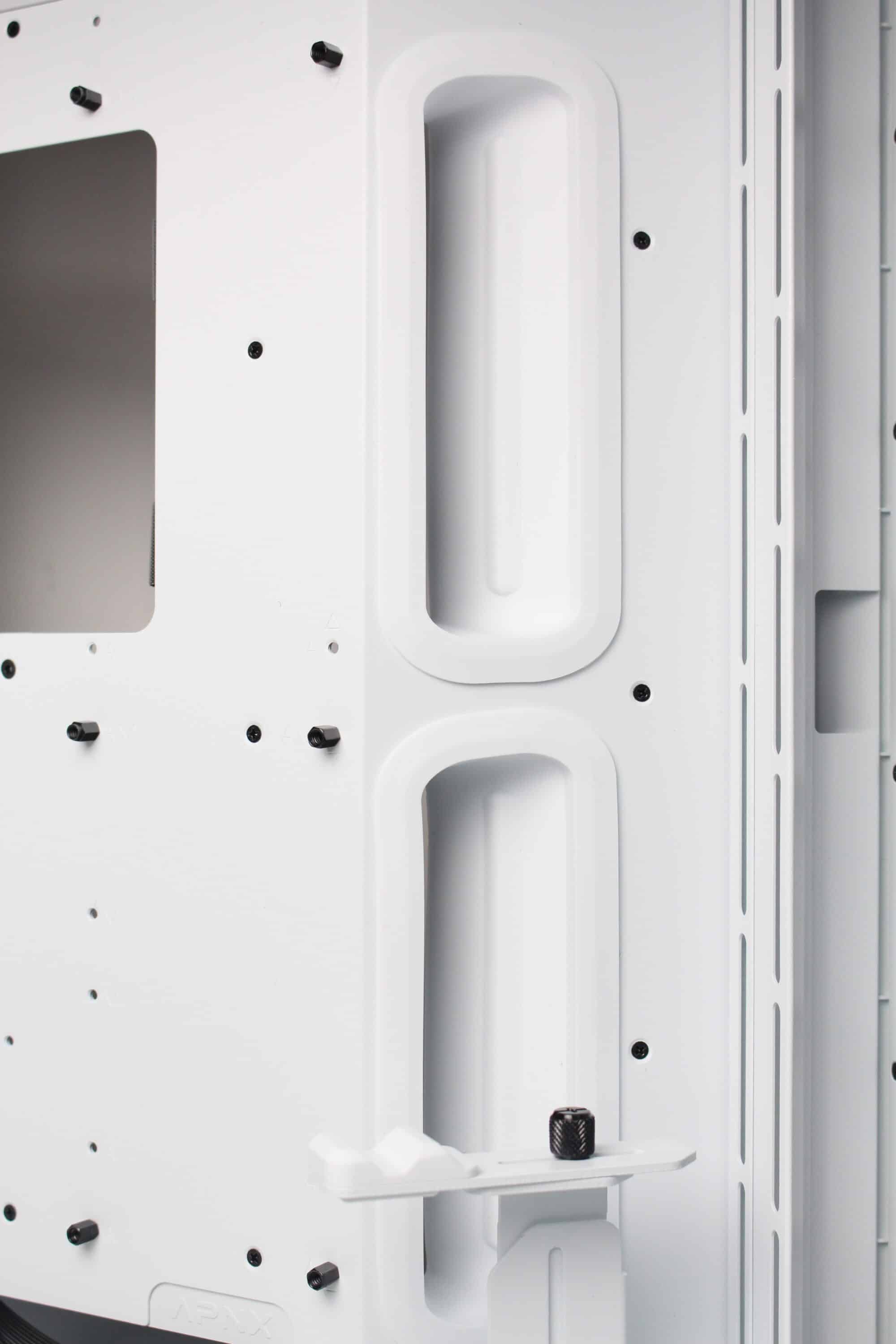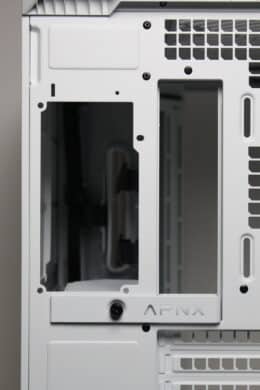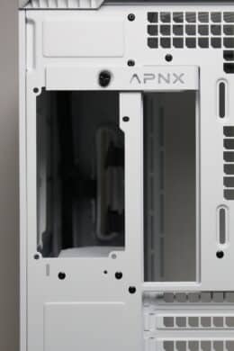 Spätestens mit Blick an die Rückseite des APNX V1 dürfte klar sein, dass bei diesem Midi-Tower ein vertikales Zwei-Kammer-Layout zum Einsatz kommt. Im linken Bereich erkennen wir die Montageöffnung für das Netzteil. Die rechte Seite wird von einem Belüftungsgitter dominiert, bei dem die einzelnen Öffnungen der Formgebung des V1 (Draufsicht) folgen. Ein interessantes Gestaltungsmerkmal mit Liebe zum Detail. Ansonsten erkennen wir an der Rückseite einen Montagepunkt für einen optionalen 120-mm-Lüfter sowie sieben wiederverwendbare PCI-Slotblenden, die im Inneren des Gehäuses verschraubt wurden.