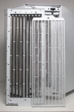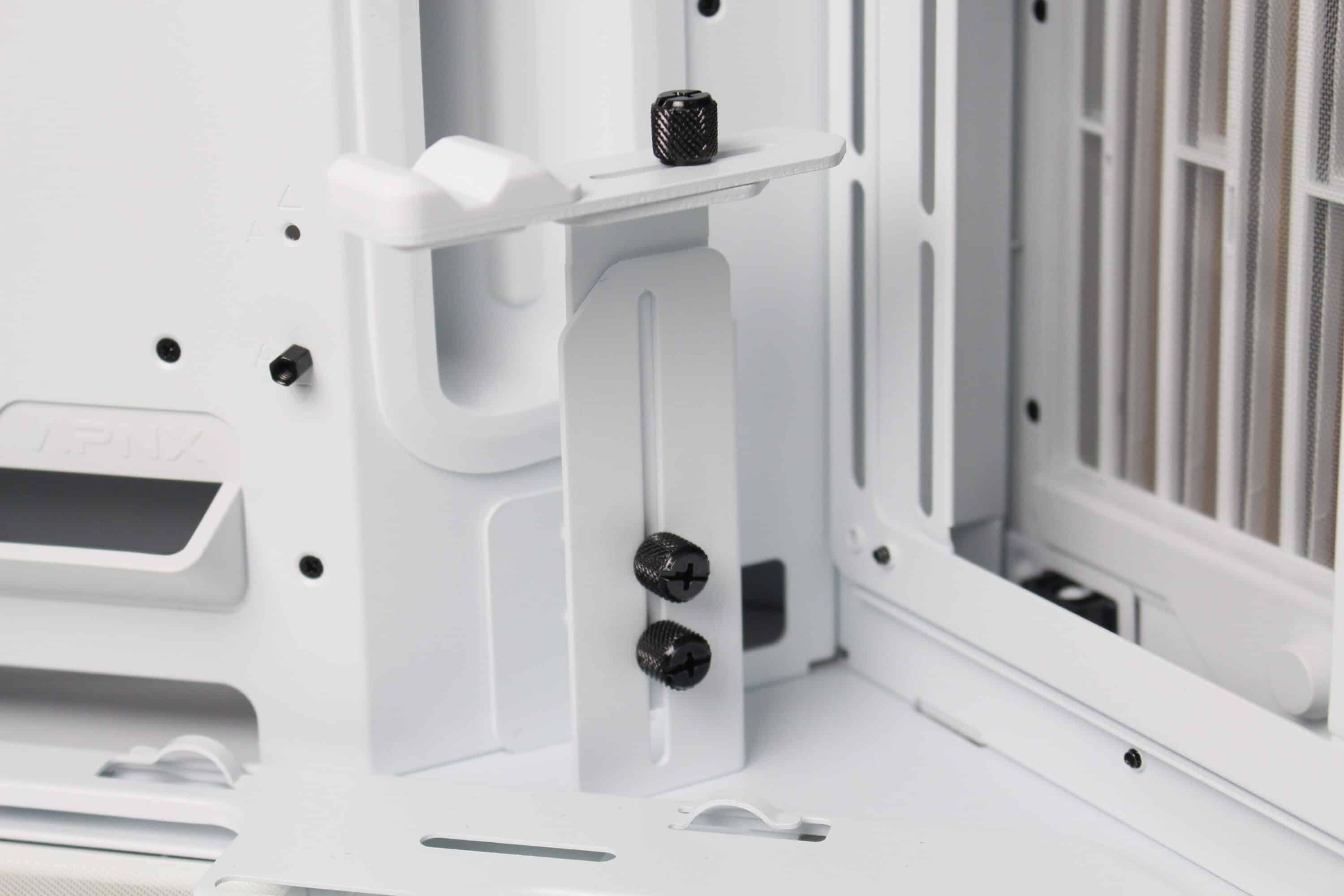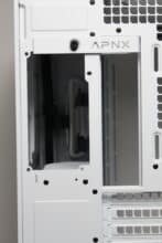Im vorderen Bereich des Innenraums finden wir die Glasscheibe sowie die angeschrägte Belüftungsöffnung inklusive Lüfter- bzw. Radiatorrahmen wieder. Der Airflow optionaler Lüfter wird also ungehindert zur Grafikkarte bzw. zum CPU-Kühler geleitet. Außerdem spendiert APNX dem V1 eine GPU-Halterung. Diese soll verhindern, dass große Grafikkarten schief im Gehäuse hängen. An der Rückseite des Innenraums implementiert APNX eine Montagemöglichkeit für einen 120-mm-Lüfter sowie zahlreiche Belüftungsöffnungen und sieben wiederverwendbare Slotblenden, die im Innenraum verschraubt werden müssen.