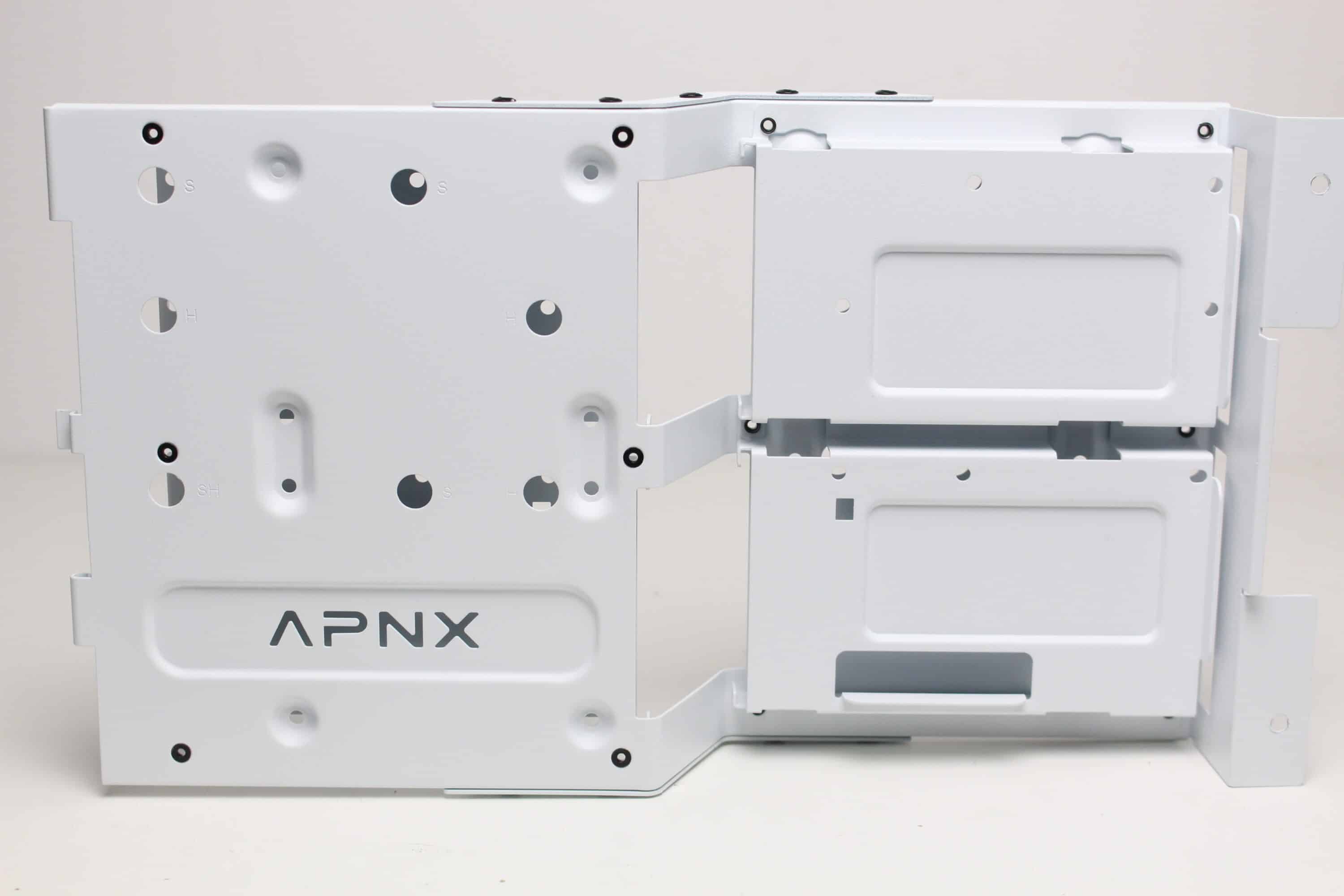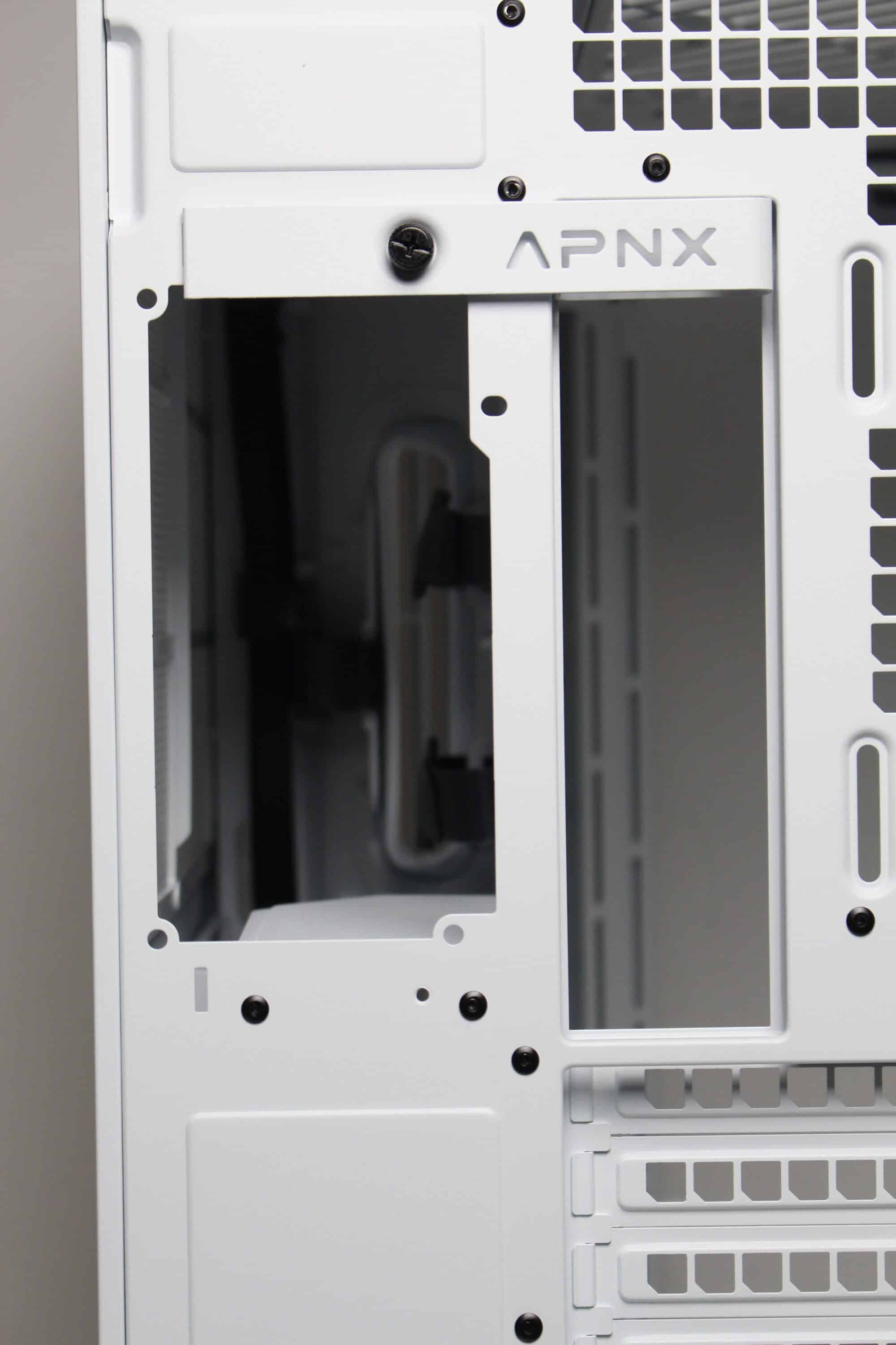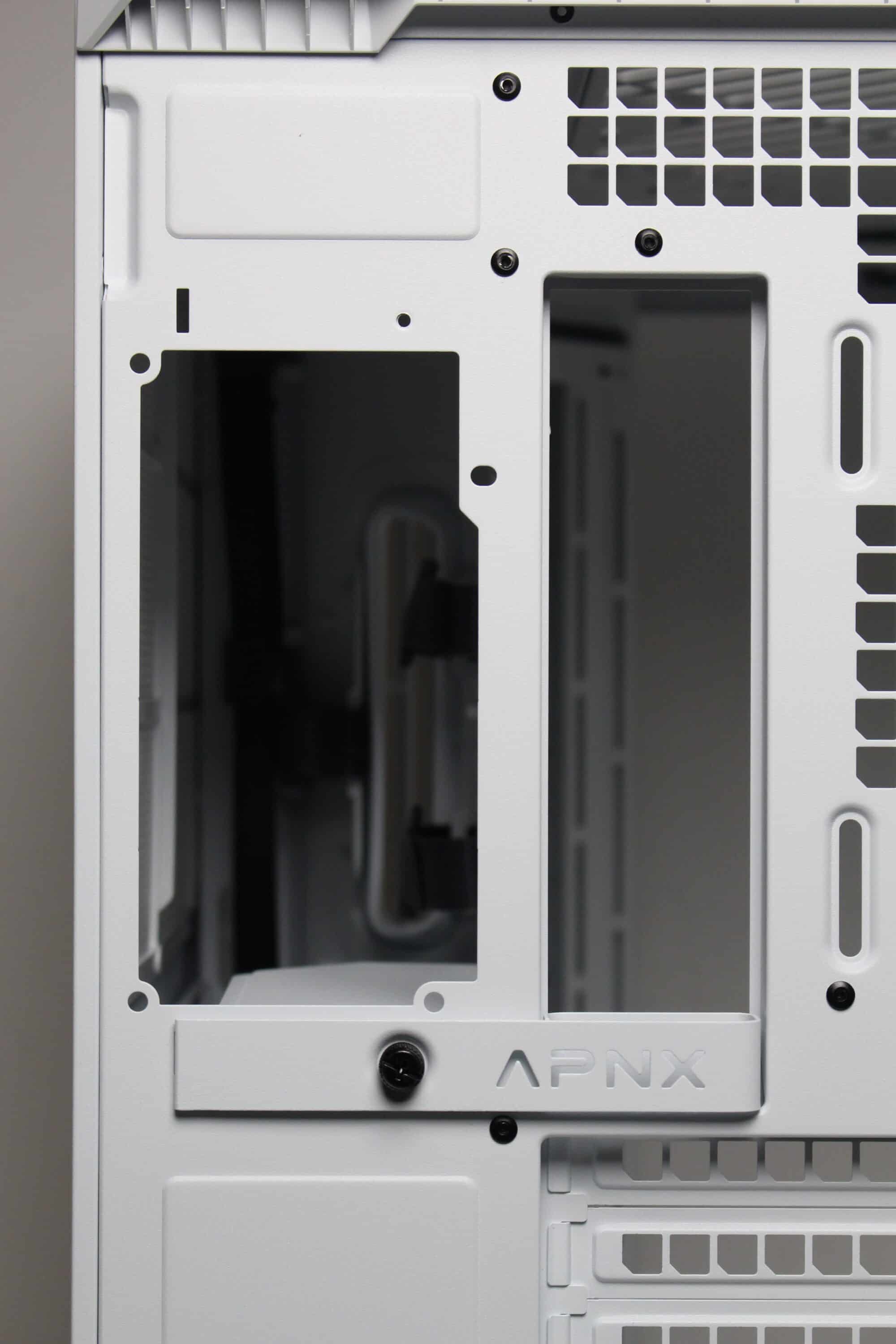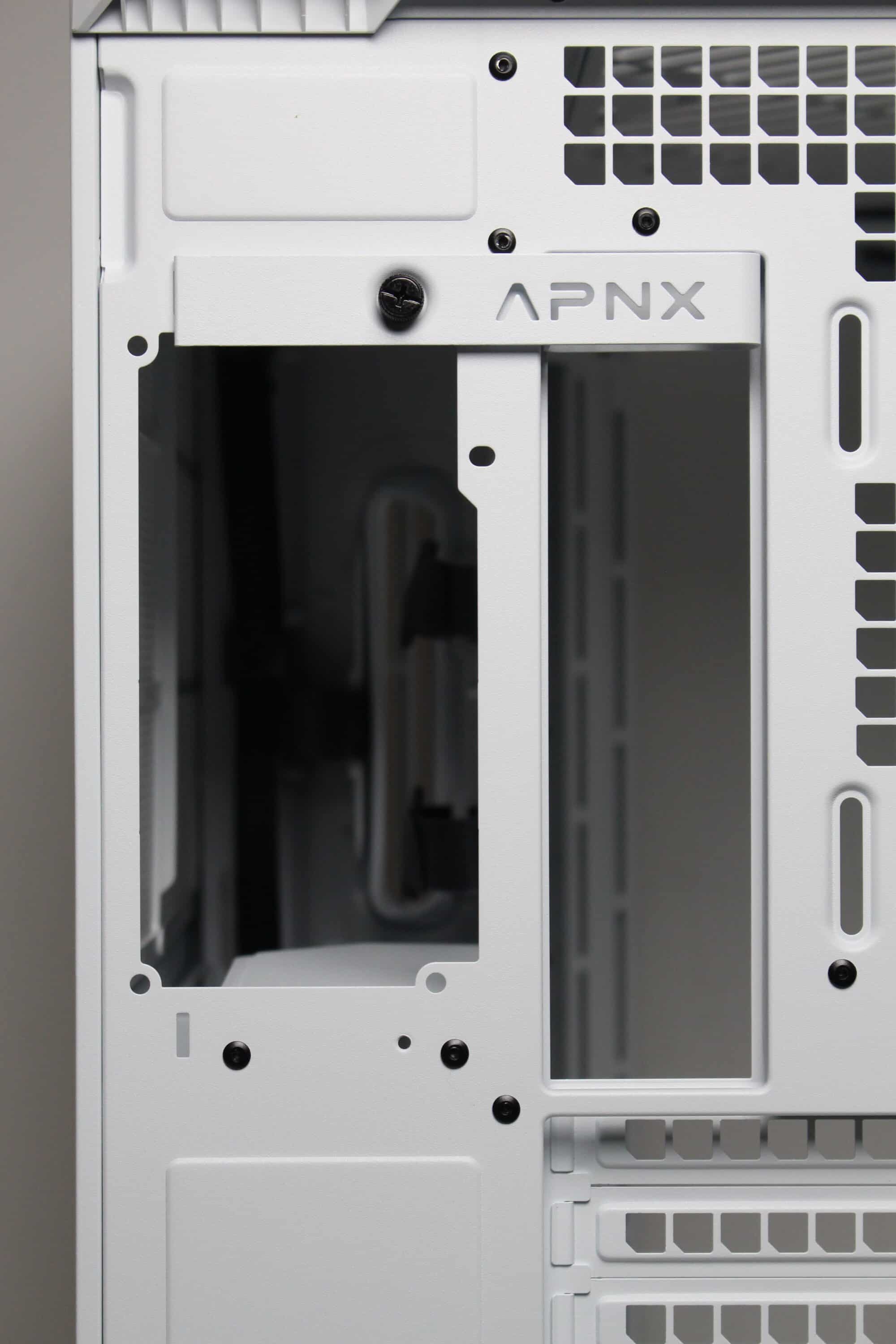 Wer zudem genauer hinschaut, der erkennt mehr Bohrungen im Mainboard-Tray als üblich. Hintergrund ist, dass APNX die Möglichkeit implementiert hat das Mainboard weiter oben oder unten zu befestigen. Damit kann der Käufer also entscheiden ob er oberhalb oder unterhalb des Mainboards mehr Platz braucht, zum Beispiel für einen Radiator. Die bereits erwähnte Stahlblende an der Rückseite dient somit als verschiebbare Halterung für die I/O-Blende.