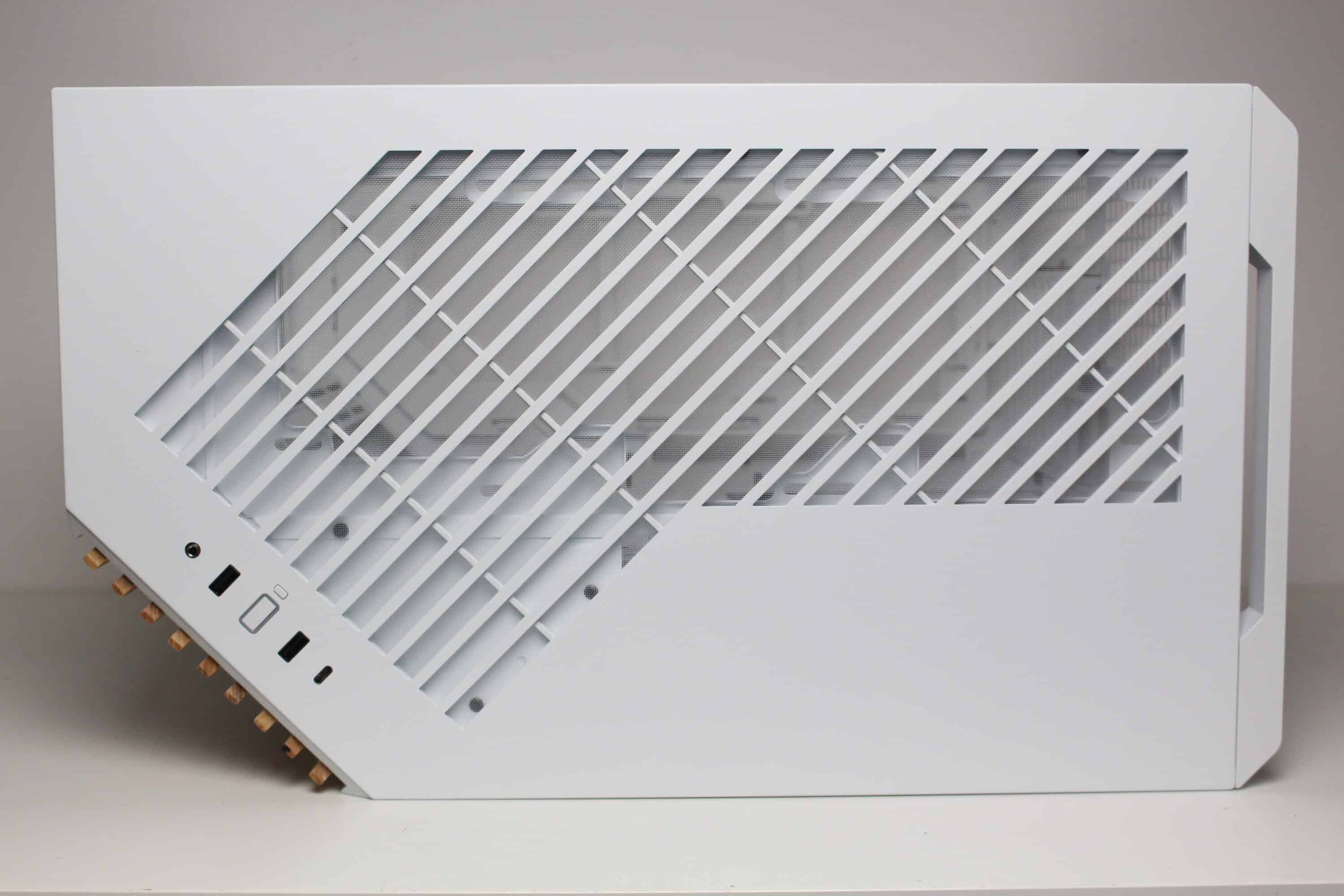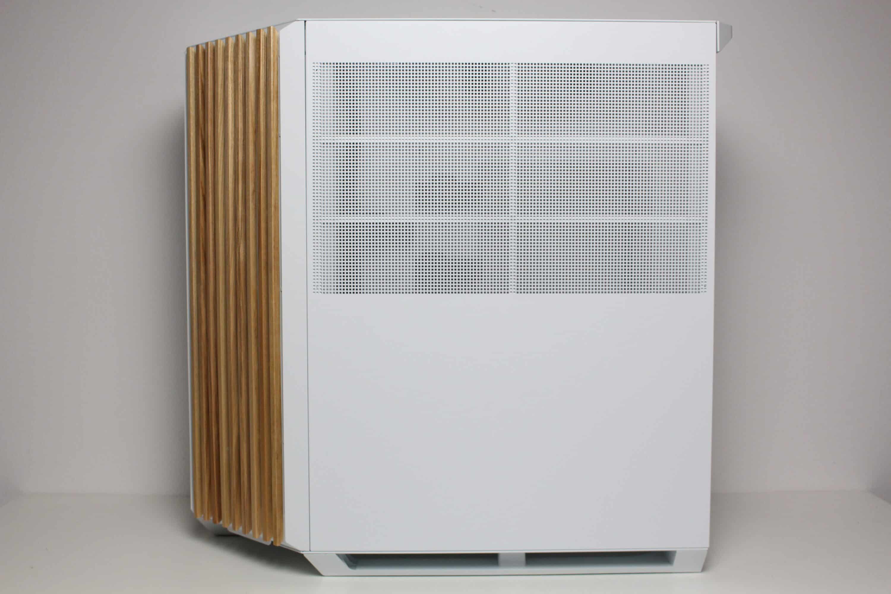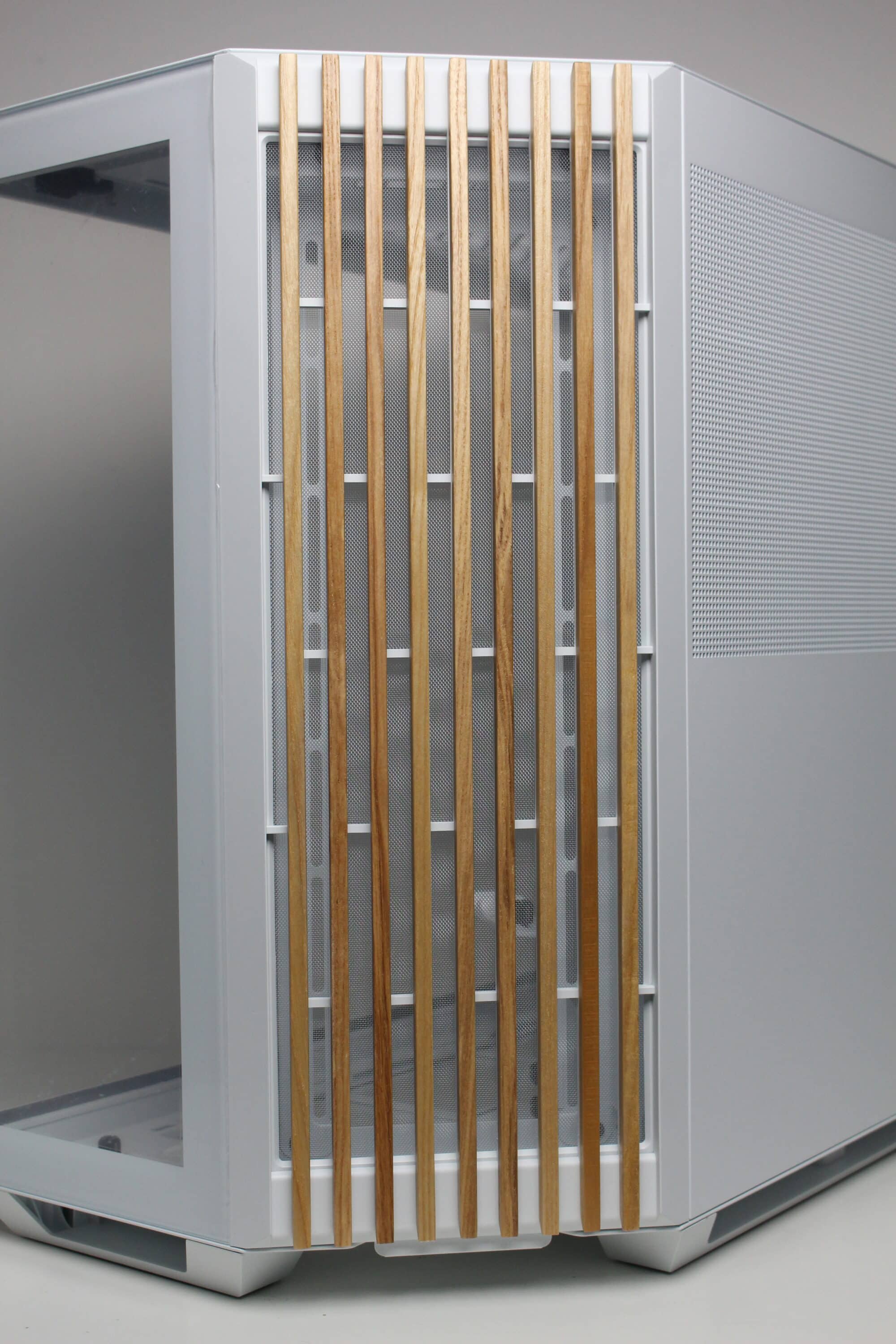 Äußerlich soll das APNX V1 durch eine sehr markante Optik überzeugen. Besonders auffällig ist dabei das Frontpanel, welches an der rechten Seite um 45 Grad nach hinten abgewinkelt ist. Diese abgewinkelte Fläche setzt sich aus einem mit Push-Pins befestigten Rahmen zusammen, der über ein großzügiges Belüftungsgitter inklusive magnetischem Staubfilter verfügt. Dahinter platziert APNX einen modularen Montagerahmen an dem drei 120-mm-, zwei 140-mm- oder zwei 160-mm-Lüfter befestigt werden können. Ob sich an der Front die Holzstreben befinden, hängt von der gewählten Version ab.