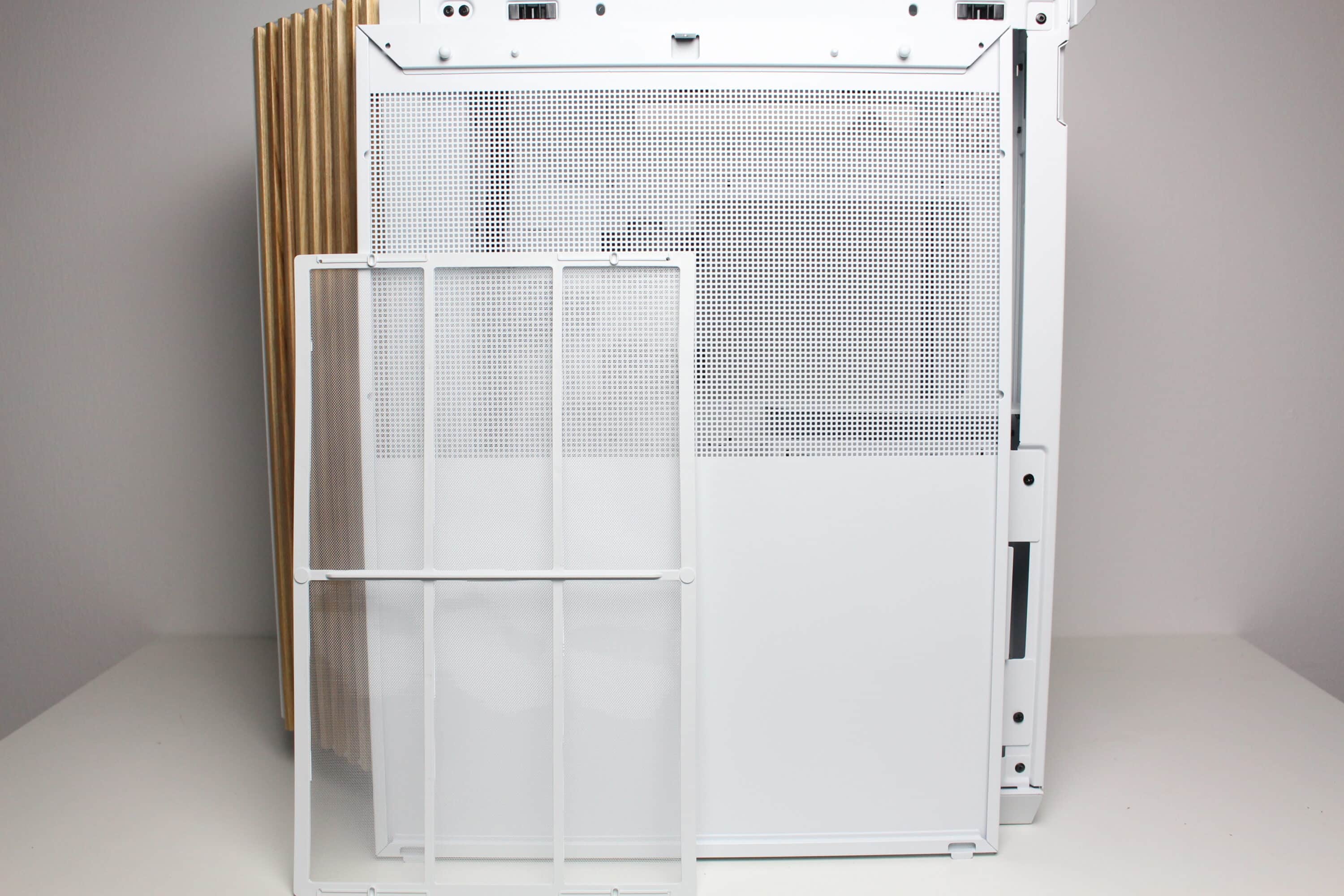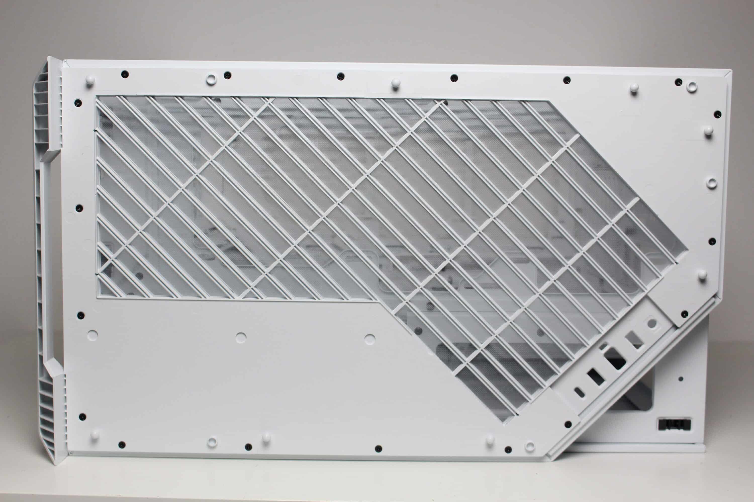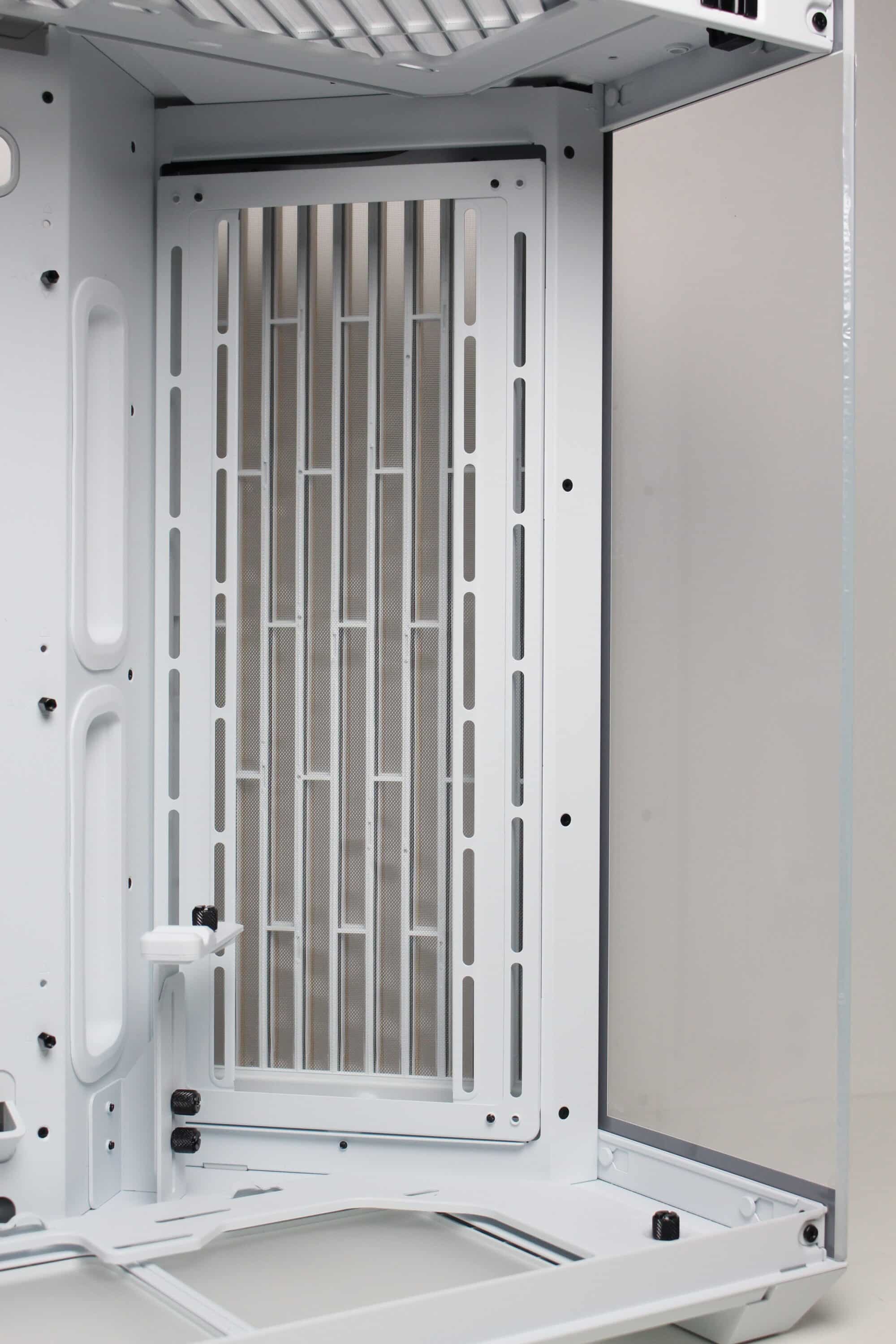 An der linken Seite des APNX V1 finden wir ebenfalls ein Fenster aus vier Millimeter starkem und nicht getöntem Hartglas, bei dem der obere und untere Rand in Gehäusefarbe lackiert wurden. Die Arretierung am Korpus erfolgt über Push-Pins aus Stahl sowie entsprechenden Aufnahmen aus Kunststoff. Eine kleine Griffmulde am Heck erleichtert zudem die Demontage. Das rechte Seitenteil ist sehr stabil, besteht aus 0,8 Millimeter starkem Stahl und verfügt über ein großes und gefiltertes Belüftungsgitter mit einem modularem Filterrahmen. Auch hier erfolgt die Verbindung mit dem Korpus über Push-Pins und eine Griffmulde gibt es für dieses Panel ebenfalls.