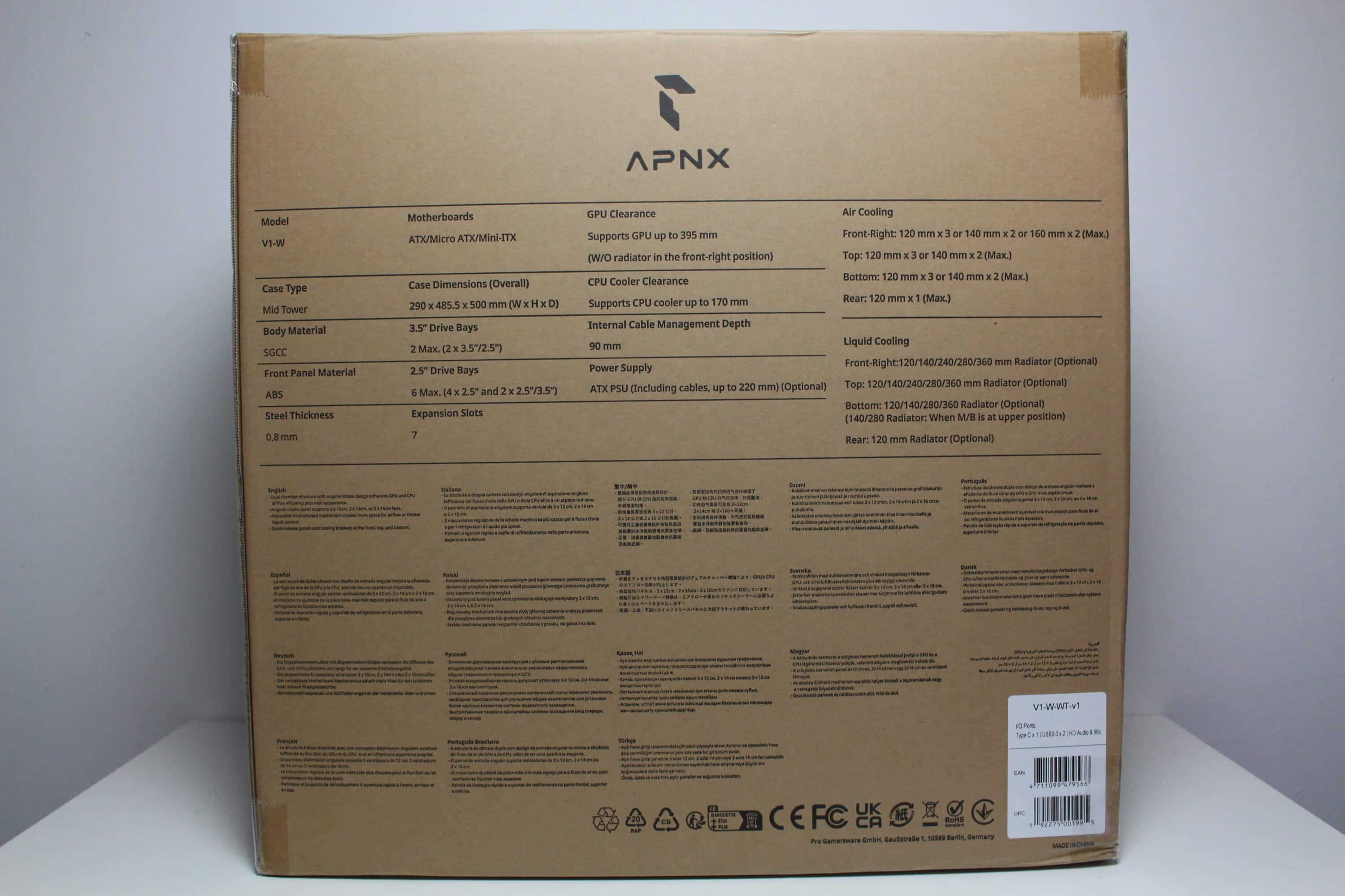 Der Hersteller belässt es in Bezug auf die Umverpackung bei einem großen aber schlicht-braunen Karton, auf dem neben einem schwarzen Schriftzug sowie dem Herstellernamen auch eine Tabelle mit den wichtigsten technischen Daten gedruckt wurden. Darüber hinaus beklebt APNX die Verpackung seitlich mit einem großen Label, welches ein Bild der Farbvariante zeigt und zusätzlich über eine kurze Produktbeschreibung verfügt.