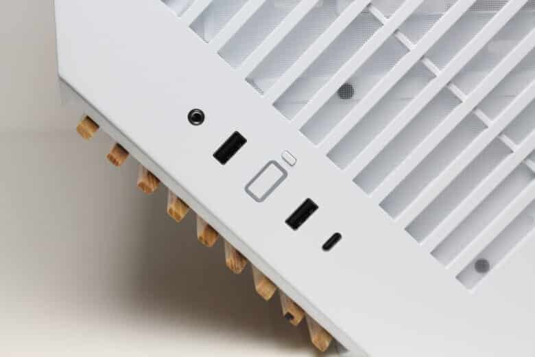Oberhalb des Frontpanels implementiert APNX das I/O-Panel. Dieses besteht aus einem USB-C 3.2 Gen 2 (10 Gbit/s) und zwei USB-A 3.2 Gen 1 (5 Gbit/s) Buchsen. Außerdem gibt es zwei Buchsen für Kopfhörer bzw. Mikrofon sowie einen zentral platzierten und weiß beleuchteten Power-Button bzw. unbeleuchteten Reset-Taster.