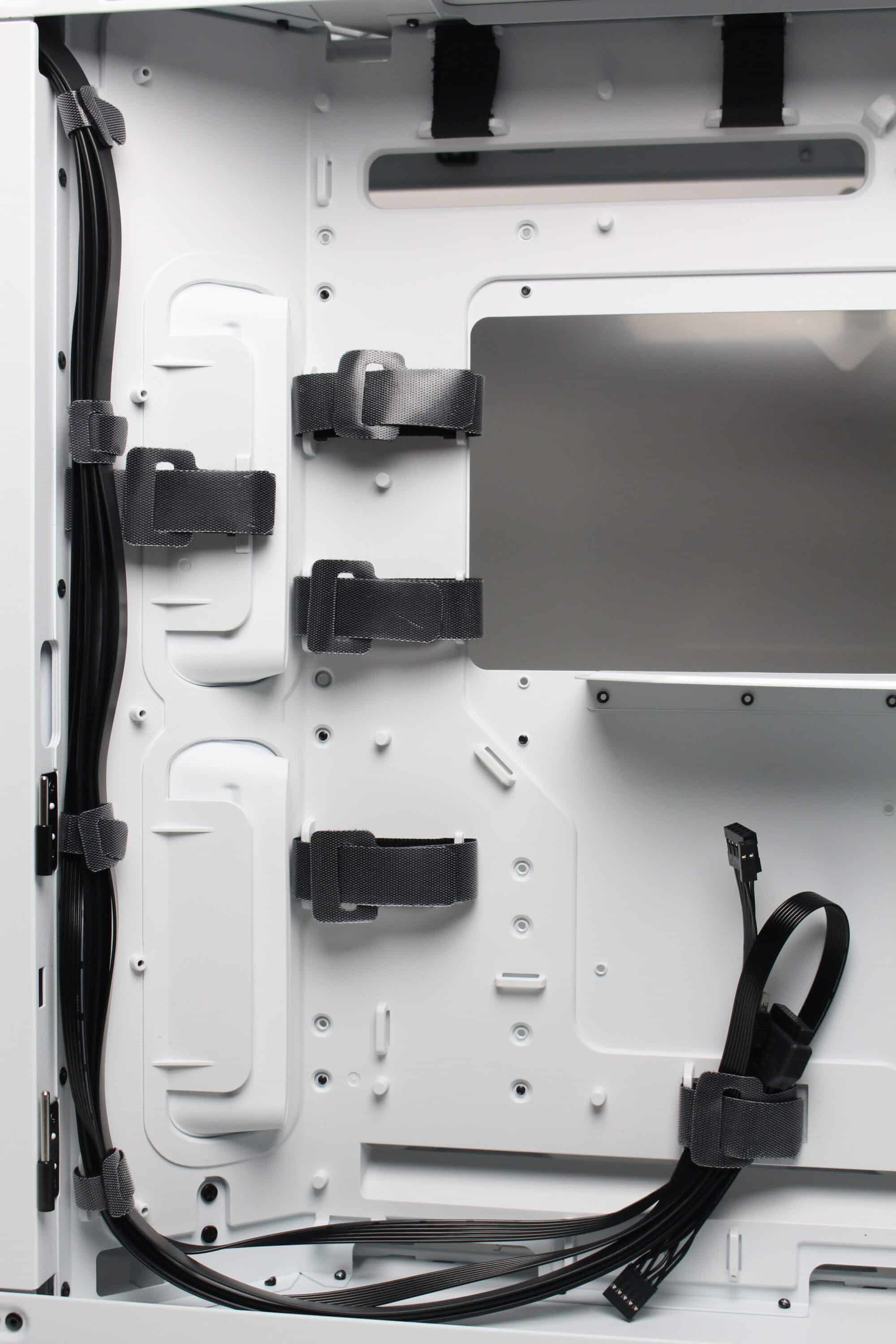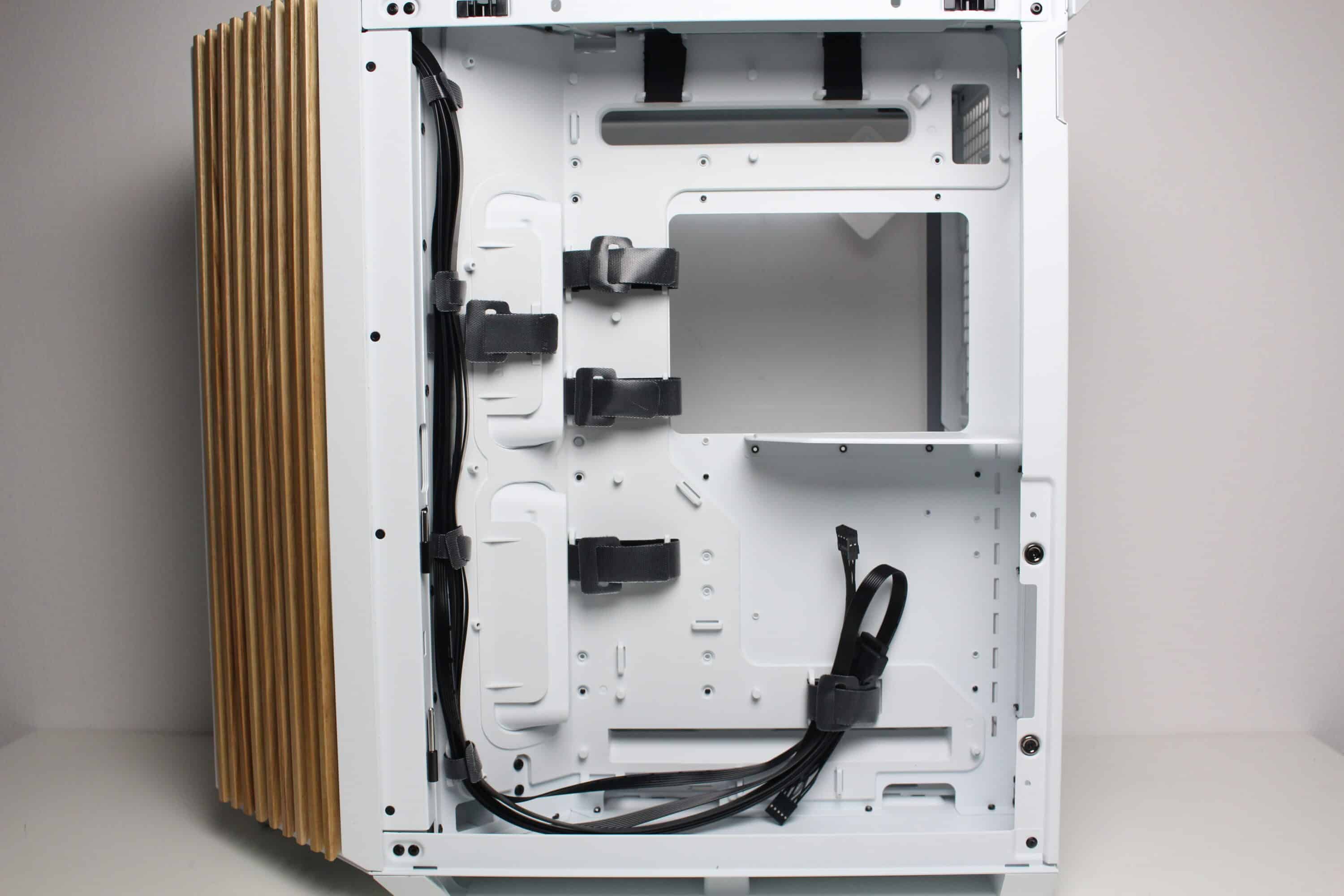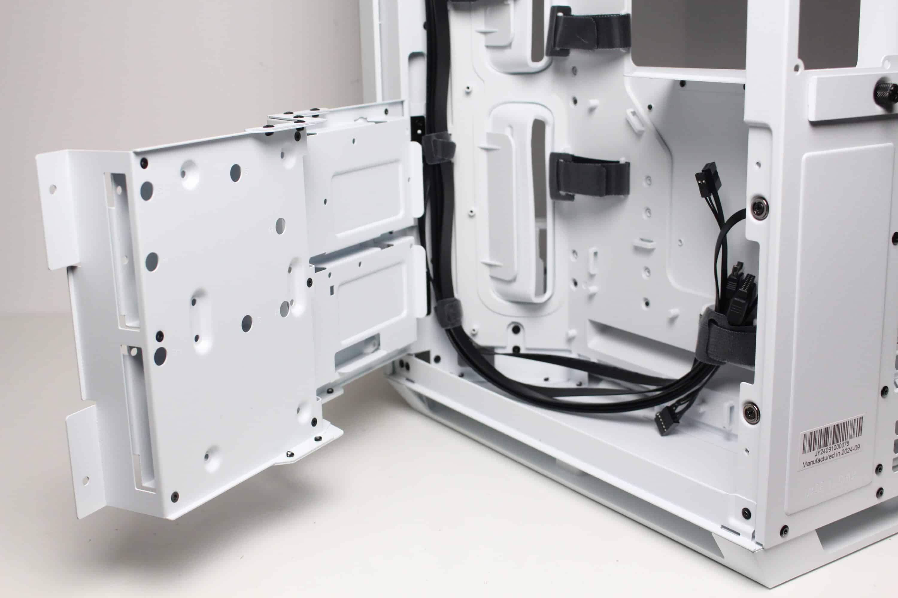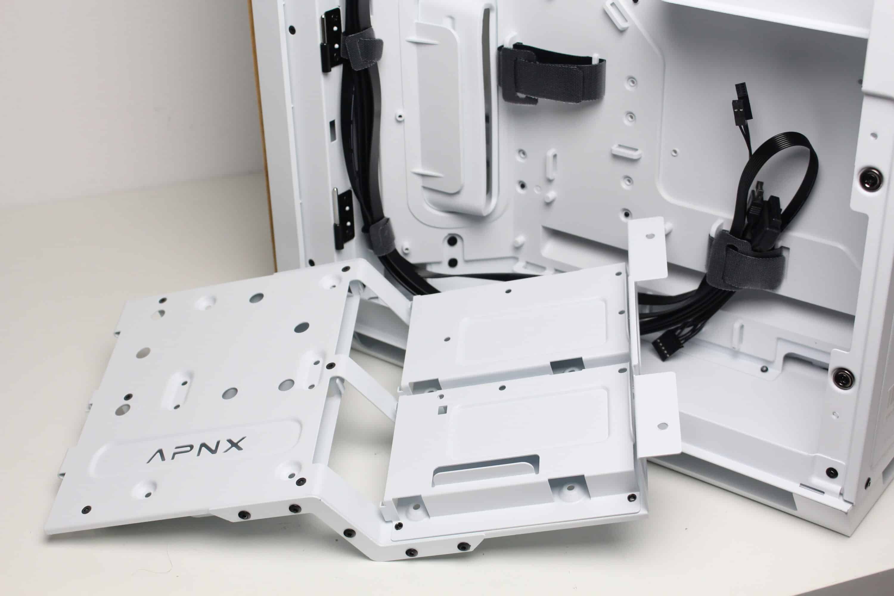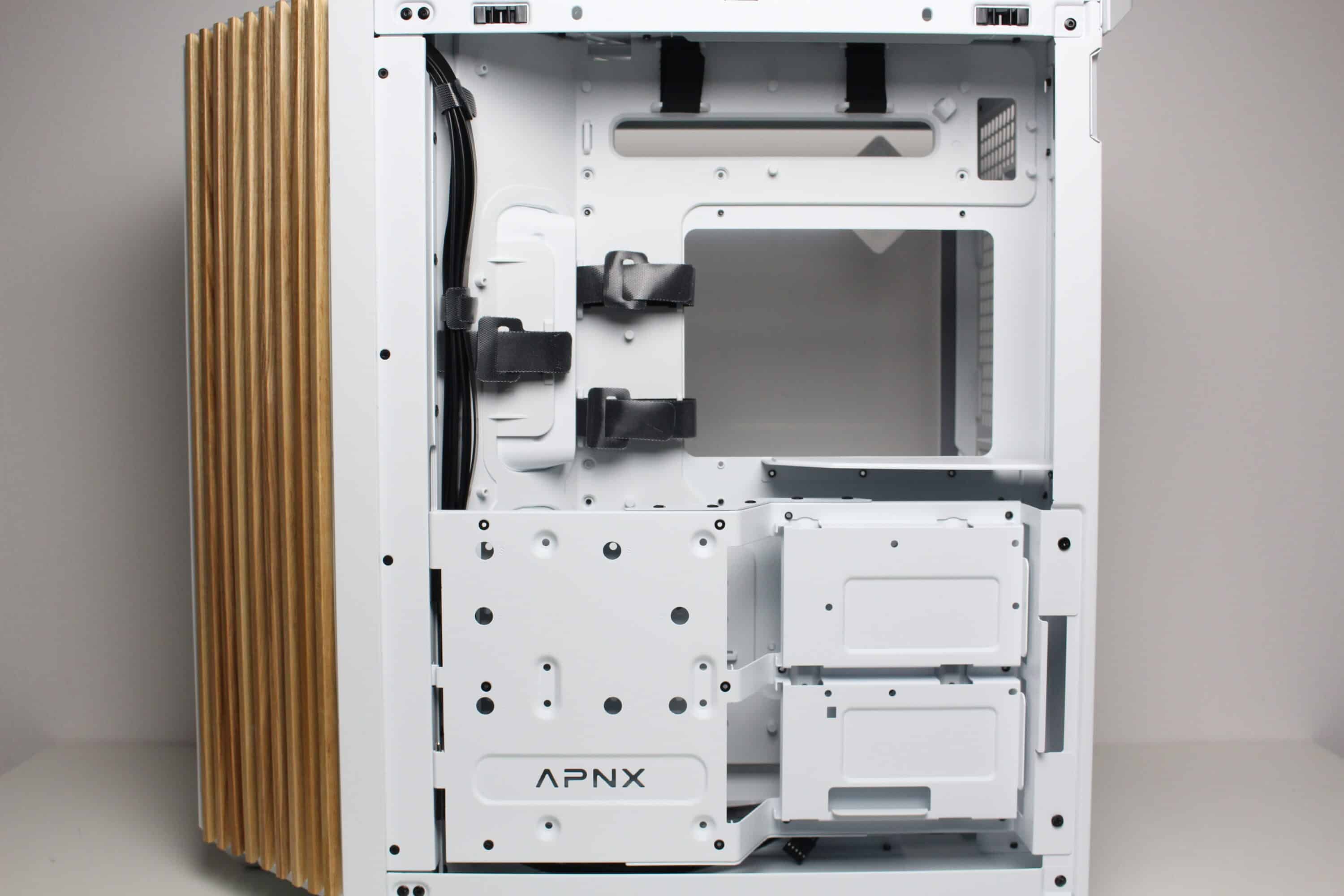 Wenden wir uns nun der zweiten Kammer zu. Diese bietet Platz für ein langes ATX-Netzteil im oberen Bereich sowie zahlreiche Kabellaschen mit Klettverschluss und generell einfach sehr viel Platz für Kabel und weiteres Zubehör wie zum Beispiel eine ARGB-Steuerung. Weiter unten fällt der Blick auf einen interessant aufgebauten Rahmen, den APNX für die Montage von Datenträgern vorsieht.