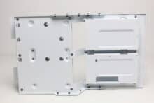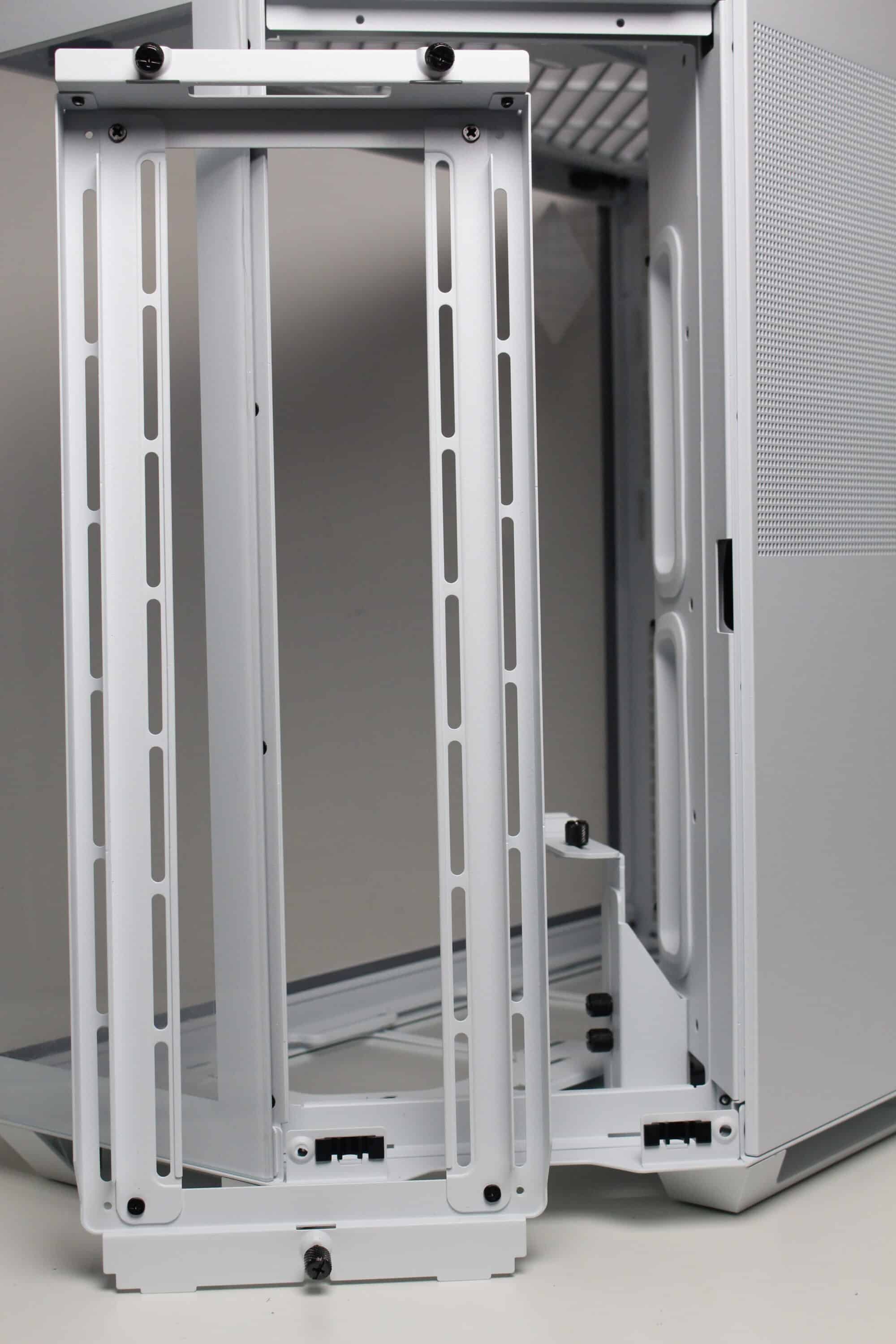 Dieser massive Rahmen besteht aus Stahl und kann aufgeklappt werden. Ab Werk wird er von zwei Schrauben gehalten, verfügt zusätzlich aber auch über Magneten. Bei Bedarf kann der Rahmen zur Montage der Datenträger auch komplett ausgebaut werden. Er bietet Platz für zwei 3,5″- oder zwei 2,5″-Festplatten und zusätzliche Montagemöglichkeiten für vier weitere 2,5″-SSDs. Der Einbau erfordert immer Werkzeug und eine Entkopplung gibt es nicht. Dennoch ist die Art und Weise der Implementierung ausgezeichnet.