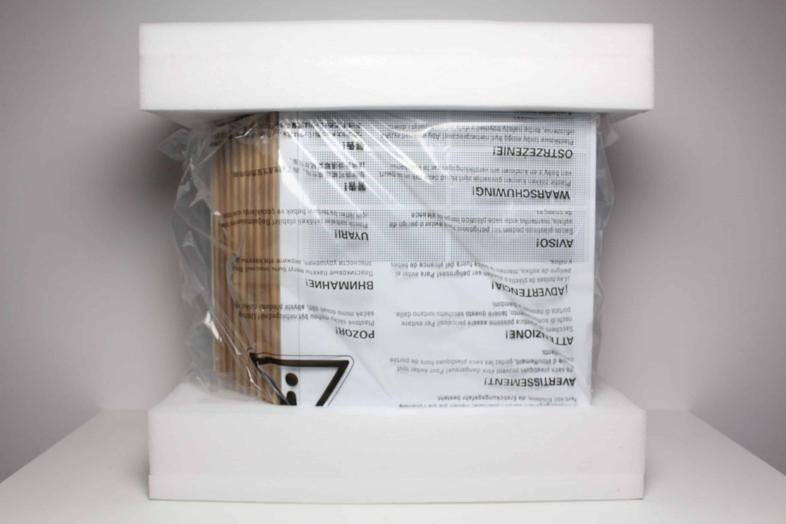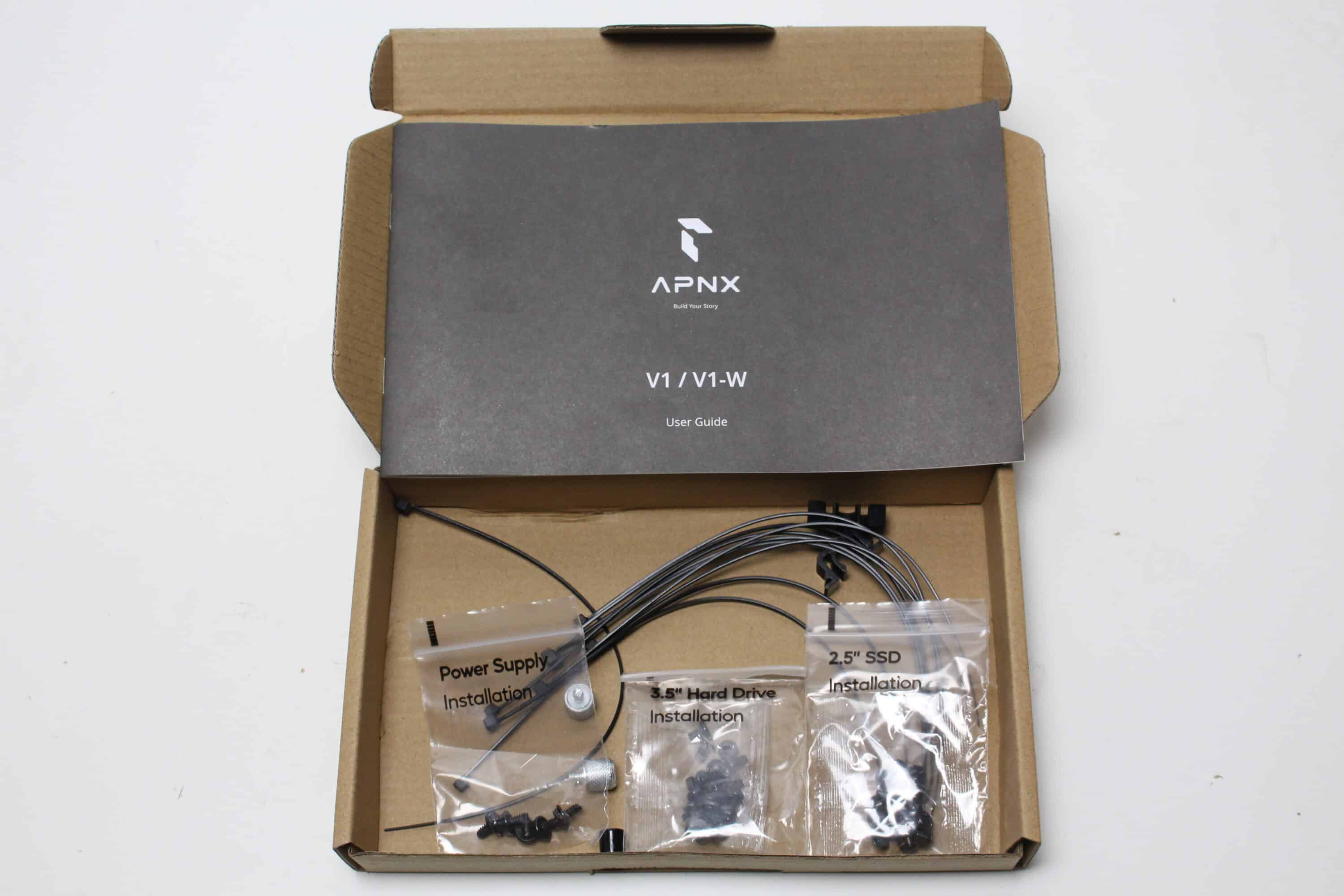 Im Inneren hüllt APNX das V1 in zwei Blöcke aus weichem Schaumstoff sowie eine Folie aus Kunststoff um Kratzer auf dem Gehäuse zu verhindern. Zusätzlich wurden die Glaselemente mit jeweils zwei Schutzfolien beklebt. Das Montagezubehör sowie die Einbauanleitung platziert der Hersteller in einer kleinen braunen Schachtel, die Platz in einem der Schaumstoffblöcke gefunden hat. Diese Schachtel beinhaltet alle notwendigen Montageschrauben sowie einen Schraubendreheraufsatz, einige Kabelbinder und zwei Ersatzteile für die Push-Pin-Halterungen.
