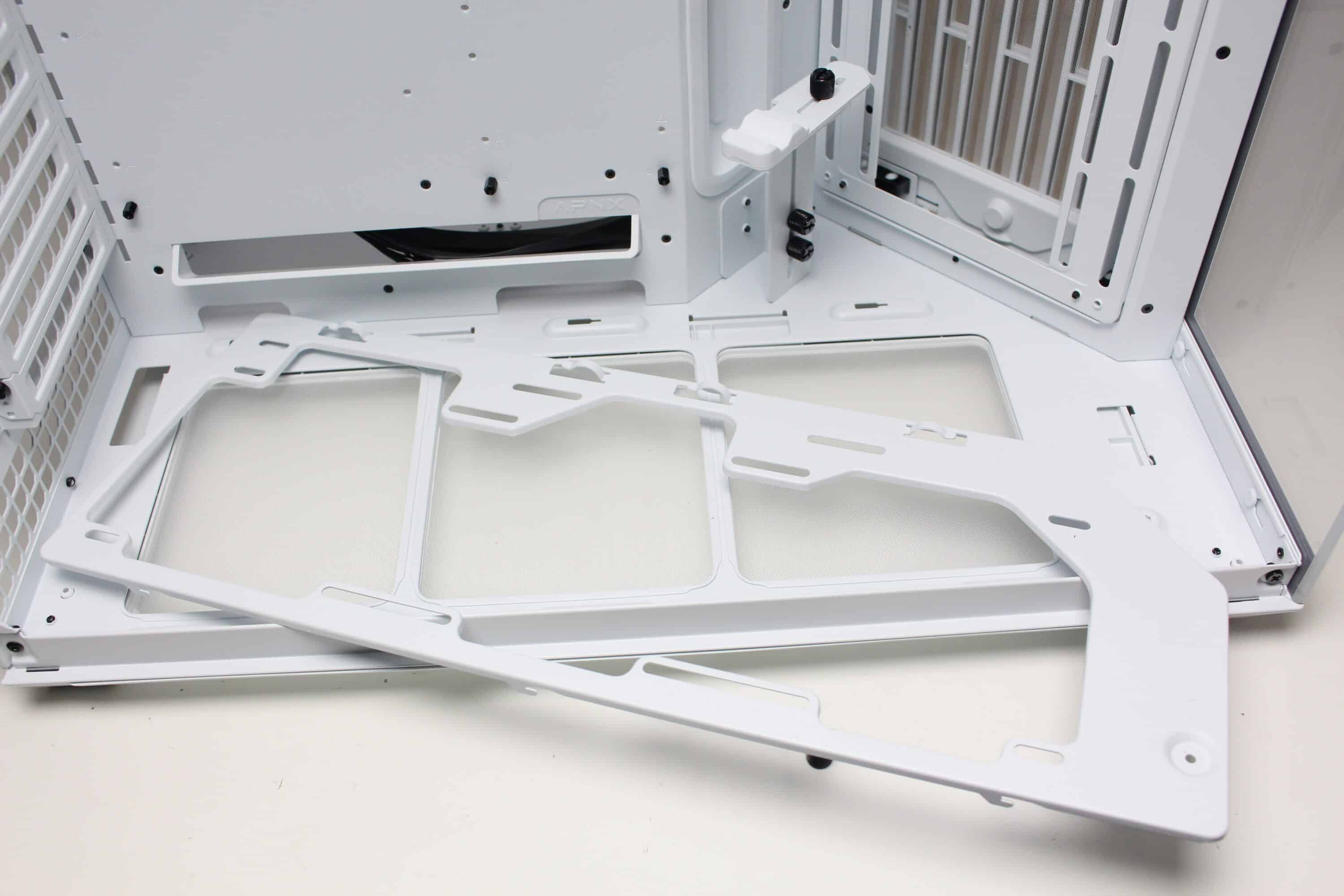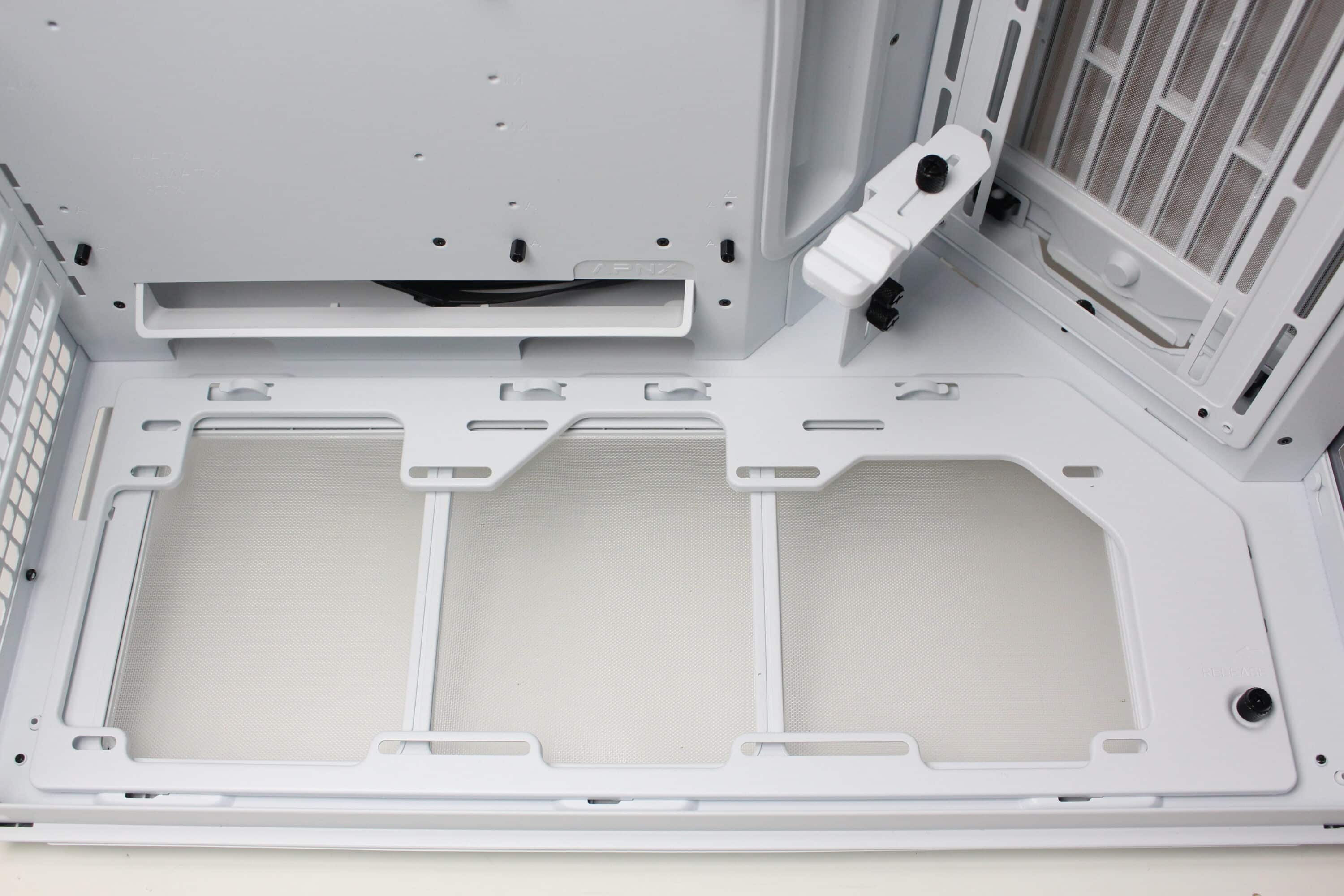 Die Unterseite des APNX V1 ist zur Gewährleistung eines sehr hohen Airflows ausgelegt. So gibt es anstatt eines Belüftungsgitters lediglich Montageschienen für drei 120-mm- oder zwei 140-mm-Lüfter sowie drei große Ausschnitte. Damit hier nicht einfach sämtlicher Staub eingesogen wird, positioniert der Hersteller vor der Öffnung einen feinmaschigen Staubfilter, der seitlich herausgezogen werden kann. Für einen sicheren Stand sorgen ein großer, rechtwinkliger Standfuß am Heck und der rechten Seite sowie an der Front. Beide Standfüße bestehen aus Kunststoff und wurden zusätzlich mit Gummipuffern beklebt.