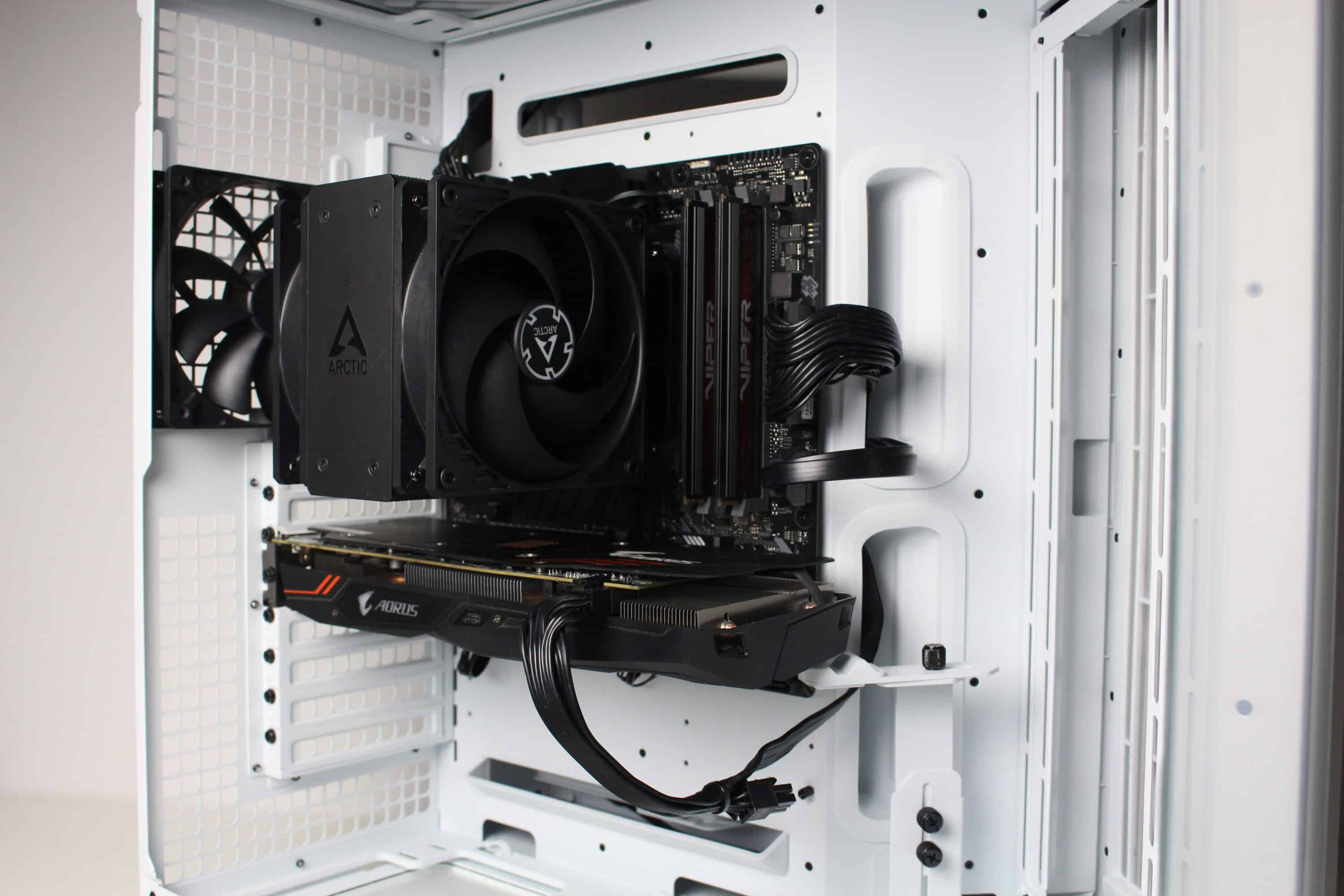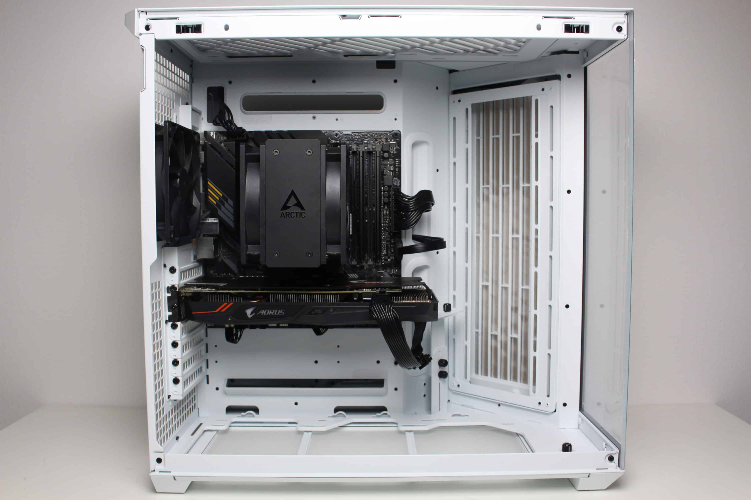 Selbst ein einzelner Lüfter am Heck reduziert die Maximaltemperaturen der Komponenten merklich. Durch den großen Innenraum und die wenig restriktiven Montagerahmen und Belüftungsöffnungen ist das Airflow-Potential des APNX V1 zudem riesig. Weiterhin eignet sich das V1 sowohl platztechnisch als auch optisch perfekt für den Einbau eine Custom-Wasserkühlung.