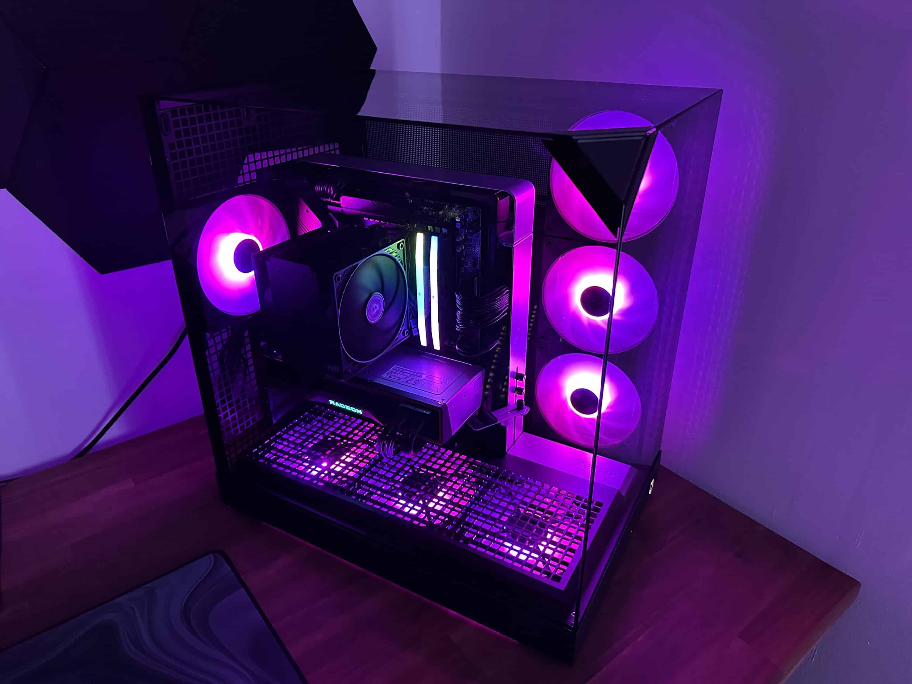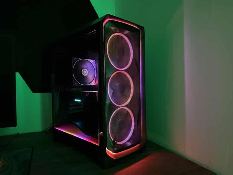 Im Praxistest bestätigt sich das Konzept: Die Kühlung arbeitet auch unter Last zuverlässig und hält CPU wie GPU auf einem alltagstauglich niedrigen Temperaturniveau. Dabei bleibt die Geräuschkulisse angenehm moderat, selbst ohne aggressives Lüftertuning. Hinzu kommen die wertigen FP3-Lüfter, die nicht nur durch eine starke Performance, sondern auch durch ihre lebendige ARGB-Beleuchtung punkten. Besonders das Beleuchtungsspiel der Bodenlüfter, das fast wie eine Unterbodenbeleuchtung wirkt, setzt das Gehäuse in Szene.