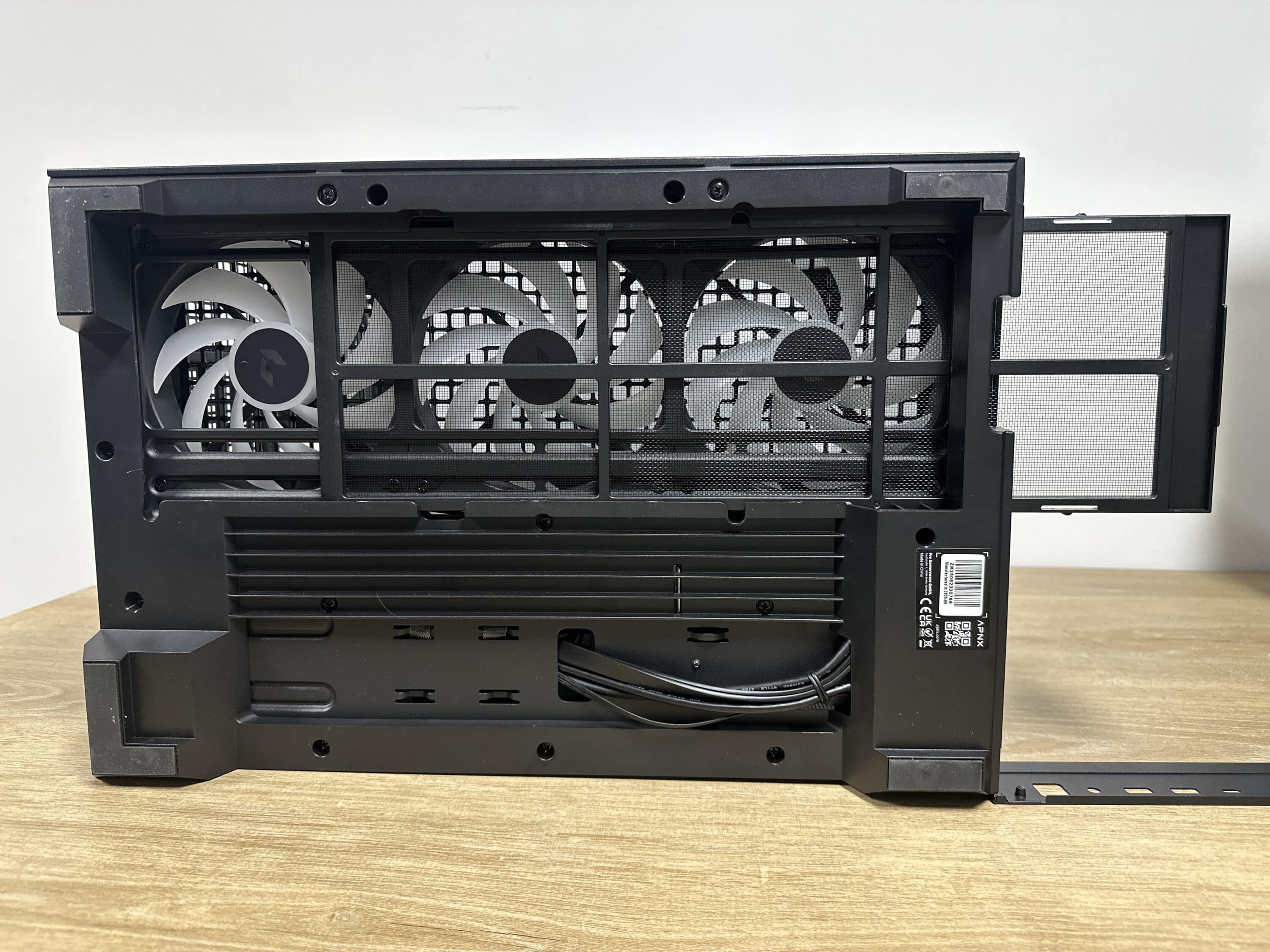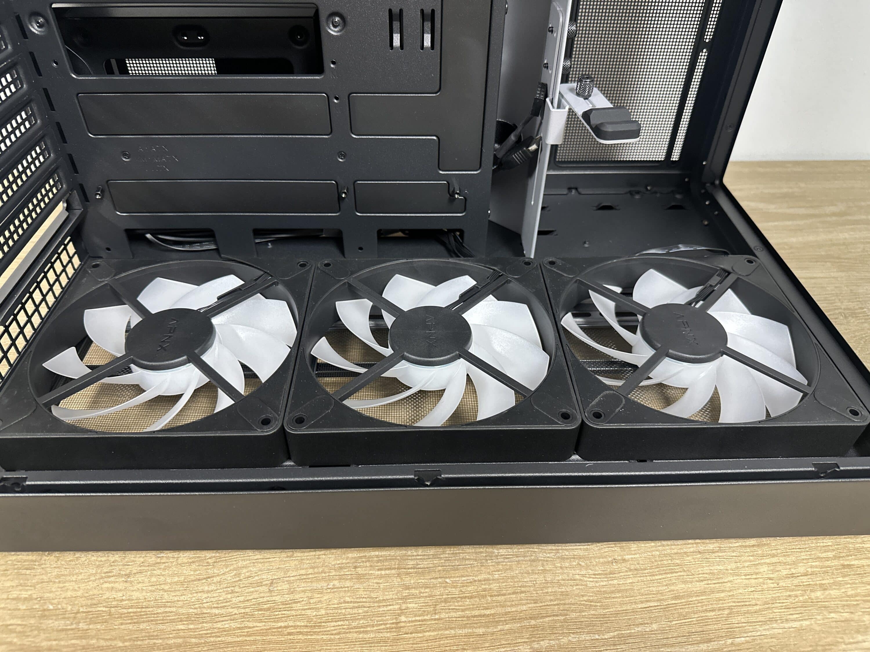 Im Praxistest zeigt das APNX V2, dass das großzügige Layout und die clevere Lüfterplatzierung echte Vorteile für den Airflow bringen. Der große Innenraum verhindert Engstellen, sodass die Luft ungehindert um alle Komponenten zirkulieren kann. Besonders die drei Lüfter am Boden sorgen für eine konstante Frischluftzufuhr, während ein Hecklüfter und drei seitlich verbaute Modelle zuverlässig die erwärmte Luft nach außen transportieren. Das Konzept geht auf: Es entsteht ein stabiler, gerichteter Luftstrom, der auch unter Belastung nicht abreißt.
