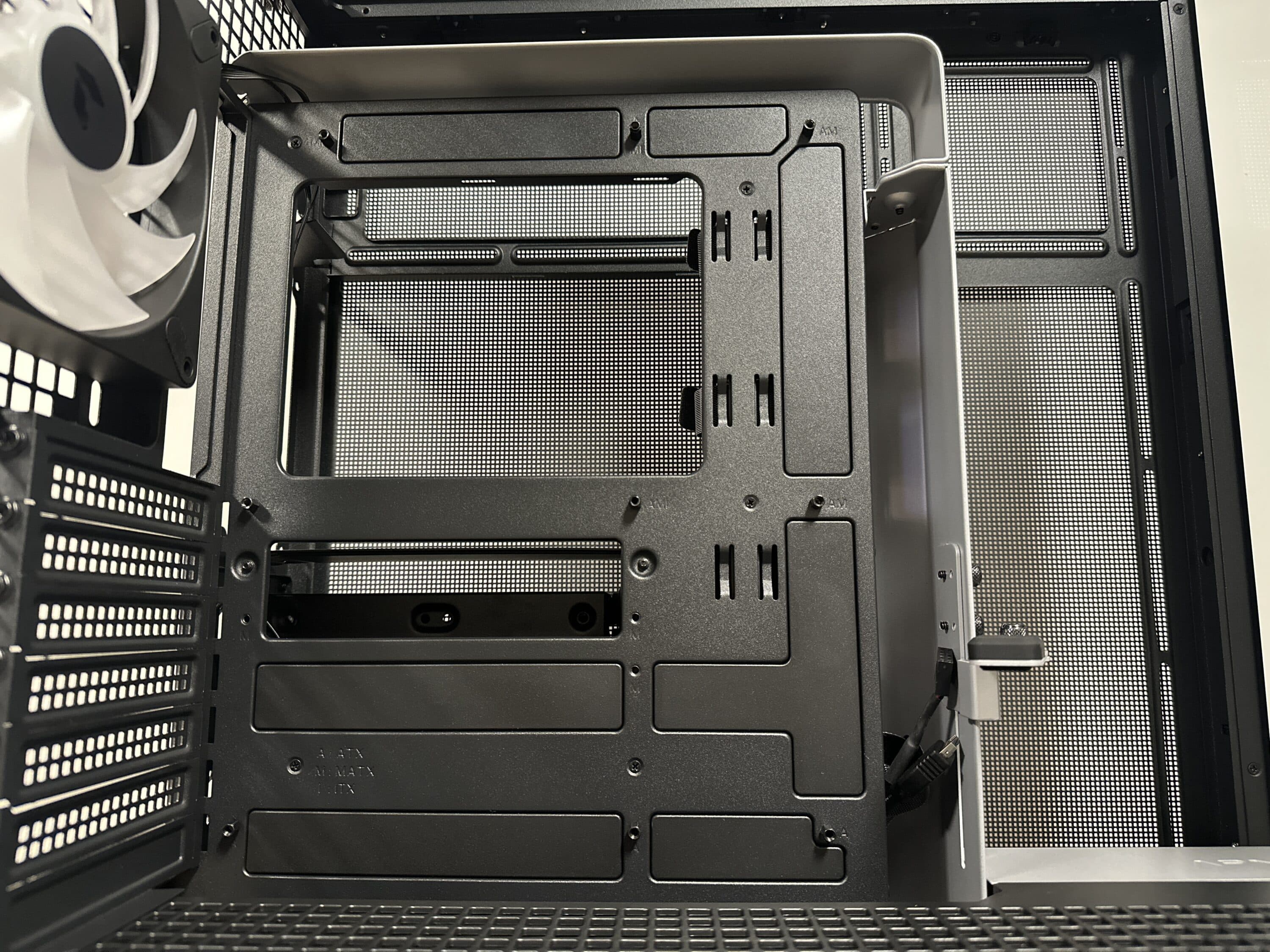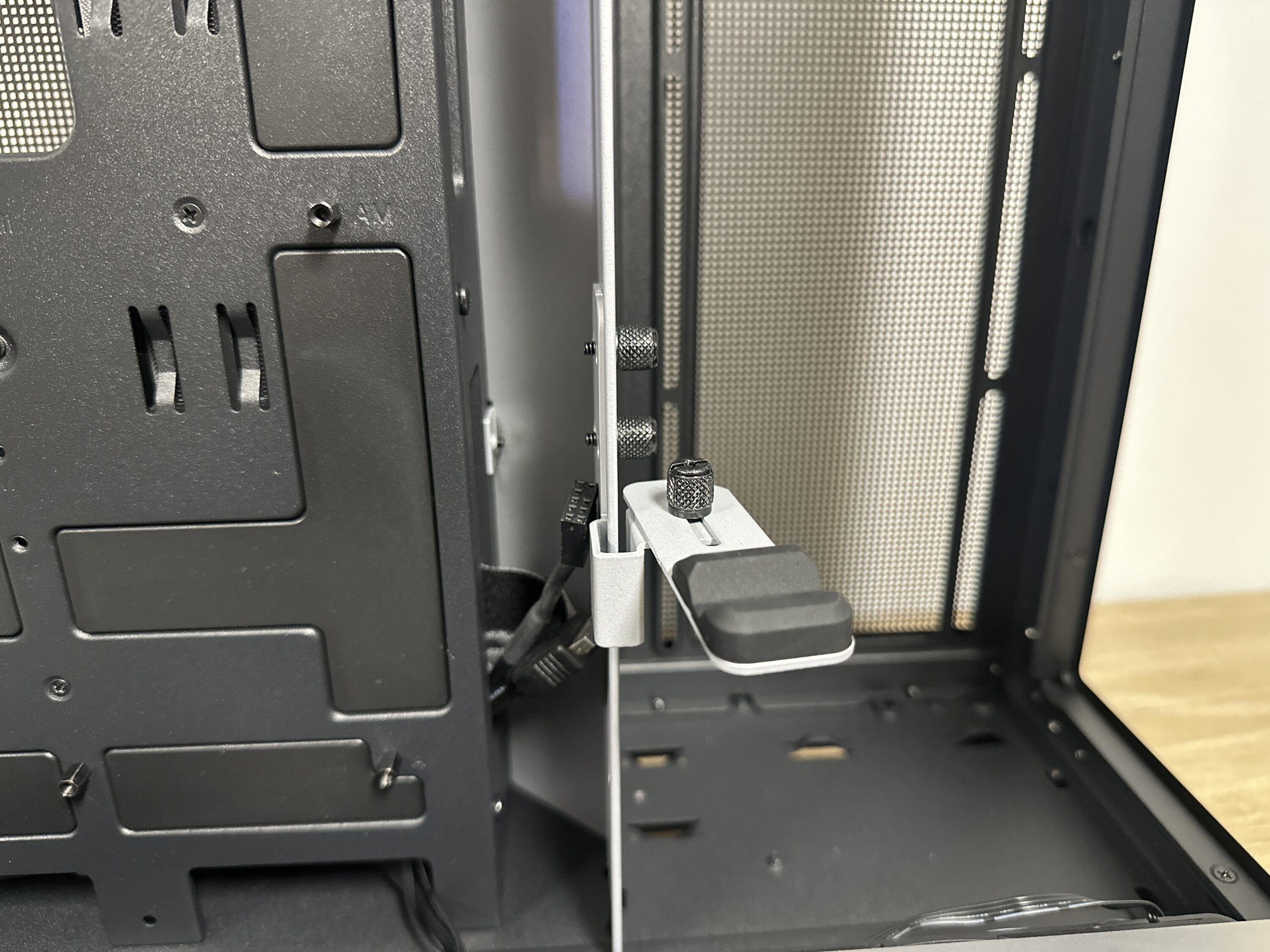 Auch beim Kabelmanagement zeigt sich das Gehäuse durchdacht. Mit einer Tiefe von 99 Millimetern auf der Rückseite und einem mitgelieferten ARGB-/PWM-Hub für bis zu zehn Geräte lässt sich die Verkabelung nicht nur sauber, sondern auch effizient umsetzen. Die modularen Trays für Netzteil und Festplatten erhöhen die Flexibilität und erlauben es, den Aufbau individuell an die eigenen Bedürfnisse anzupassen. Für zusätzliche Stabilität sorgt eine integrierte GPU-Halterung, die schwere Grafikkarten zuverlässig abstützt und damit ein Durchhängen verhindert.