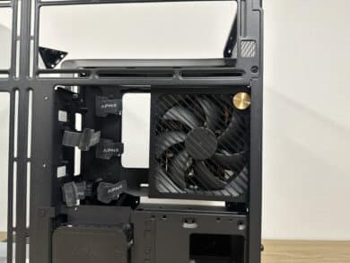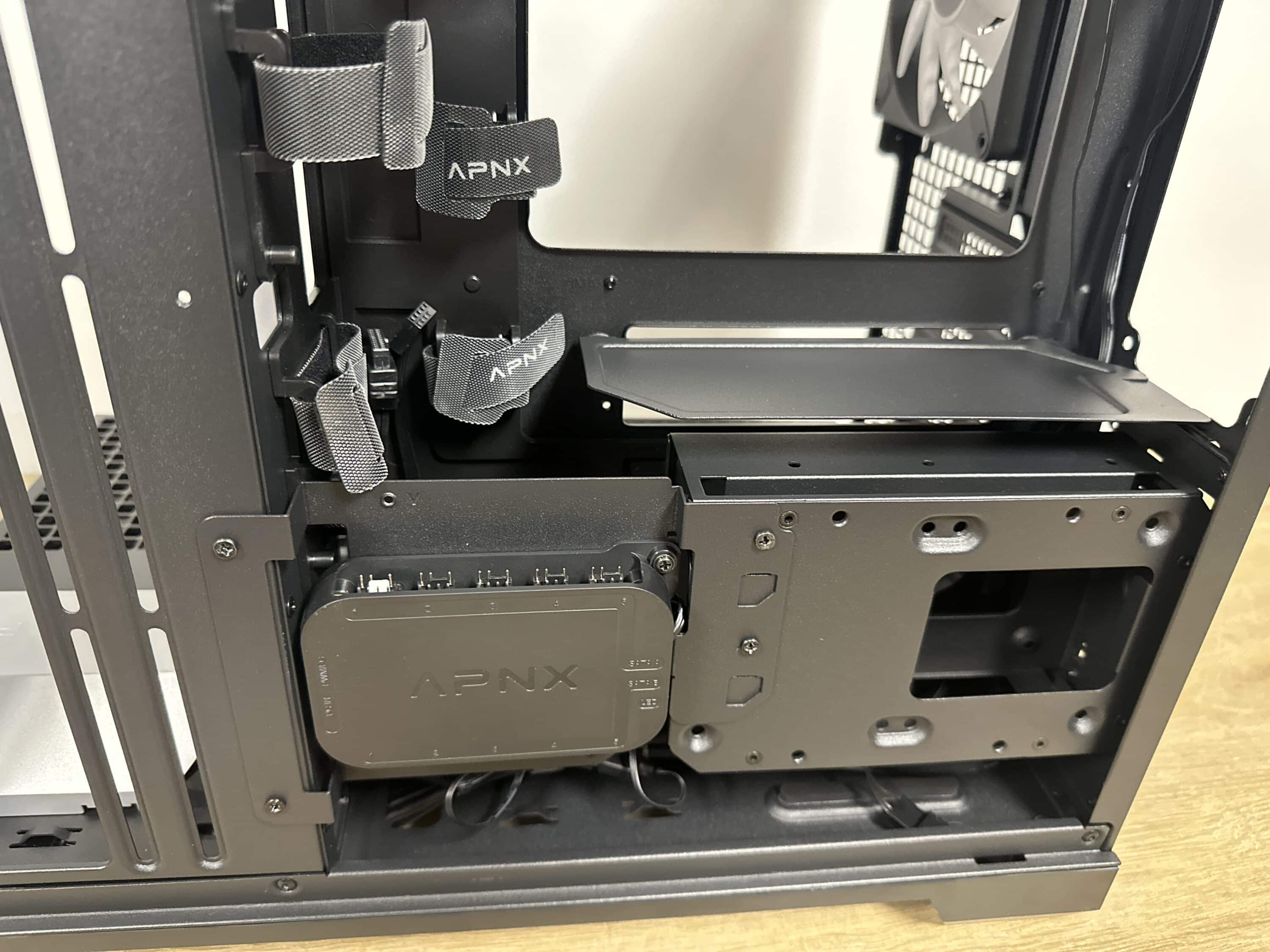 Der Einbau im APNX V2 gestaltet sich ausgesprochen komfortabel. Dank des großzügigen Innenraums lassen sich selbst großformatige Komponenten problemlos montieren, ohne dass es zu Engpässen kommt. Grafikkarten können bequem eingesetzt werden, wobei die integrierte Halterung für zusätzlichen Halt sorgt und das typische „Sagging“ schwerer Modelle zuverlässig verhindert. Auch massive Tower-Kühler oder lange Netzteile finden ohne Einschränkungen Platz.
