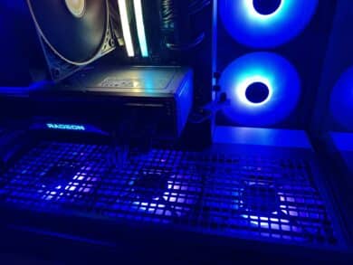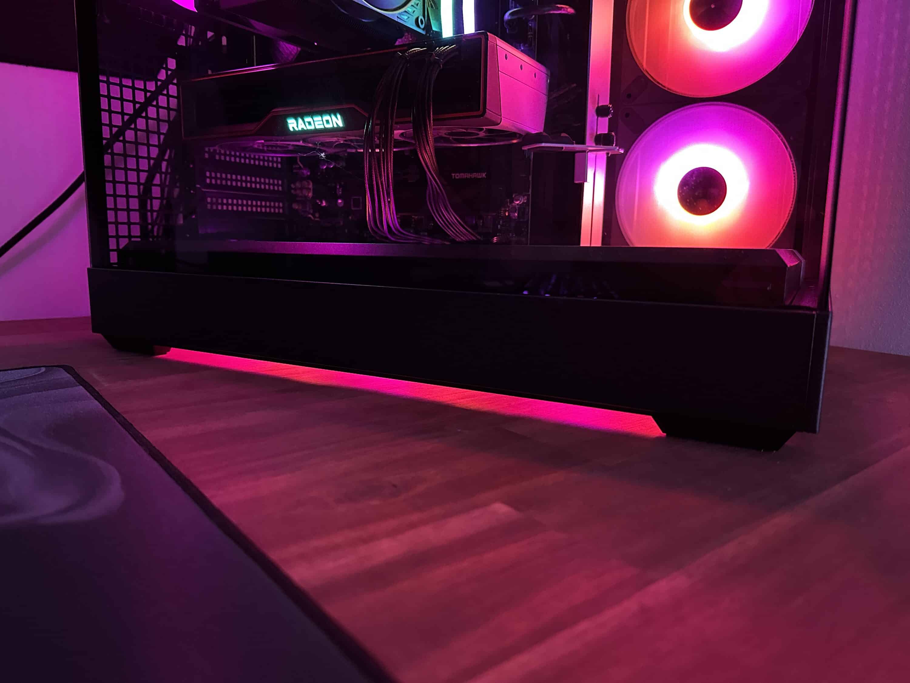 Auch die Beleuchtung weiß zu überzeugen. Die ARGB-Effekte der FP3-Lüfter sind satt, kräftig und wirken sehr lebendig, ohne dabei ins Übertriebene abzudriften. Besonders positiv fällt das Zusammenspiel mit dem Gehäuse auf: Die drei am Boden verbauten Lüfter beleuchten nicht nur die Hardware im Inneren, sondern erzeugen gleichzeitig einen subtilen Effekt auf der Unterseite des Gehäuses. Diese indirekte Lichtwirkung erinnert beinahe an eine Unterbodenbeleuchtung bei einem Auto und verleiht dem V2 eine auffällige, aber stilvolle optische Note.