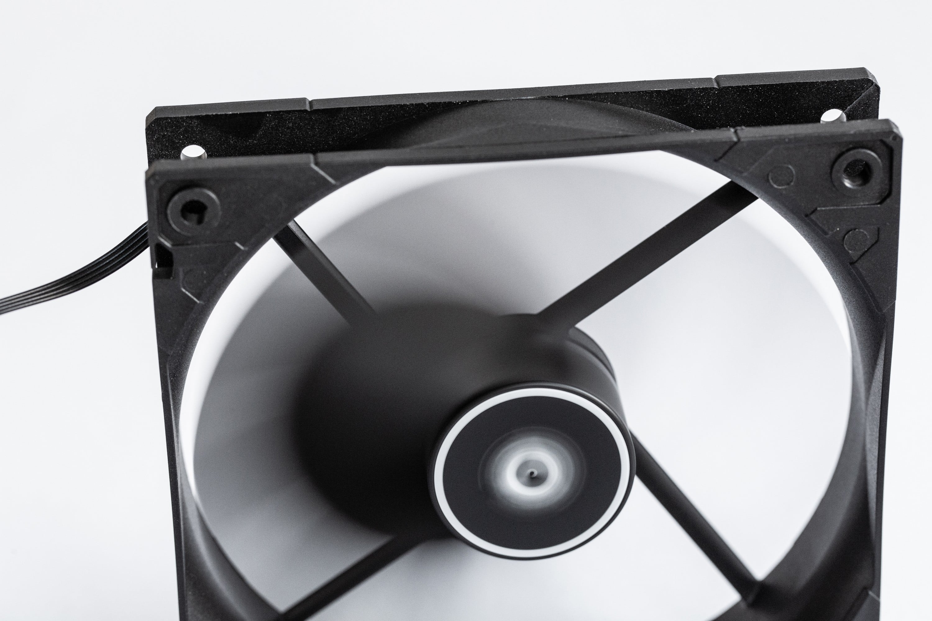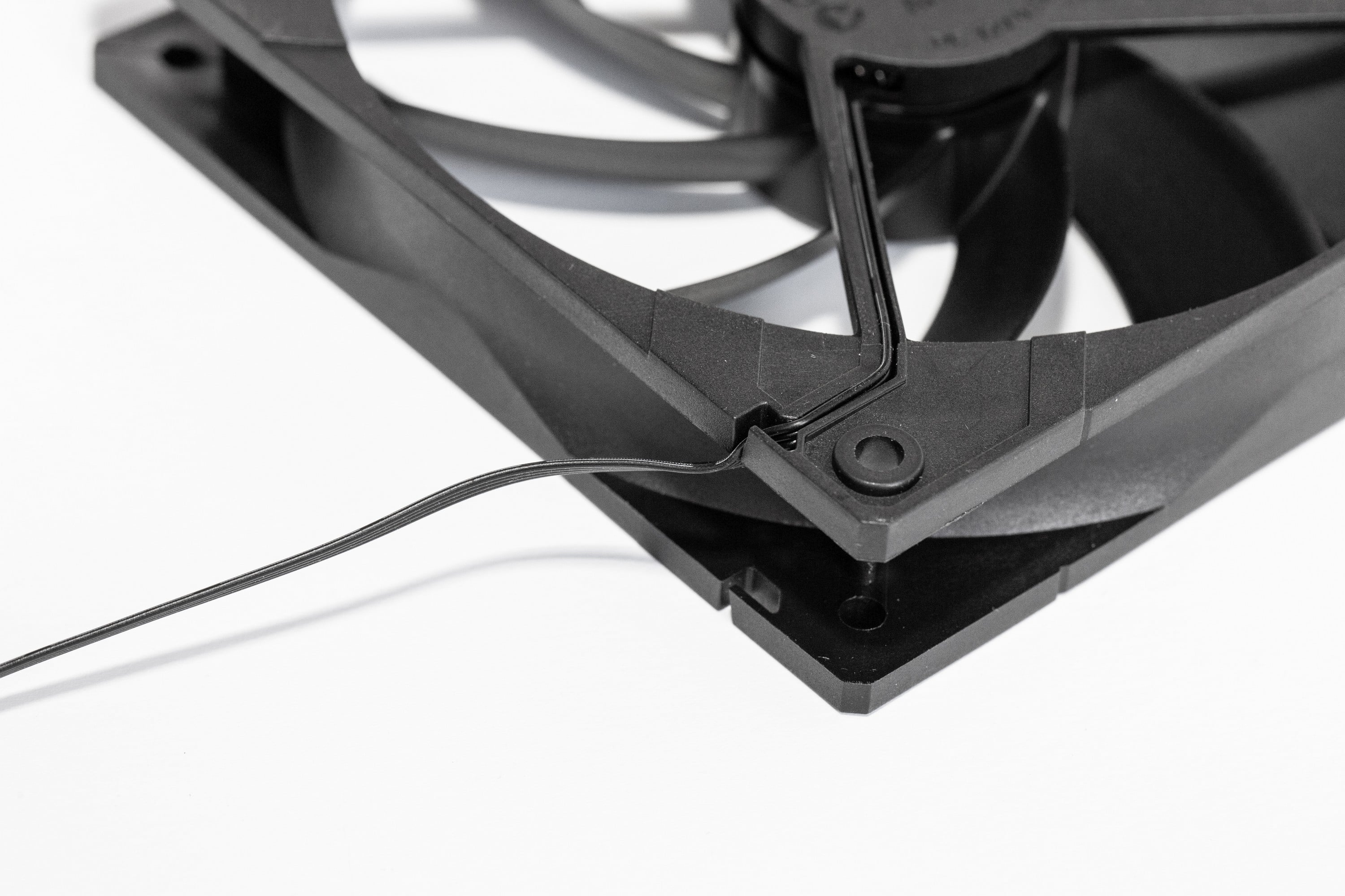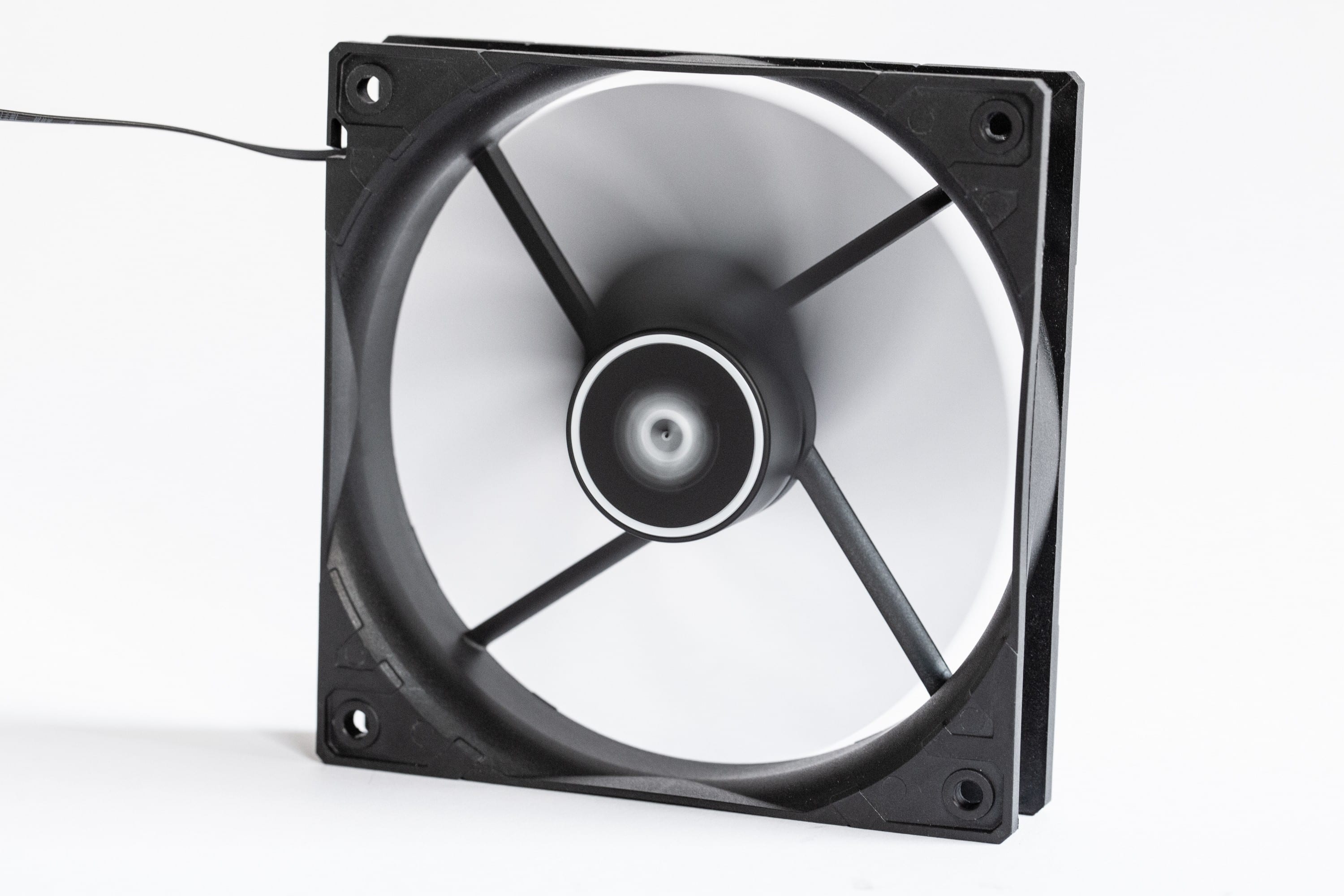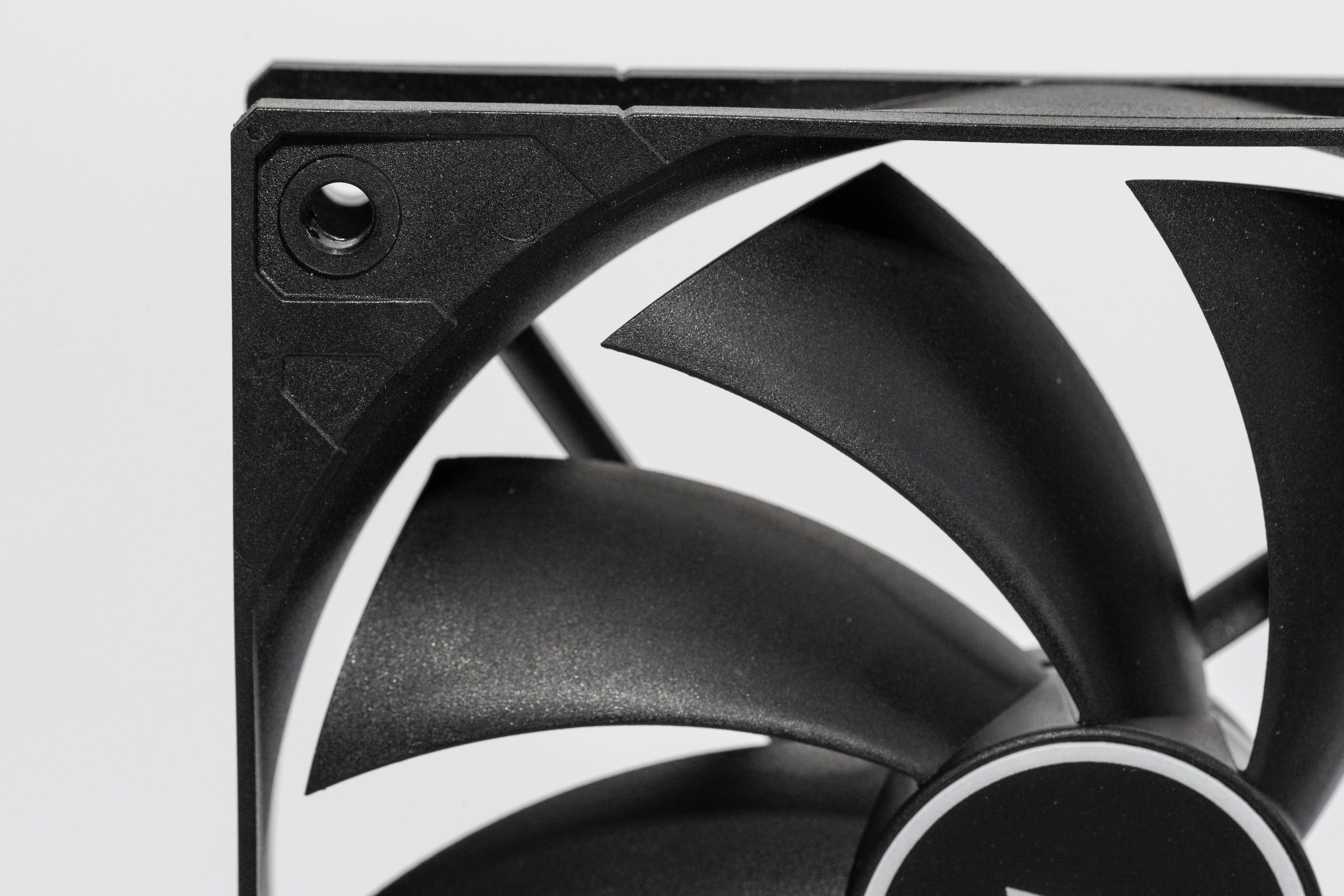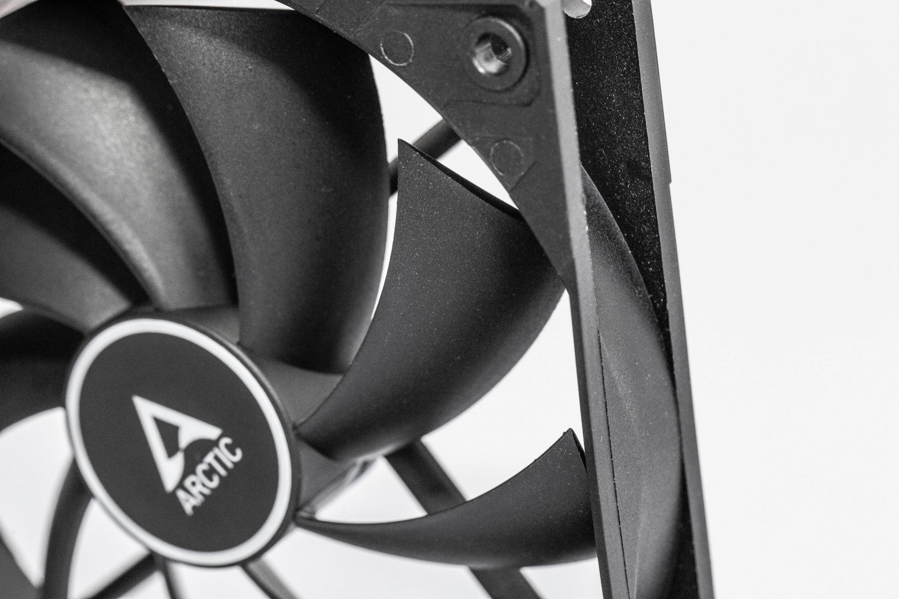 Ansonsten ist der Arctic F12 PWM PST unspektakulär. Er entspricht dem, was man sich unter „günstiger Computerlüfter“ vorstellt. Der Rahmen besteht aus schwarzen Kunststoff, wie auch die Lüfterblätter. Es gibt keine vibrationsdämpfenden Gummi-Flächen in den Ecken und der Eindruck wird auch durch das geringe Gewicht betont. Die Kanten des Kunststoffs sind allerdings sauber verarbeitet; es gibt keine Grate oder scharfen Stellen. Der Abstand der Lüfterblätter zum Rahmen ist relativ groß, aber die Drehung der Lüfterblätter läuft ruhig und fühlt sich solide an.