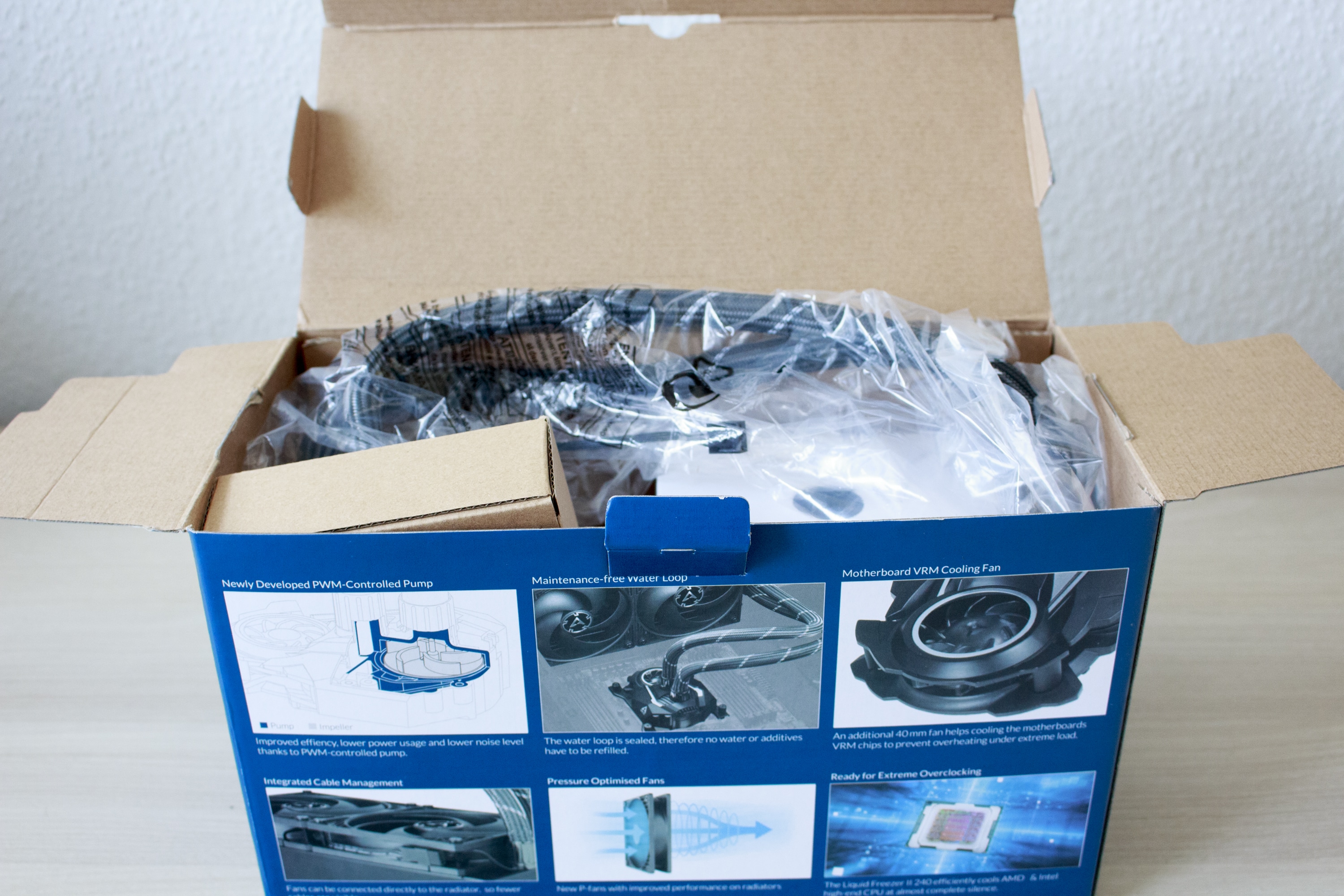 Die Liquid Freezer II 240 kommt in einem erstaunlich kompakten Karton aus Pappe. Dieser ist farbig bedruckt und enthält alle technischen Informationen und eine Auflistung der Key-Features dieser Kompaktwasserkühlung. Alle Angaben sind in englischer Sprache verfasst.