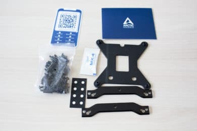 Packt man den Inhalt des Kartons aus, dann findet man die AiO inkl. vormontierter Lüfter, einen Beutel mit sämtlichem Montagezubehör (Schrauben, Backplate, Abstandshalter, Bügel, Wärmeleitpaste), eine Garantie-Broschüre und eine QR-Code für die Montage-Anleitung. Um Radiator, Pumpe und die Lüfter vor jeglichen Beschädigungen zu schützen, sind alle Komponenten von Folie und Pappe umhüllt.