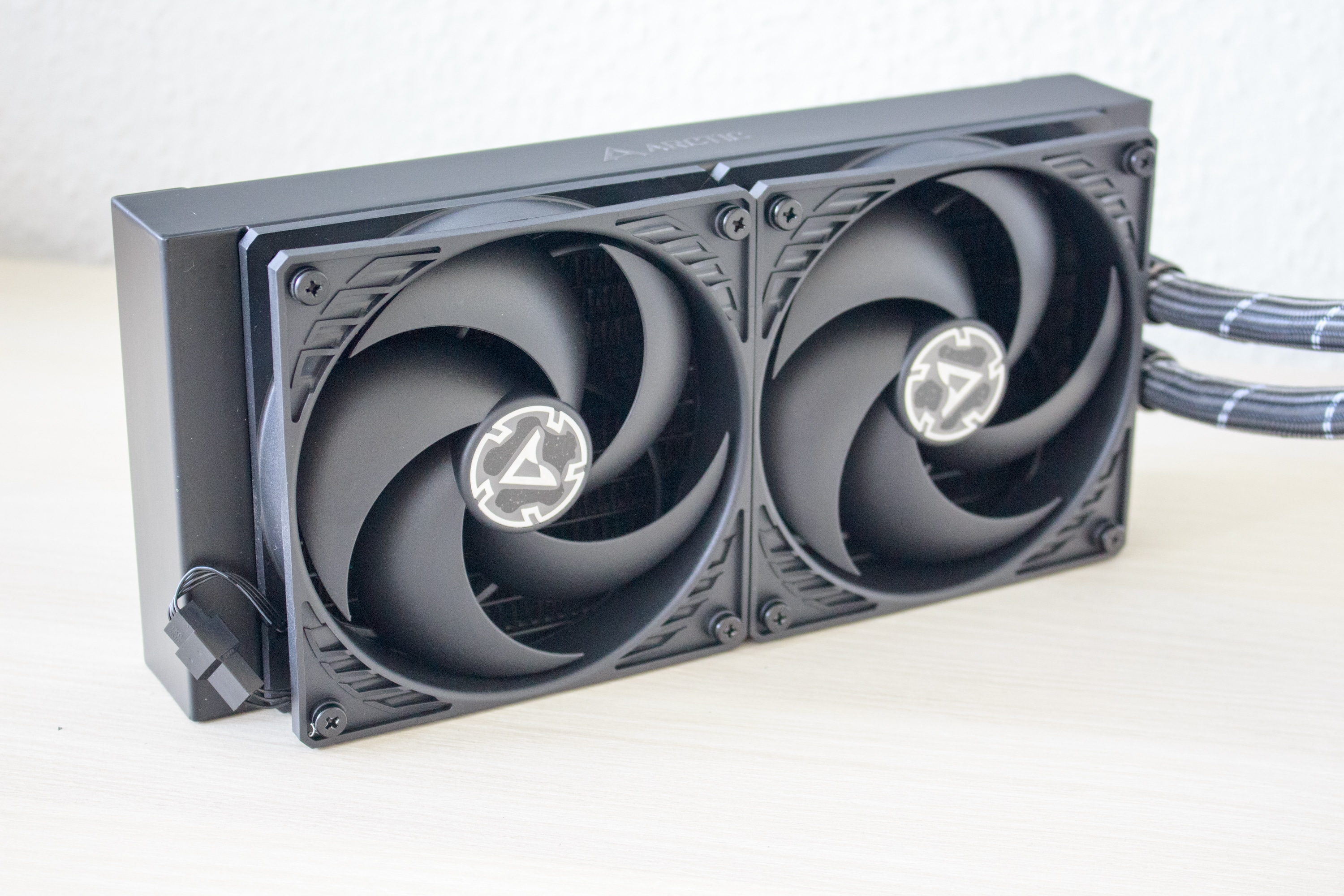 Die zwei mitgelieferten Lüfter der Arctic P120 PWM Serie sind komplett schwarz gehalten und sind für einen hohen Luftdruck optimiert. Beide Lüfter verfügen über einen 4-Pin-PWM-Anschluss und drehen mit maximal 1800 Umdrehungen pro Minute. Um Kabelsalat zu vermeiden, sind beide direkt mit dem PWM-Anschluss der Pumpe verbunden und müssen nicht separat angeschlossen werden. Die Kabel verschwinden direkt zwischen Sleeve und dem Wasserschlauch. Das erspart das Kabelmanagement beim Einbau der AiO in ein Gehäuse und alle beweglichen Teile der AiO (3x Lüfter, 1x Pumpe) können über einen einzigen PWM-Anschluss angesteuert werden.