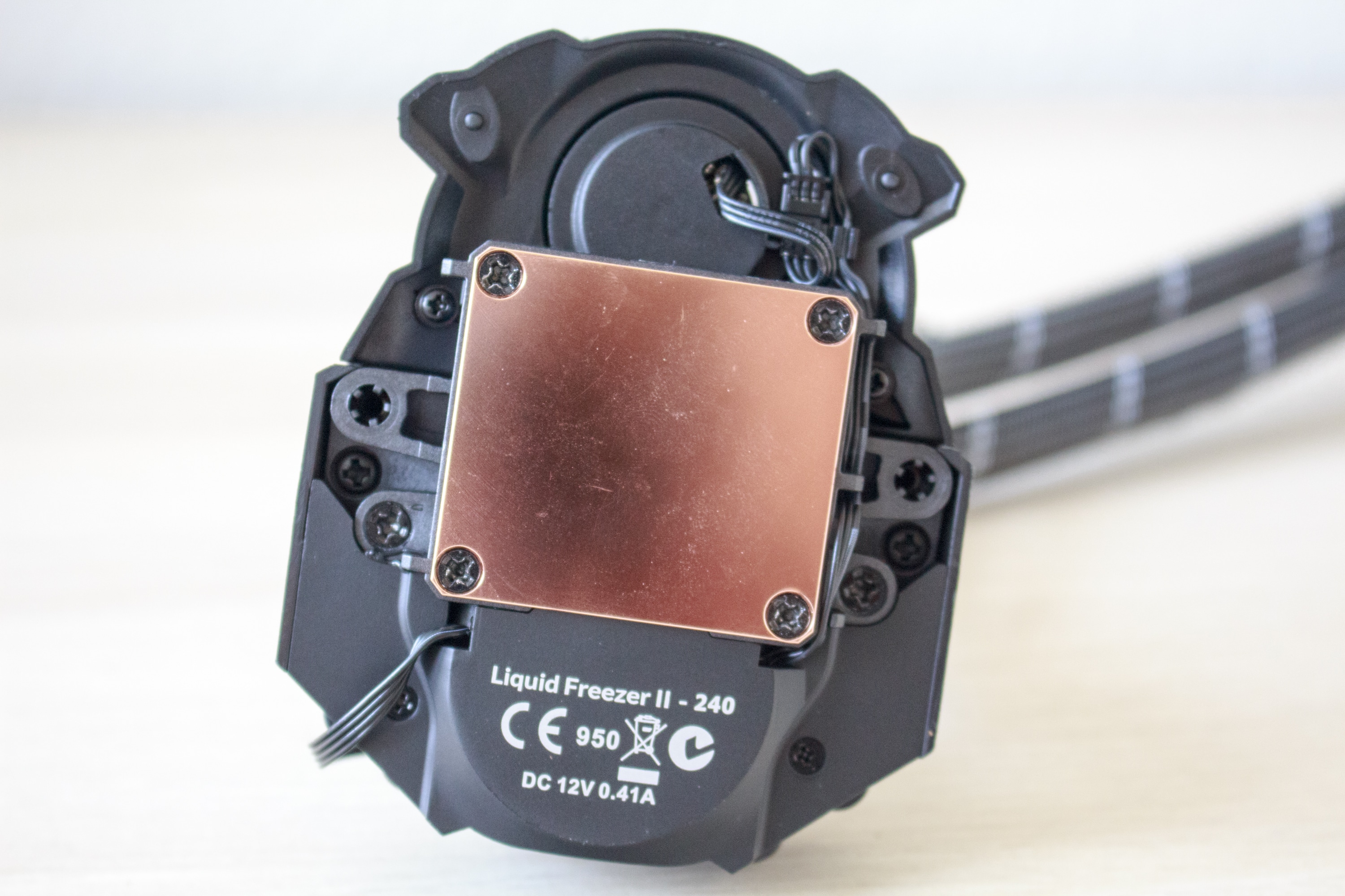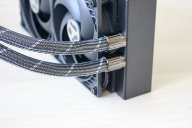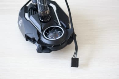 Am Radiator hat Arctic mit zwei silbernen Verschlüssen zwei gesleevte Wasserschläuche befestigt. Die Schläuche sind 450 Millimeter lang und dezent in grau und weiß gestaltet. Am anderen Ende der Schläuche befindet sich natürlich der Pumpenblock. Die darin verbaute Pumpe dreht mit maximal 2000 Umdrehungen pro Minute und verfügt über eine Bodenplatte aus Kupfer. Der Pumpendeckel besteht aus Kunststoff und verfügt nicht über ein digitales Display oder RGB-Beleuchtung. Dafür findet sich hier aber ein Lüfter zur Kühlung der Spannungswandler auf dem Mainboard. Der Lüfter hat einen Durchmesser von 40 Millimetern und dreht mit maximal 3000 Umdrehungen pro Minute.