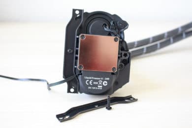 Die Montage der AiO-Wasserkühlung benötigte bei unserem Testsystem mit AM4-Sockel nur wenig Teile und war schnell erledigt. Zuerst muss der Radiator inklusive der Lüfter mit dem Gehäuse verbunden werden. Dieser Schritt fällt, aufgrund der Verwendung eines Benchtables, in diesem Fall weg. Anschließend muss die Pumpe für die Montage vorbereitet werden. Dazu wird diese von der Unterseite mit zwei Haltebügeln versehen. Danach müssen die oberen Kunststoff-Bügel des AMD-Rententionmoduls entfernt werden. Die Backplate des Retentionmoduls verbleibt hinter dem Mainboard.