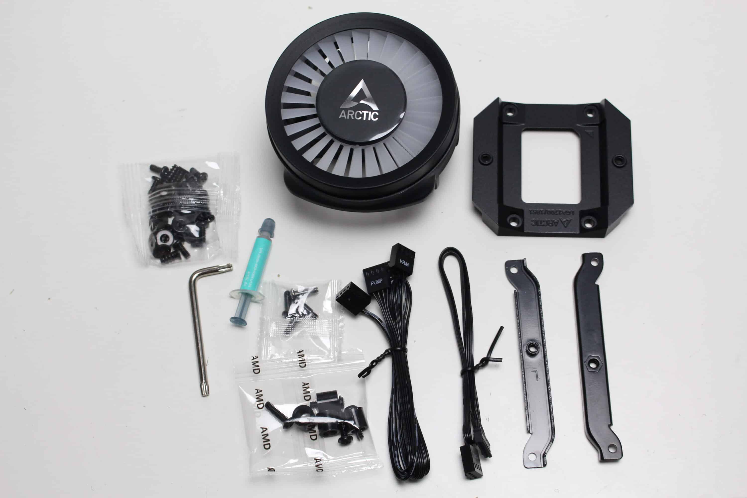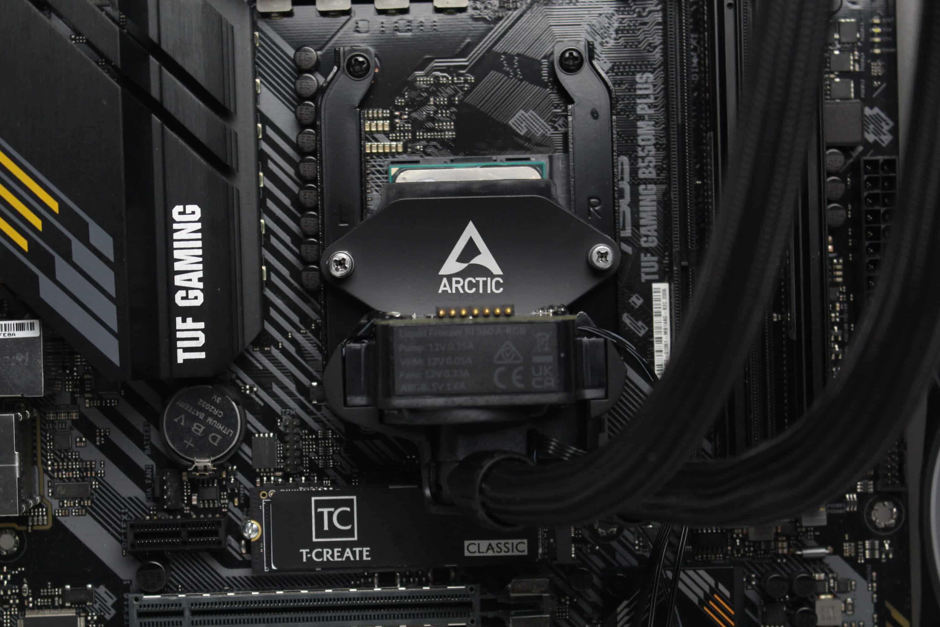 Ein genauer Blick auf die montierte Pumpe offenbart zudem, dass diese bei einem AMD-Sockel leicht nach unten versetzt ist. Hintergrund ist hier, dass bei AMD-CPUs der Temperatur-Hotspot aufgrund deren Chip-Anordnung etwas unterhalb des Zentrums des Heatspreaders zu finden ist. Dieser Versatz soll somit eine bessere Kühlung ermöglichen, da der Pumpenblock mittig über dem Hotspot platziert werden kann. Wichtig ist nur, dass man die Bügel nicht falschherum montiert, da ansonsten nur der obere Teil der CPU abgedeckt wird. Außerdem könnte es, je nach Mainboard und der eingesetzten m.2-Kühlkonsturktionen, zu Kompatibilitätsproblemen kommen. Eine entsprechende Liste stellt Arctic aber zur Verfügung.